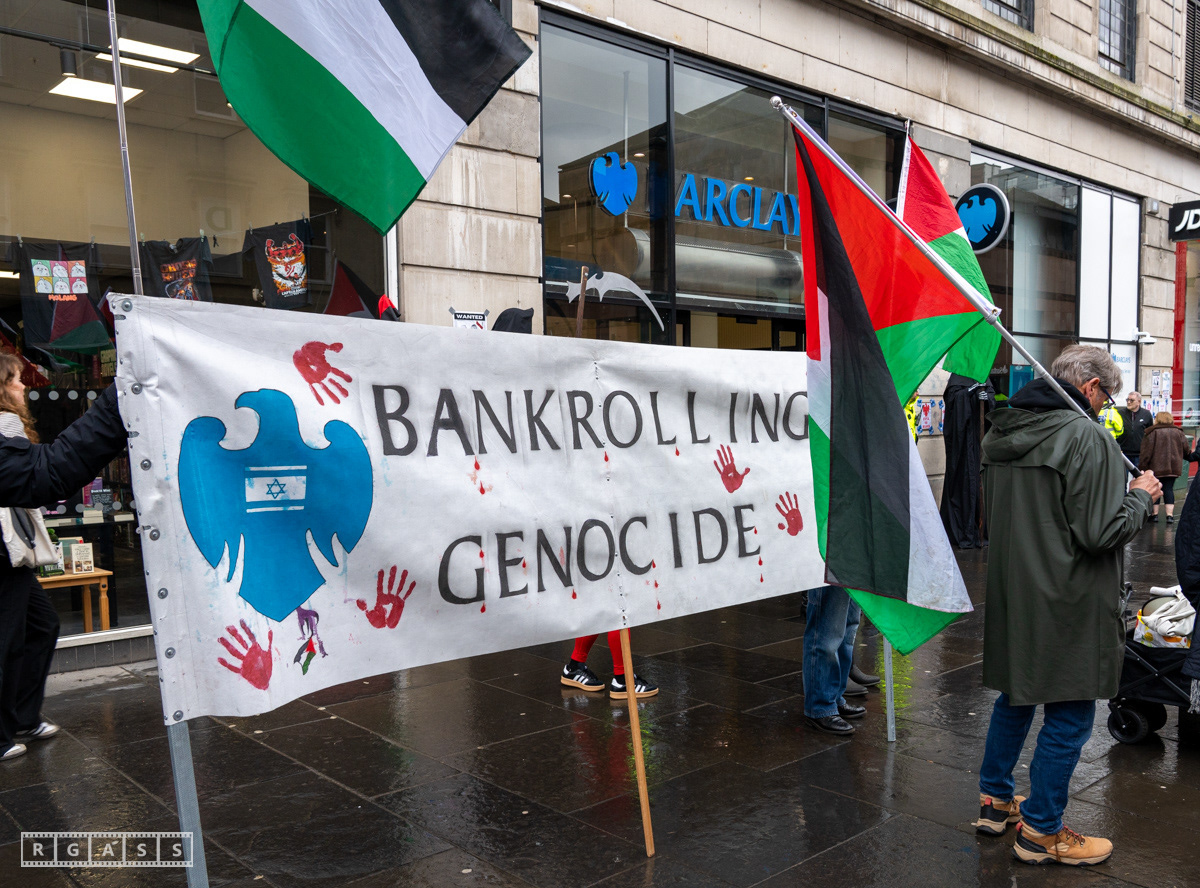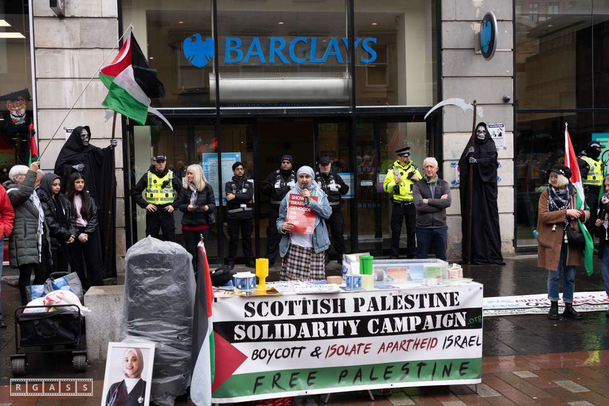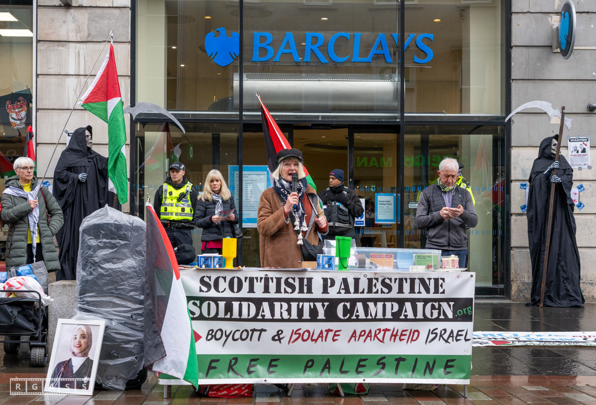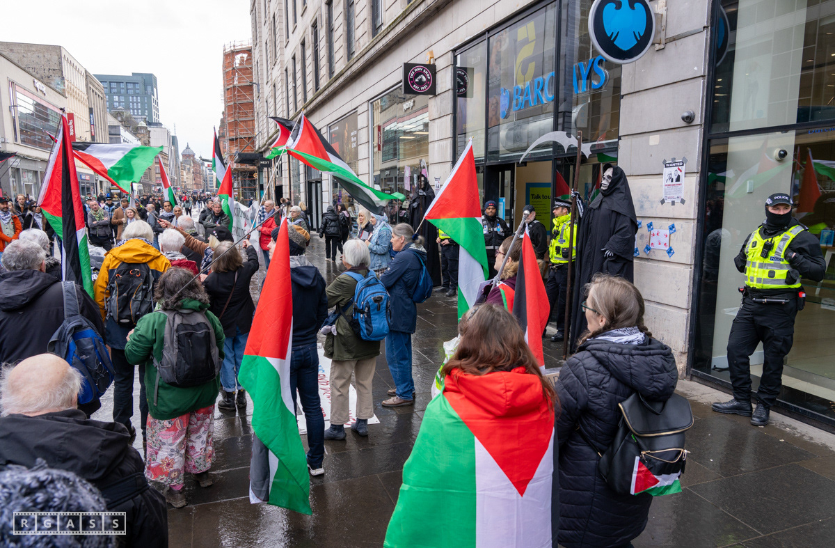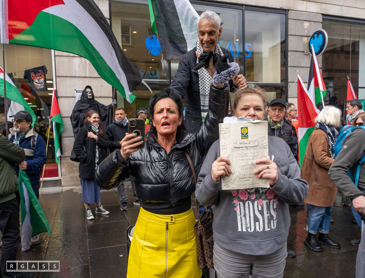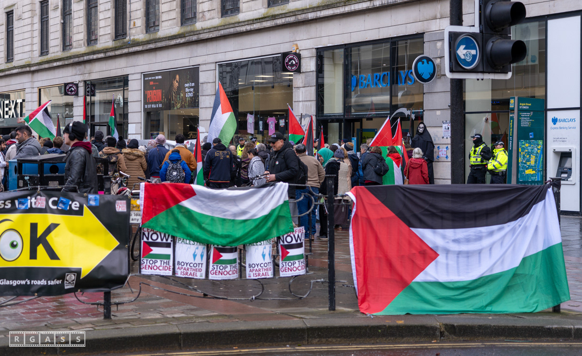 Glasgow uk. 22 March 2025. Pro-Palestine supporters at the weekly protest outside Barclays Bank on Argyll Street Glasgow