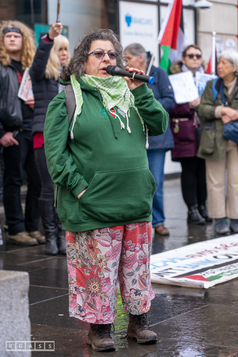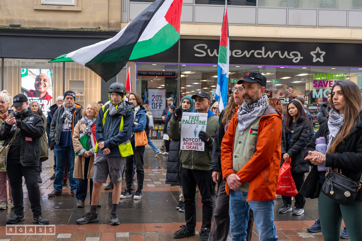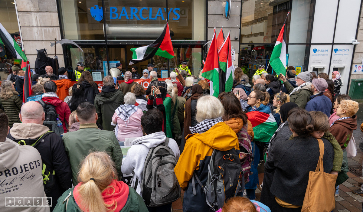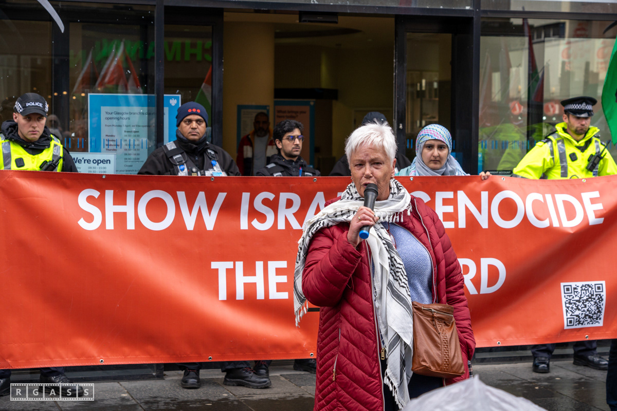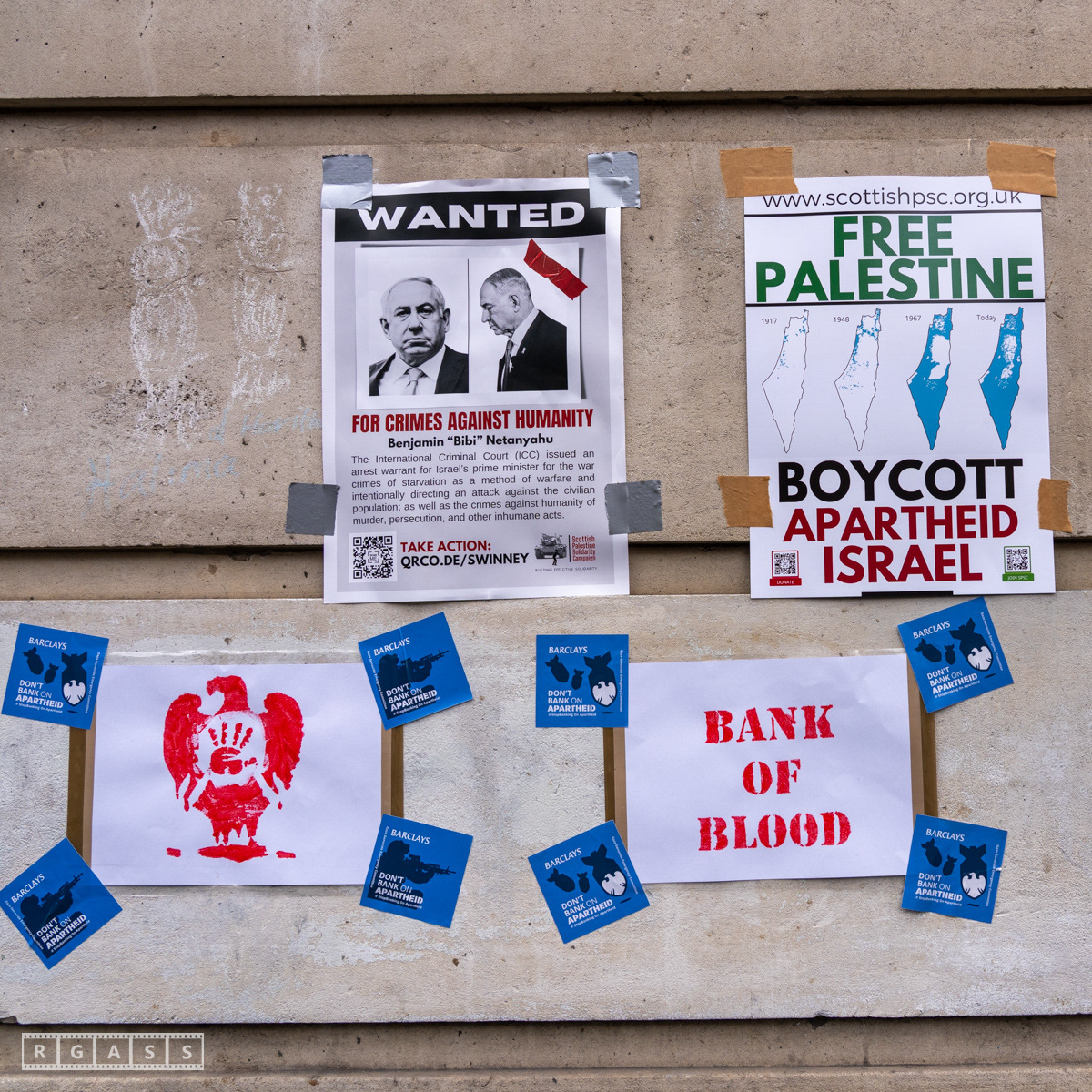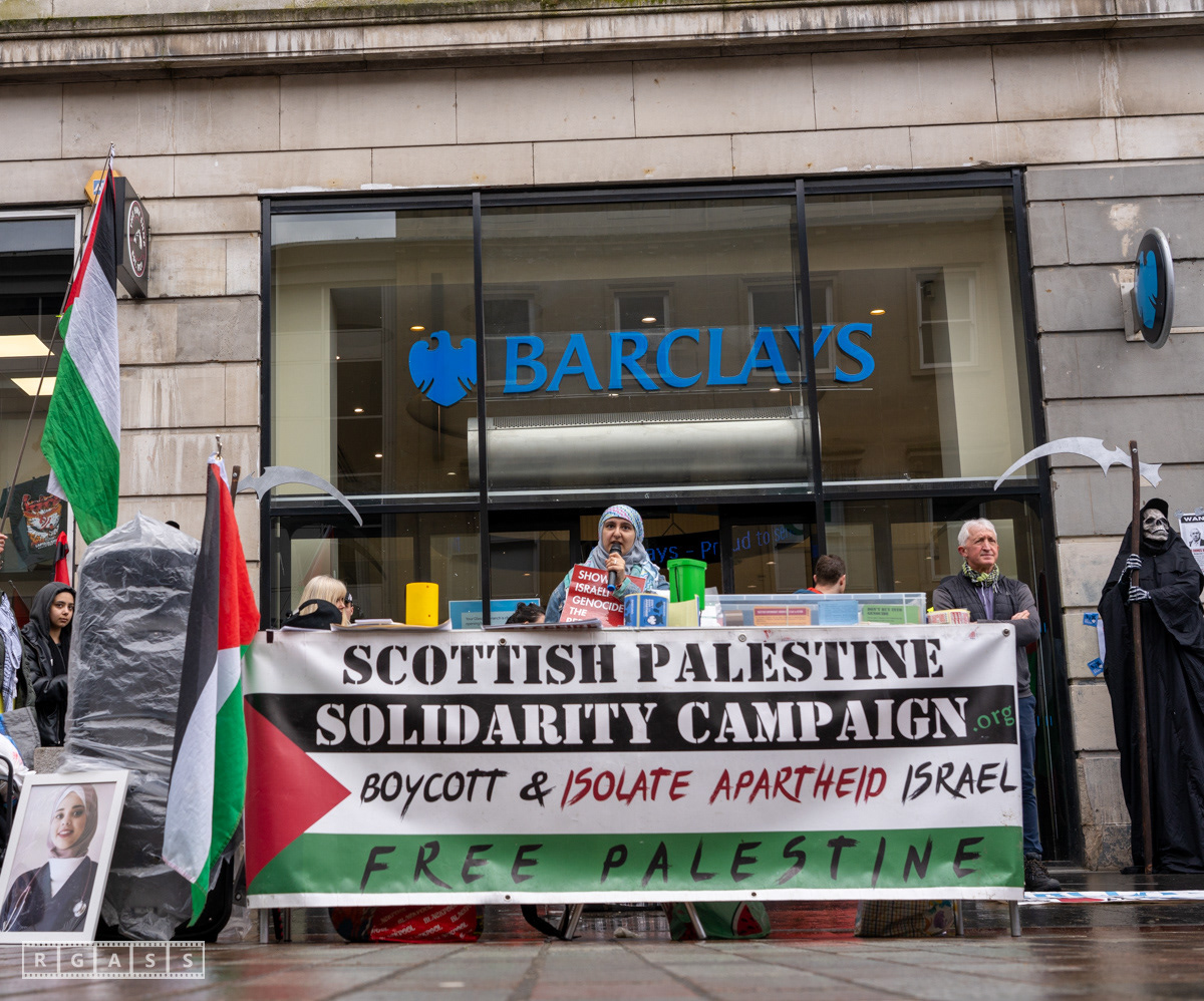 Glasgow uk. 22 March 2025. Pro-Palestine supporters at the weekly protest outside Barclays Bank on Argyll Street Glasgow