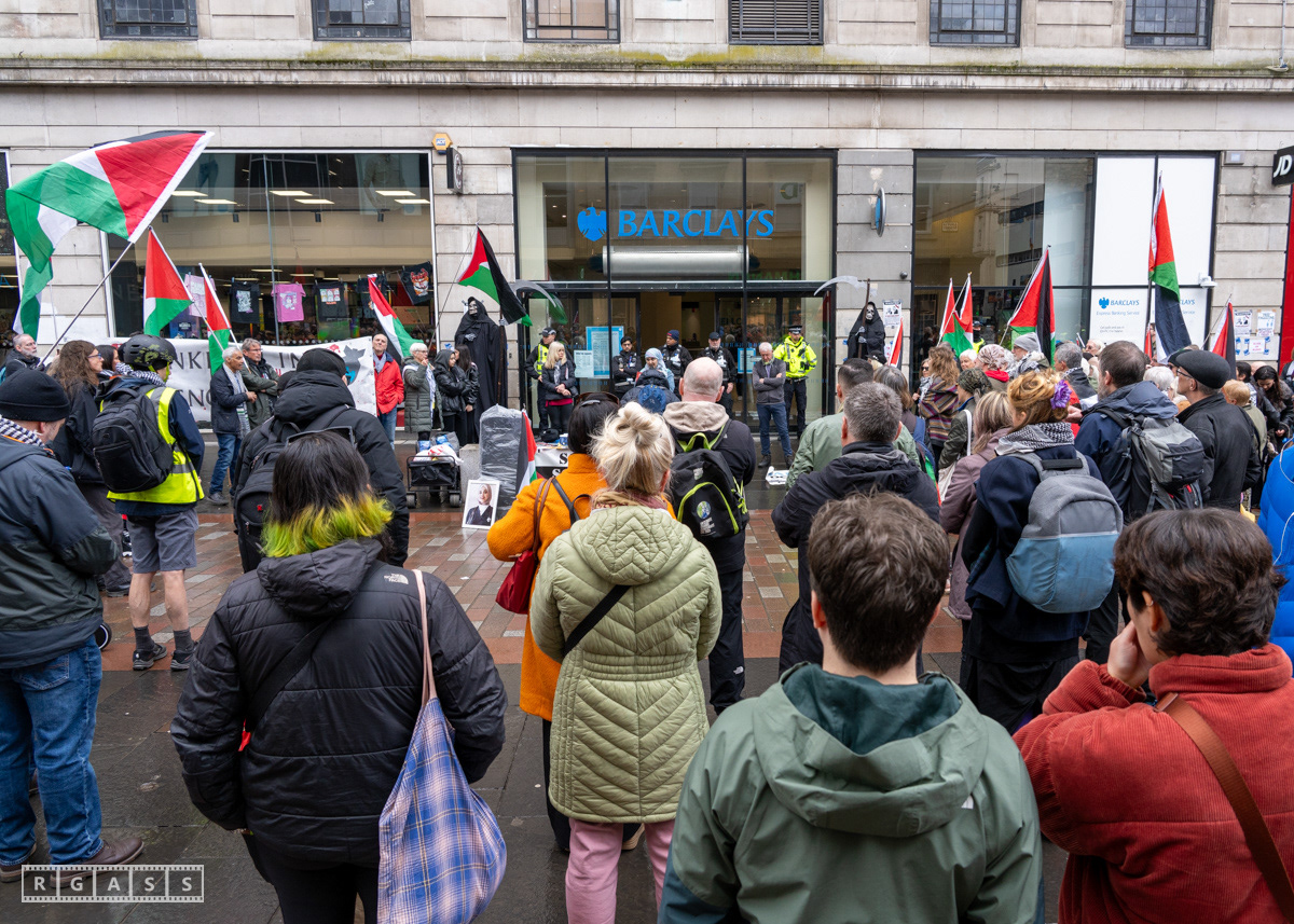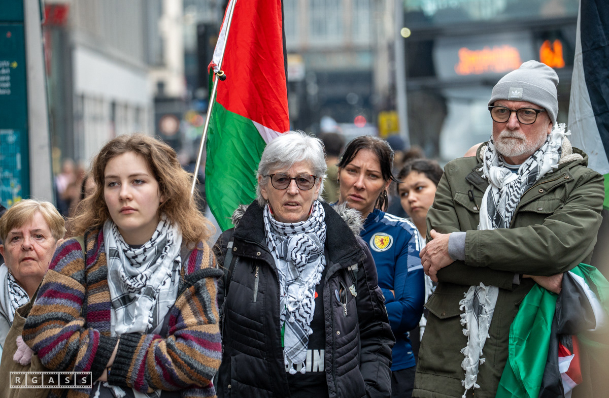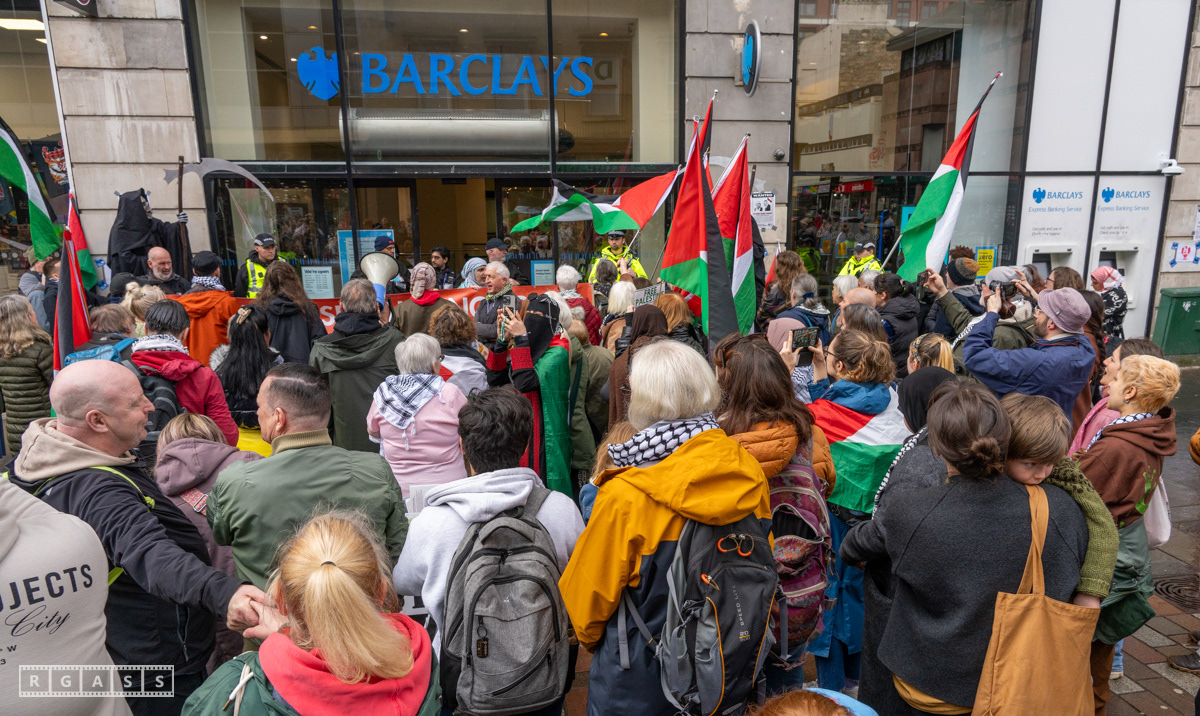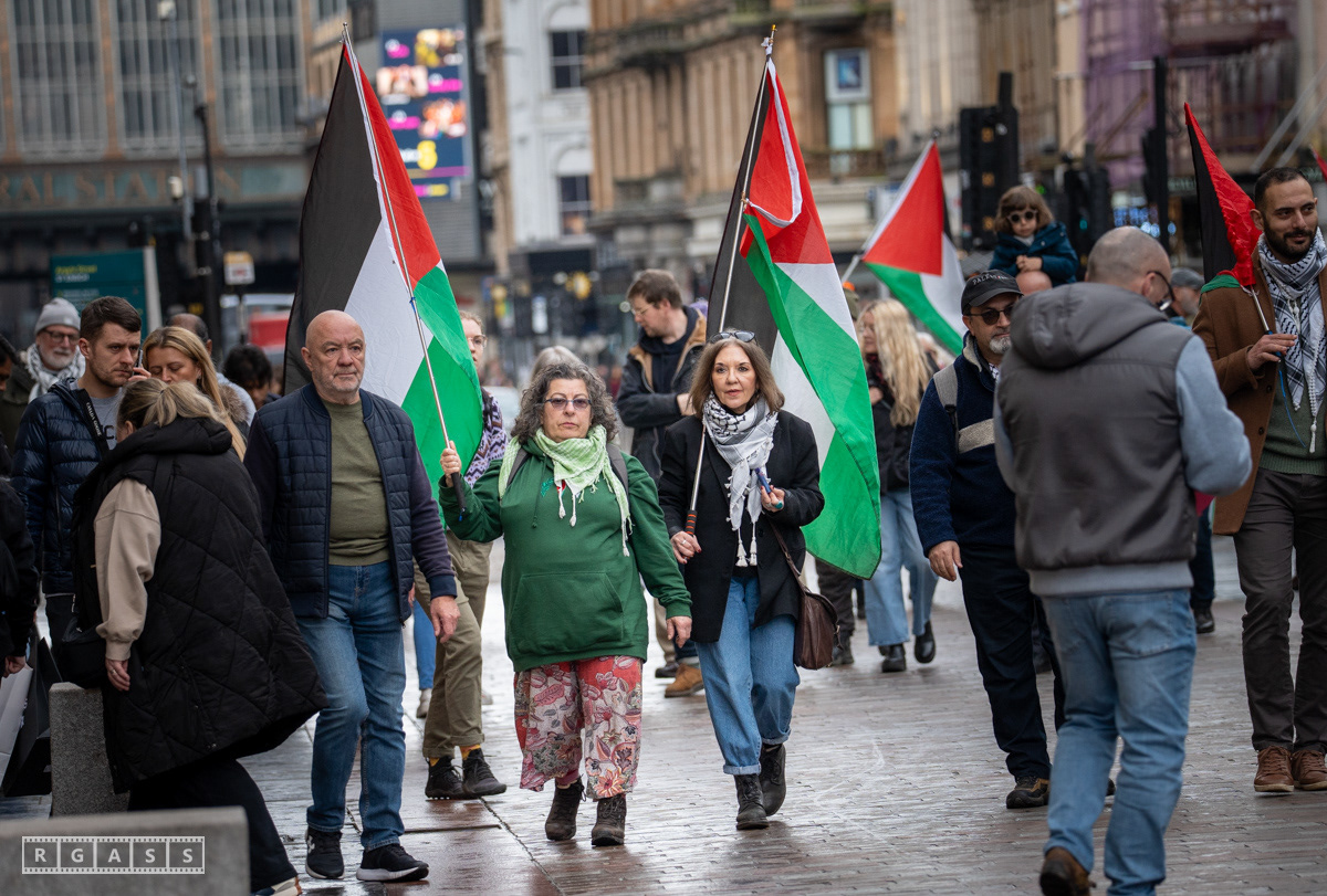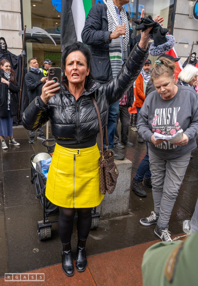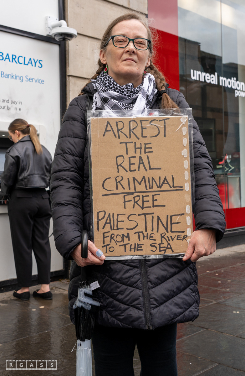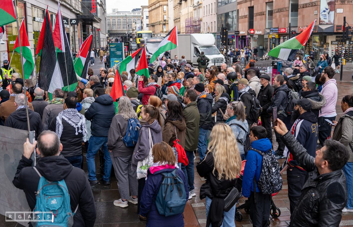 Glasgow uk. 22 March 2025. Pro-Palestine supporters at the weekly protest outside Barclays Bank on Argyll Street Glasgow