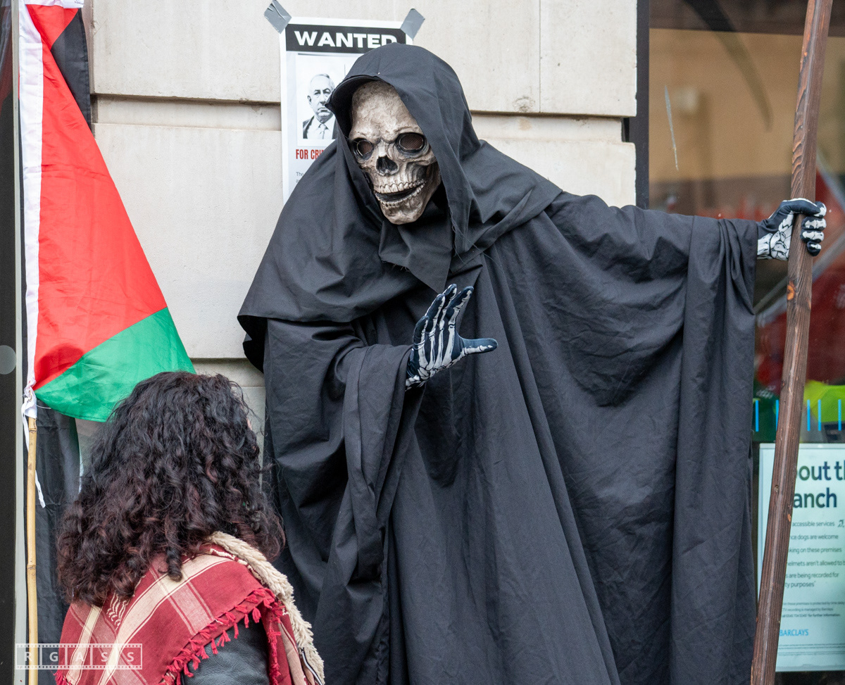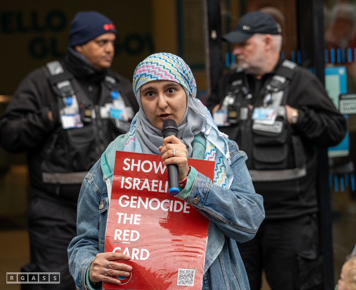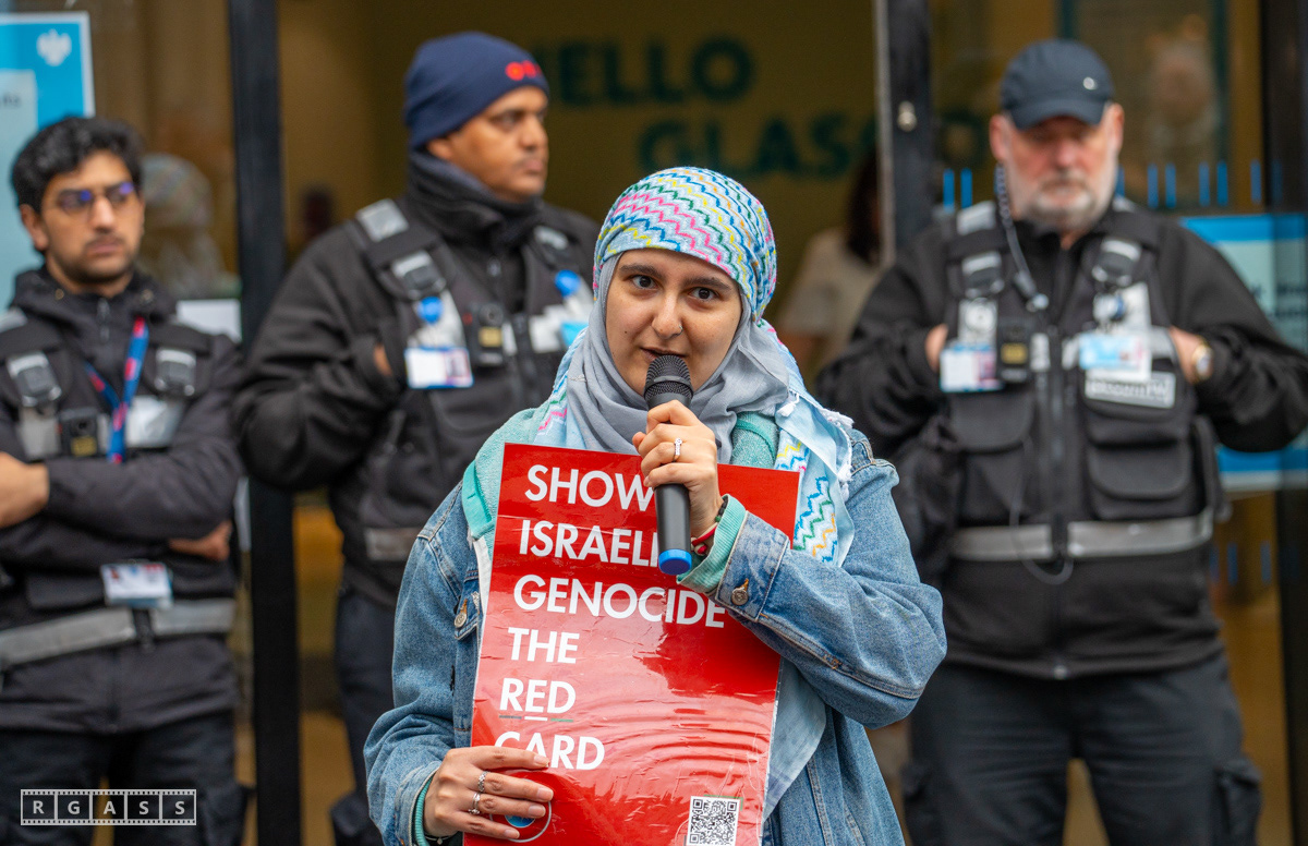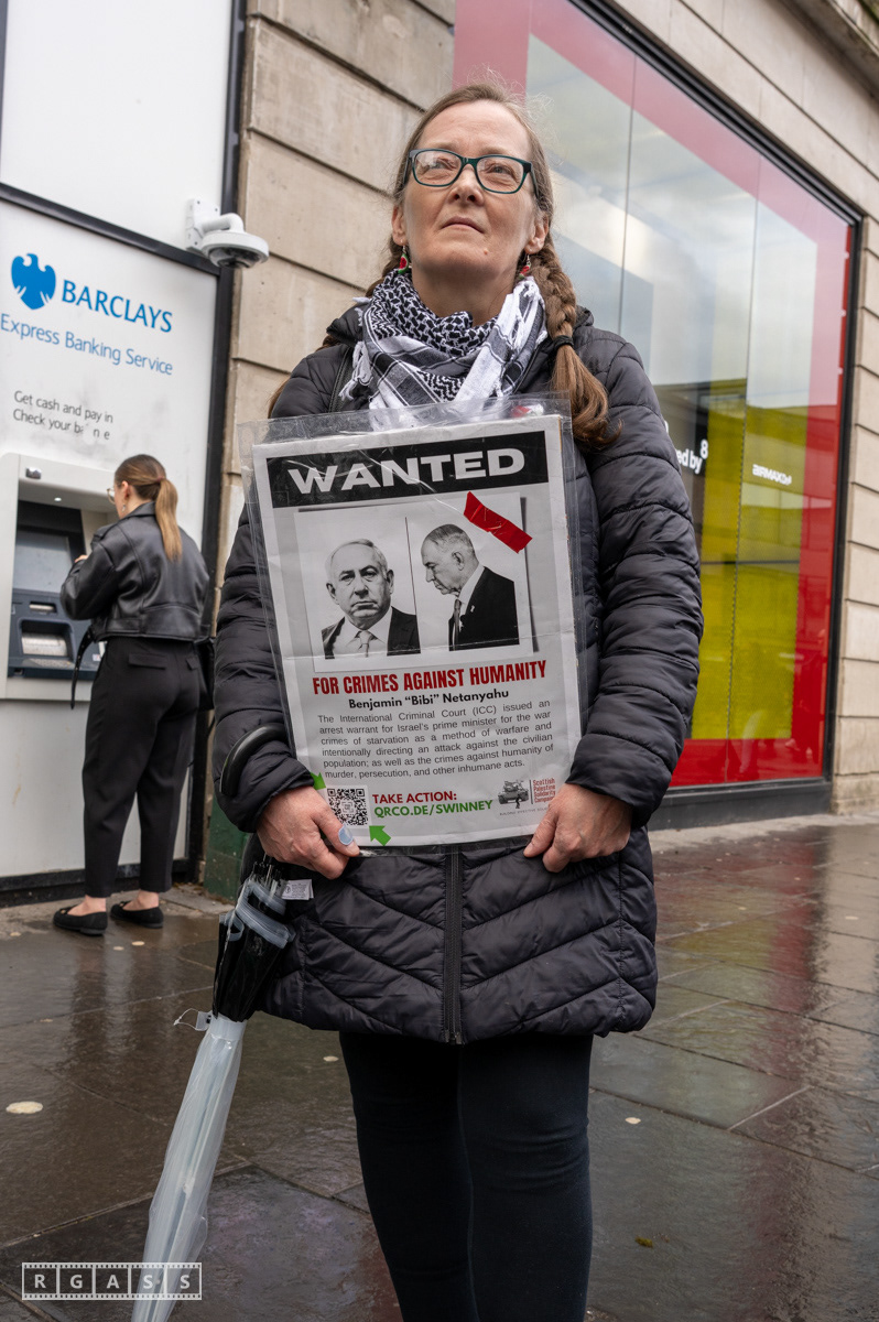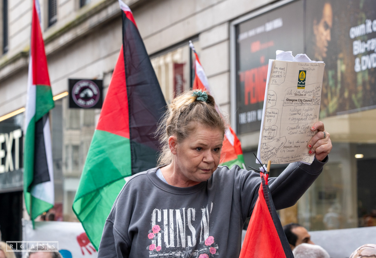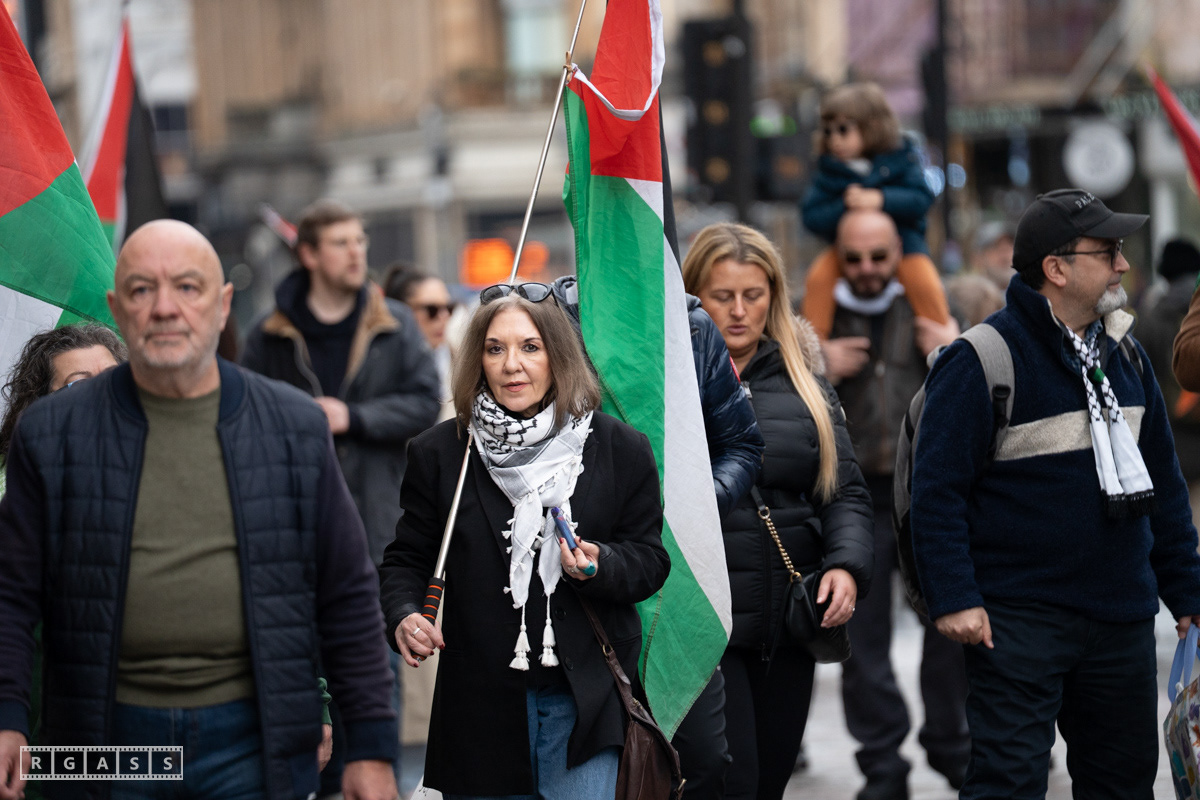 Glasgow uk. 22 March 2025. Pro-Palestine supporters at the weekly protest outside Barclays Bank on Argyll Street Glasgow