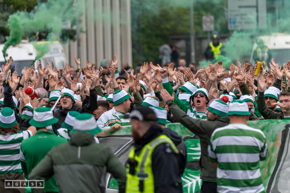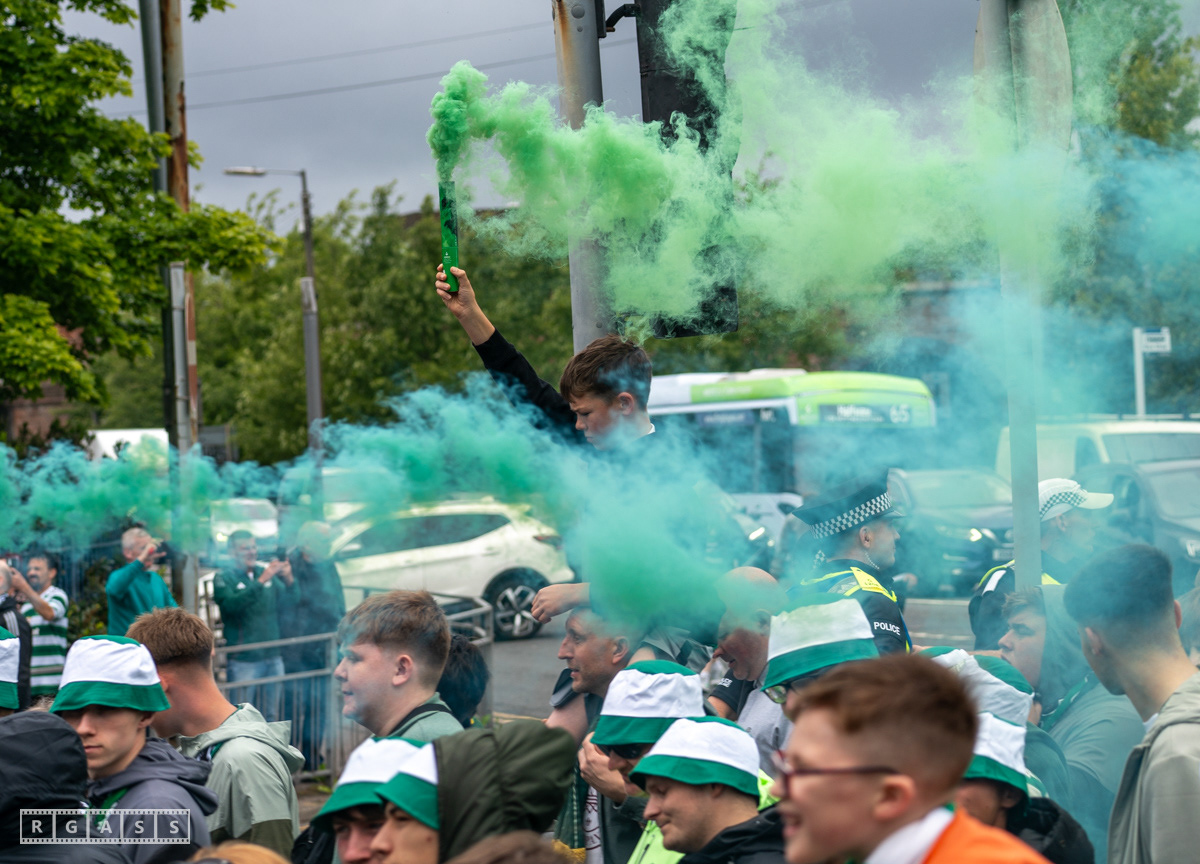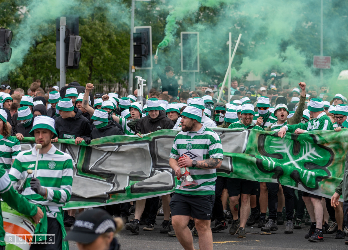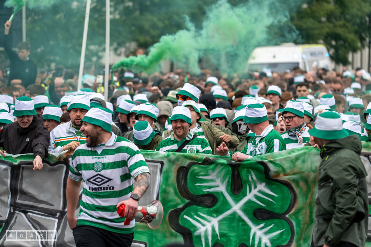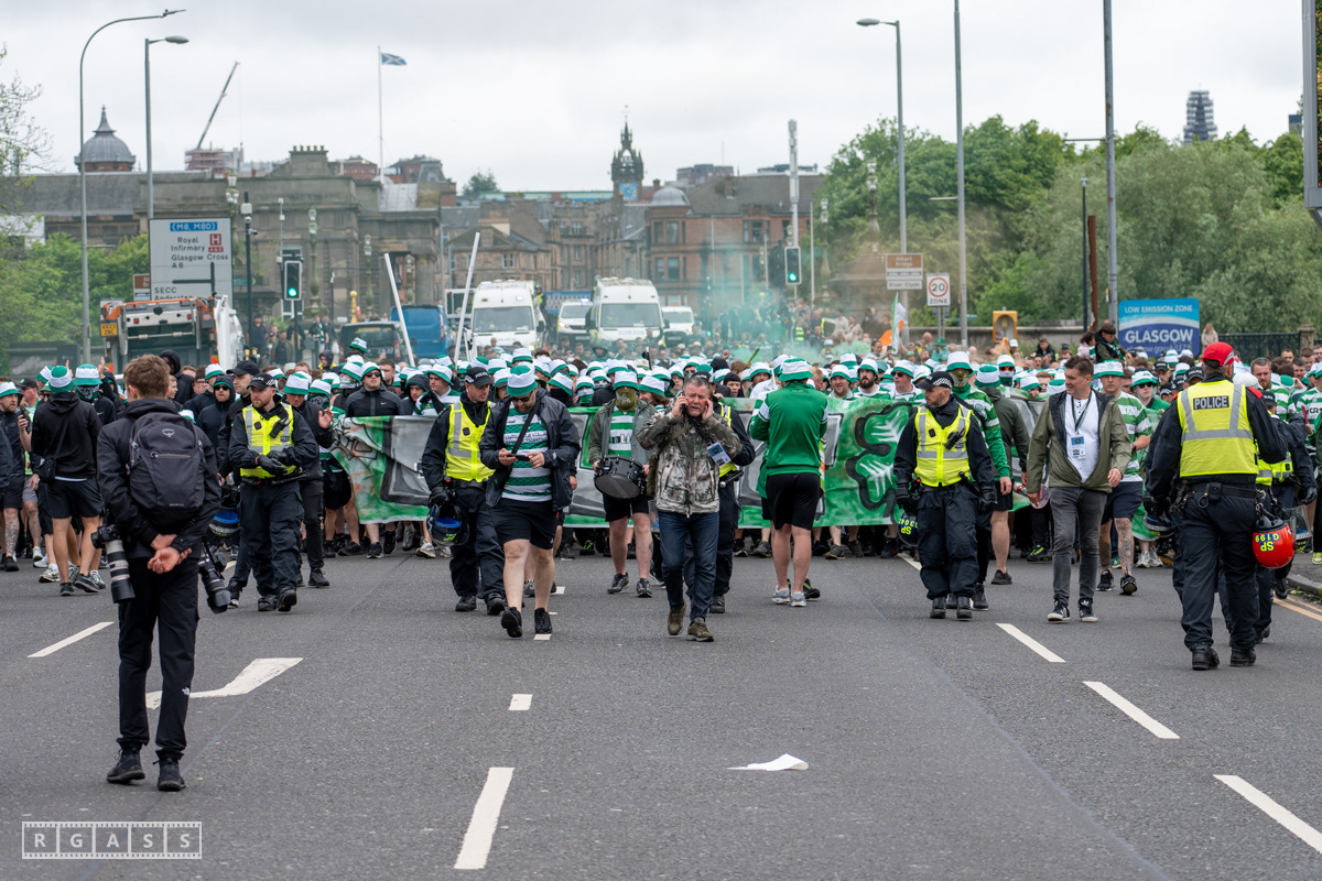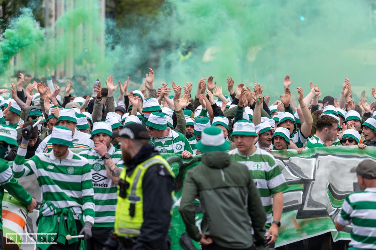 Glasgow, UK. 24 May 2025. The Green Brigade lead Celtic supporters wearing the Hoops in a march from Glasgow Green to Hampden Park ahead of Celtic v Aberdeen in the Scottish Cup final.