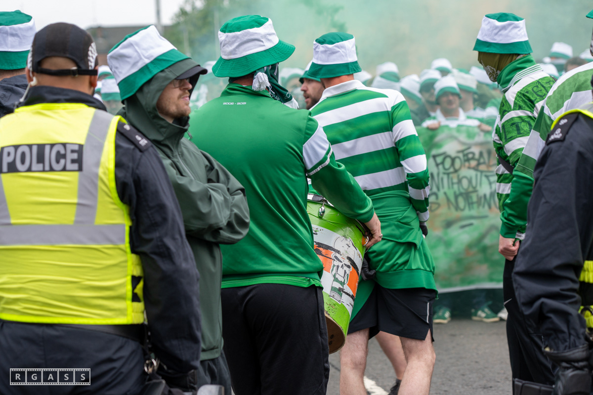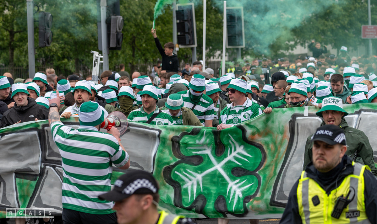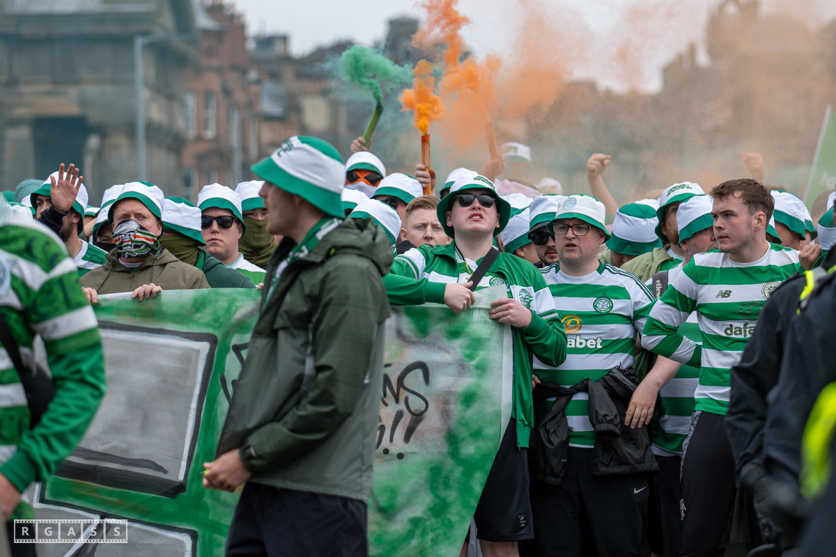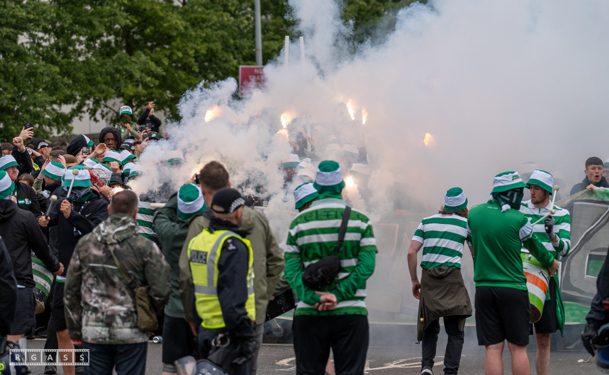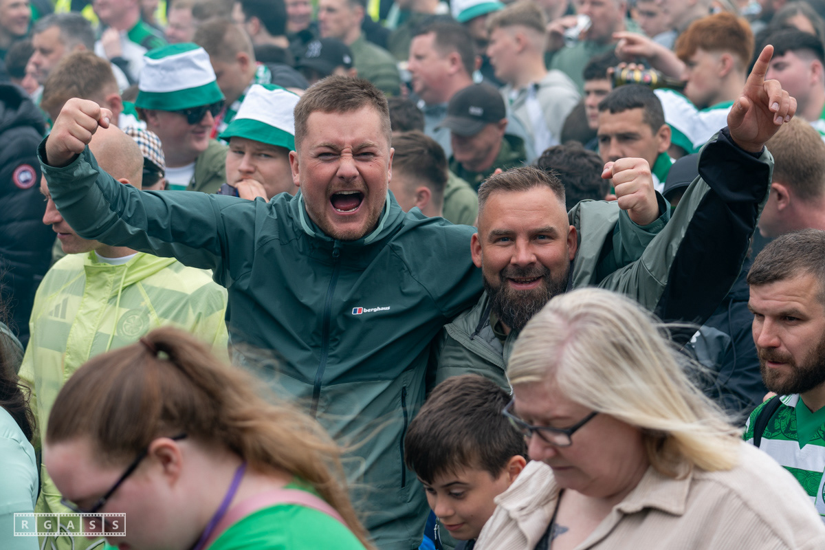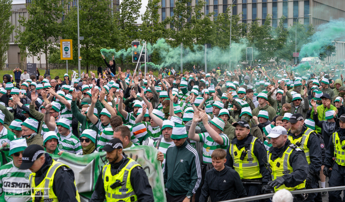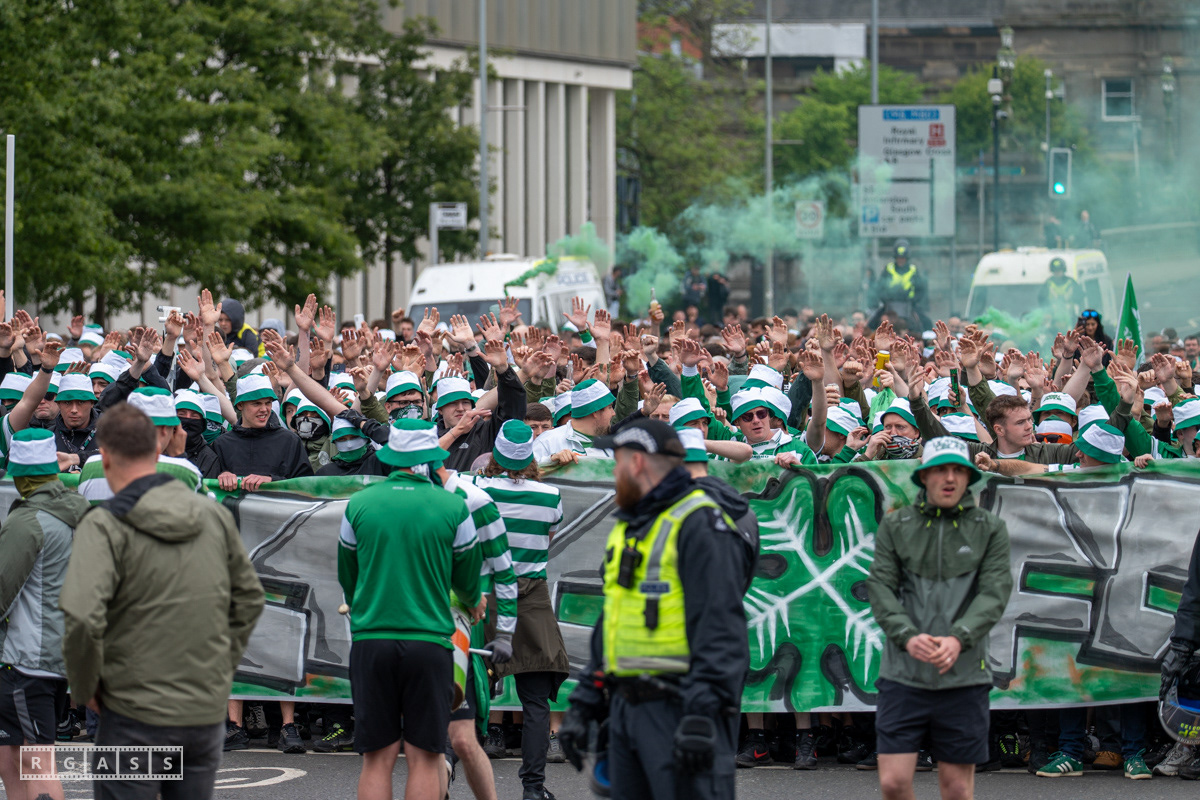 Glasgow, UK. 24 May 2025. The Green Brigade lead Celtic supporters wearing the Hoops in a march from Glasgow Green to Hampden Park ahead of Celtic v Aberdeen in the Scottish Cup final.