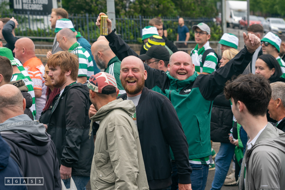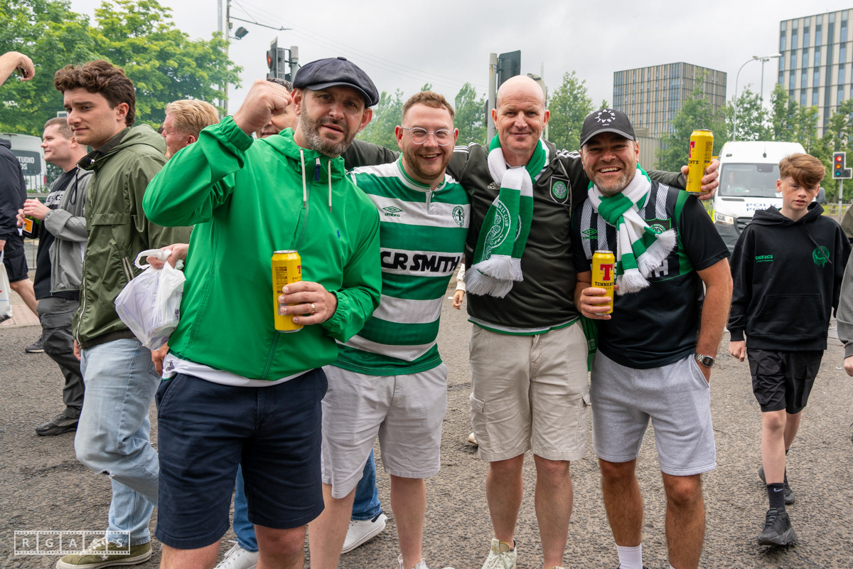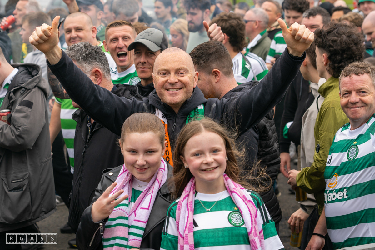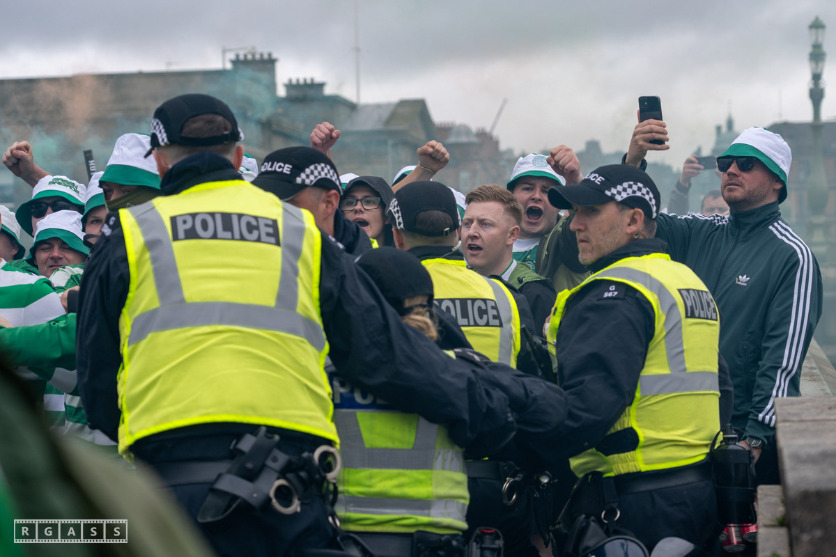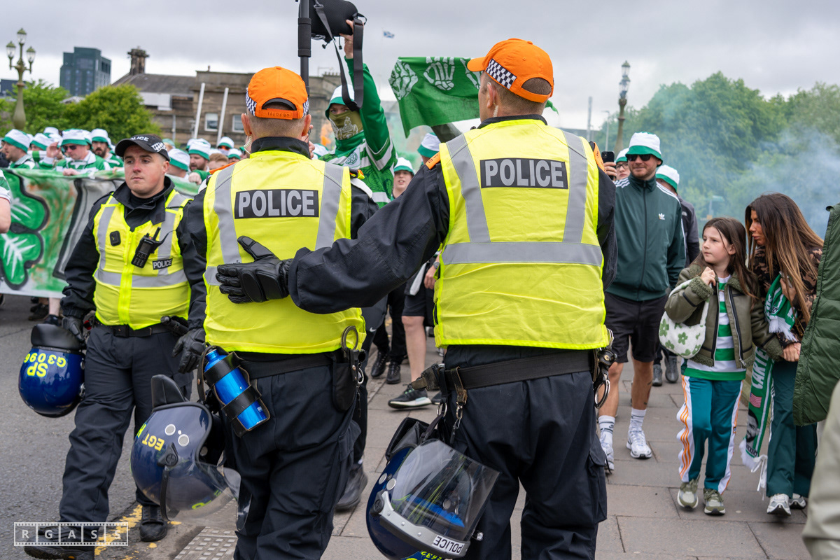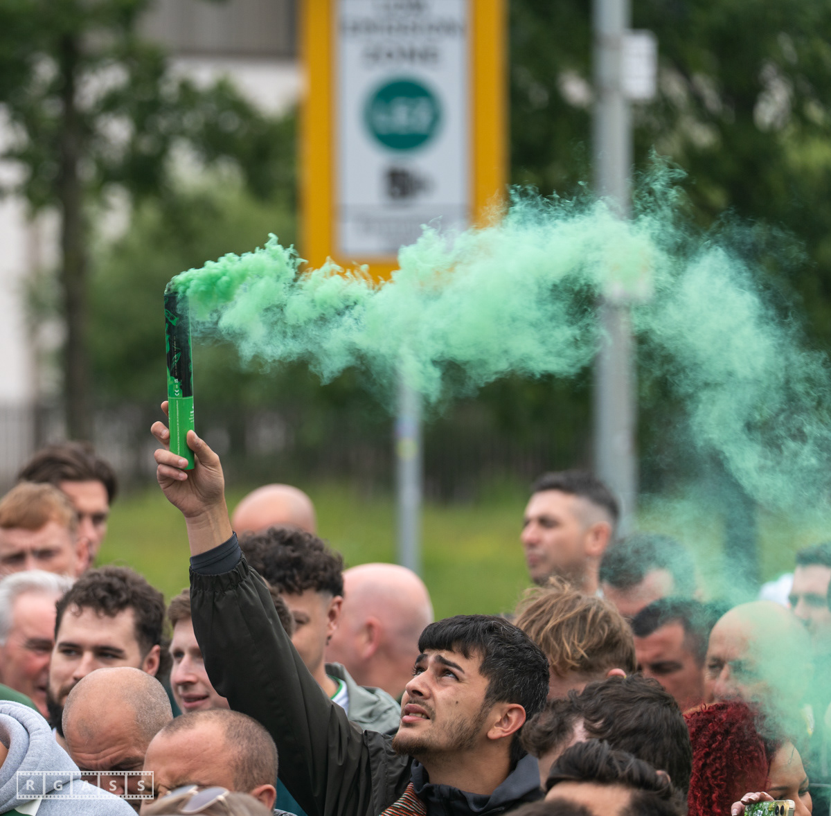 Glasgow, UK. 24 May 2025. The Green Brigade lead Celtic supporters wearing the Hoops in a march from Glasgow Green to Hampden Park ahead of Celtic v Aberdeen in the Scottish Cup final.
