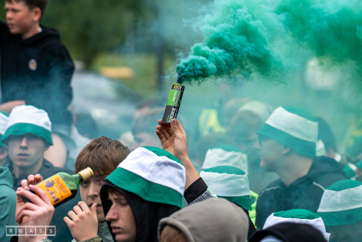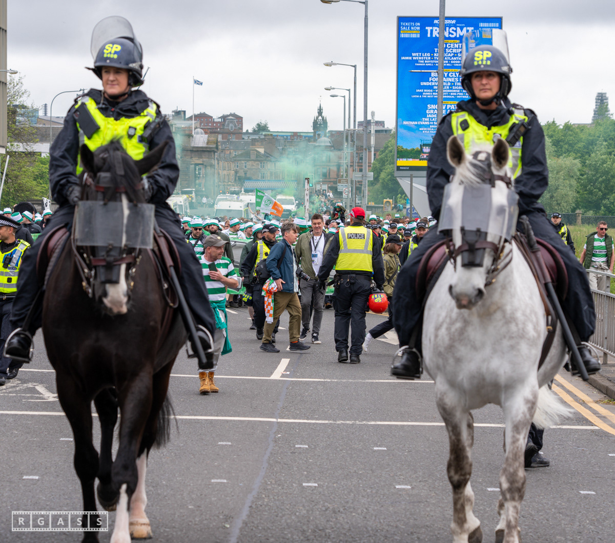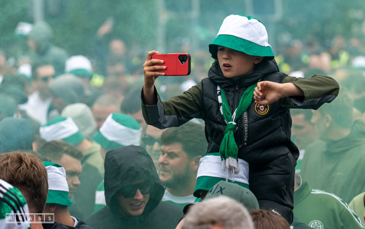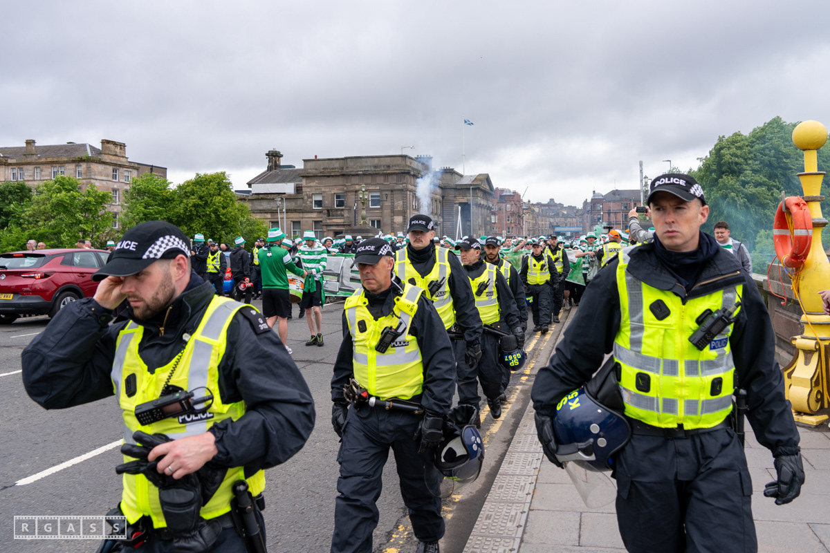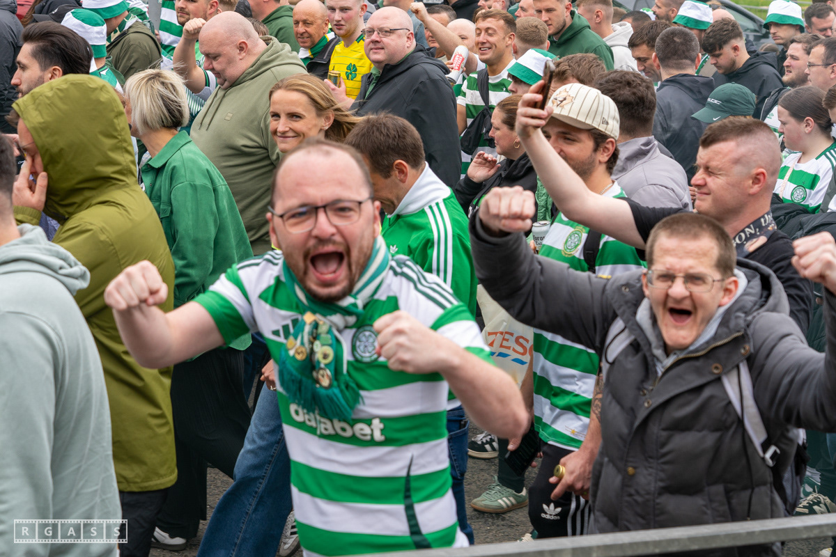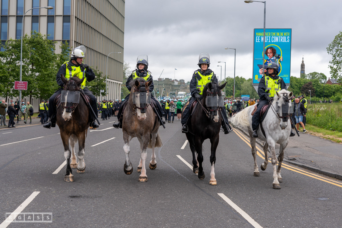 Glasgow, UK. 24 May 2025. The Green Brigade lead Celtic supporters wearing the Hoops in a march from Glasgow Green to Hampden Park ahead of Celtic v Aberdeen in the Scottish Cup final.
