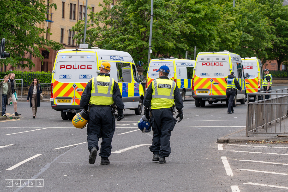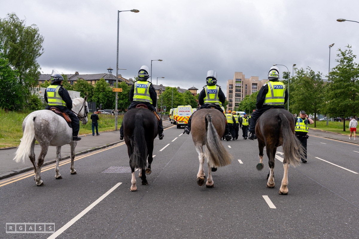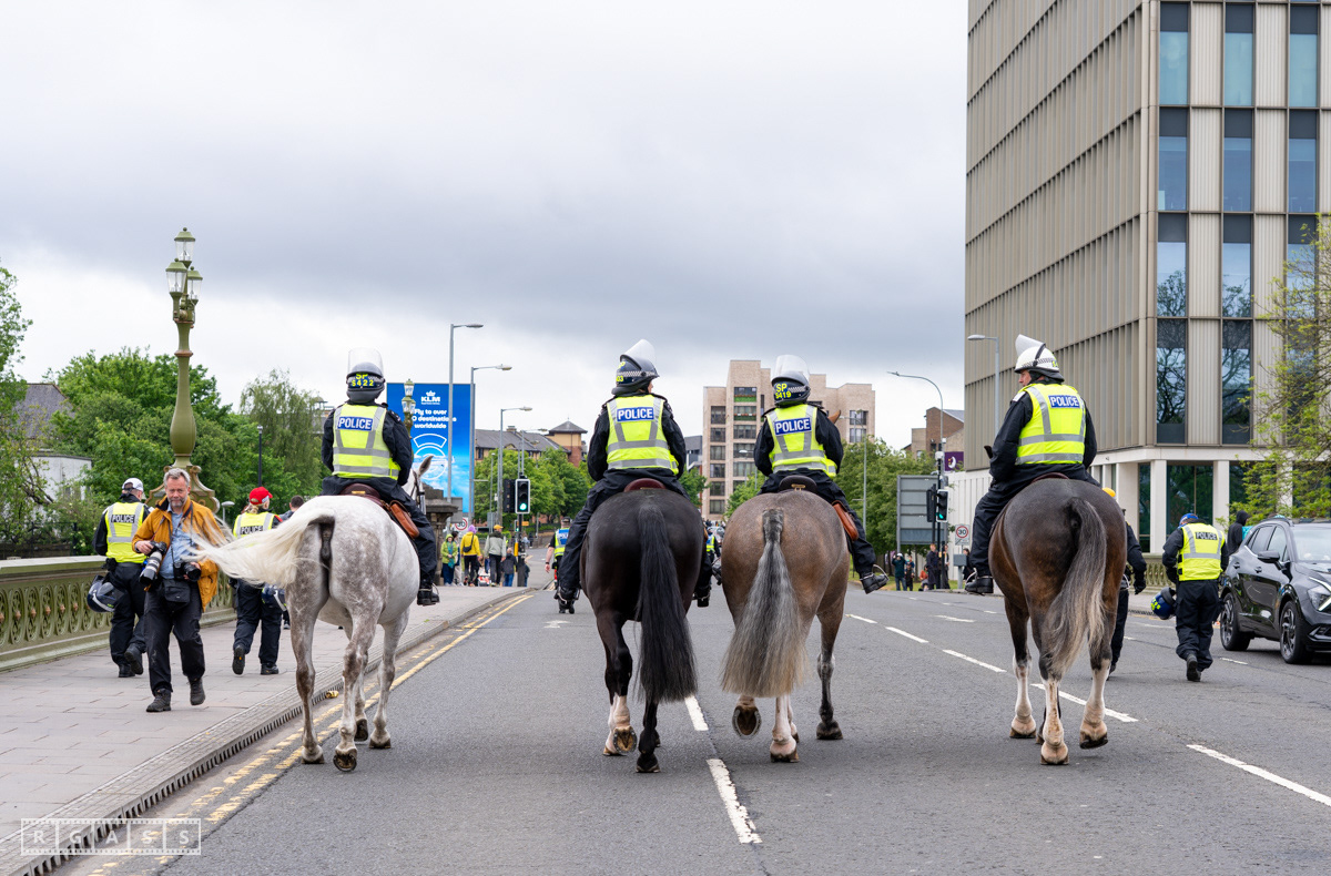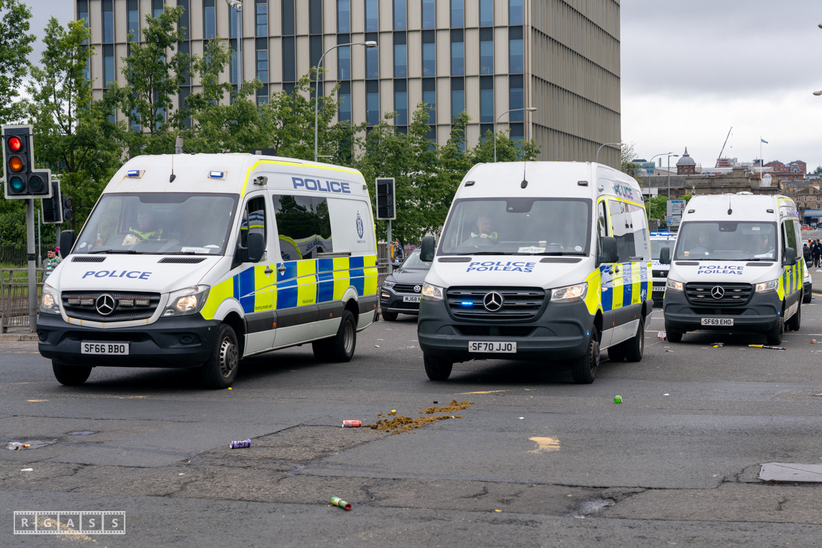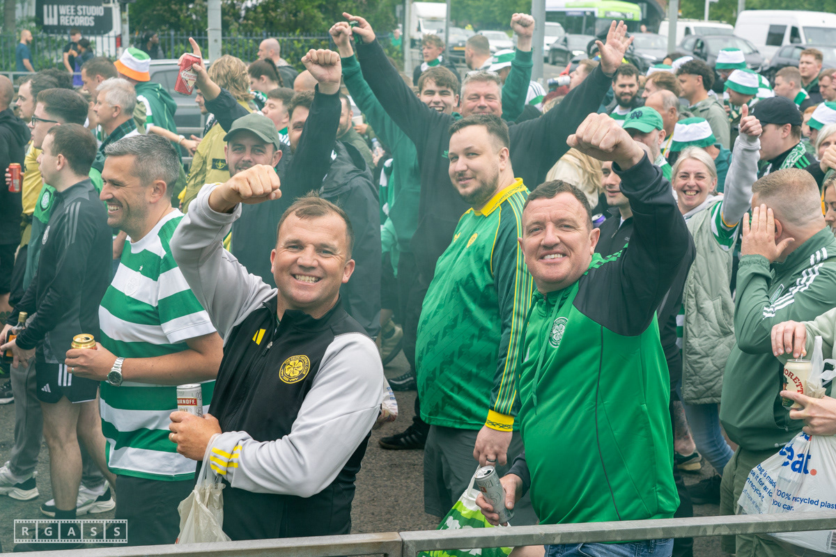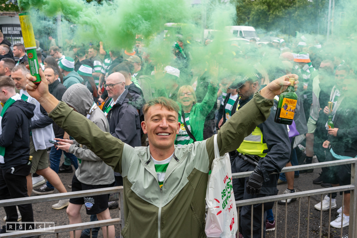 Glasgow, UK. 24 May 2025. The Green Brigade lead Celtic supporters wearing the Hoops in a march from Glasgow Green to Hampden Park ahead of Celtic v Aberdeen in the Scottish Cup final.
