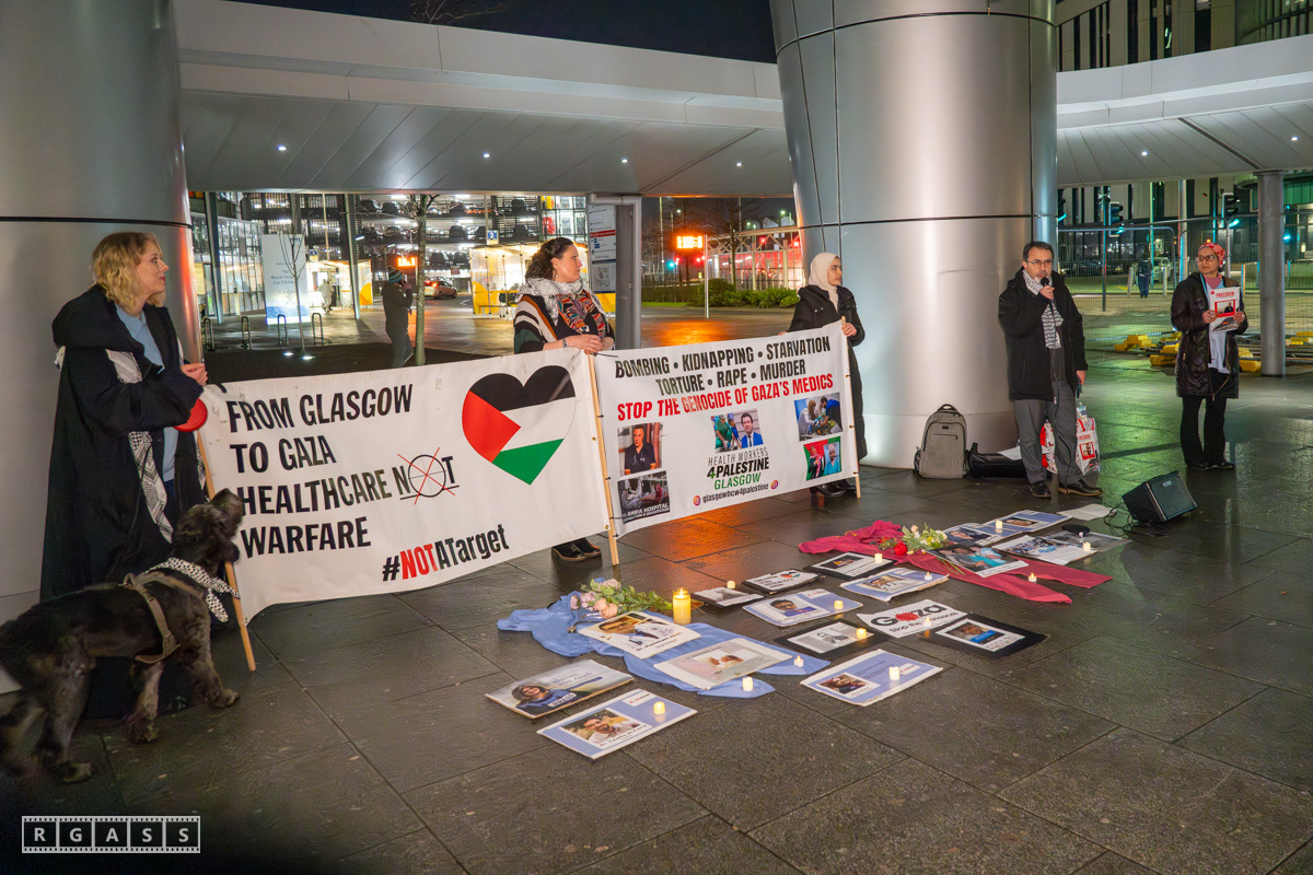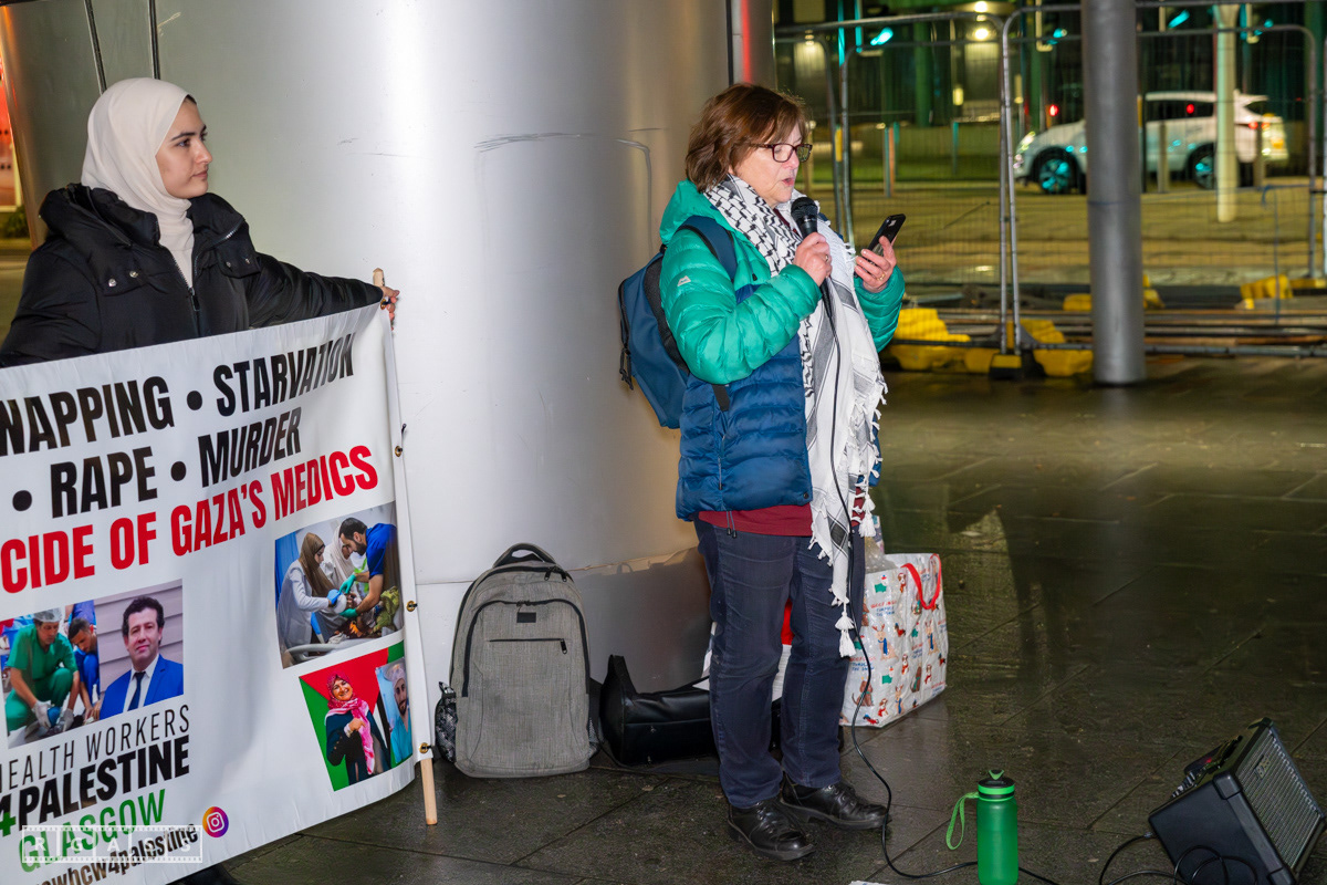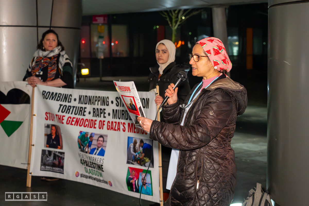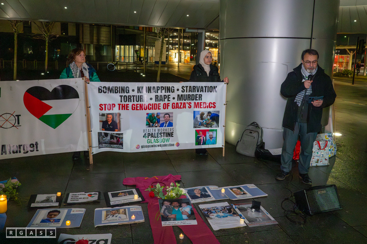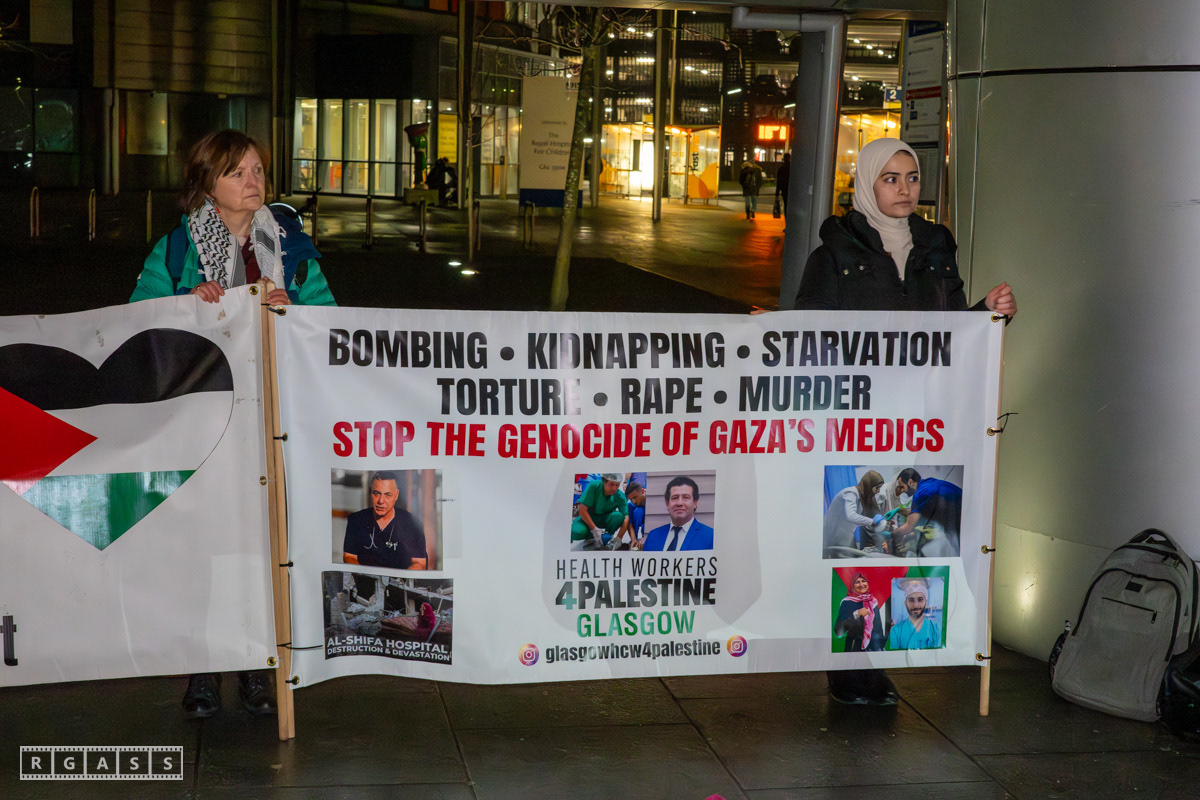 Glasgow, UK. 31 January 2025. Health Workers 4 Palestine vigil outside the main entrance to the Queen Elizabeth Hospital.