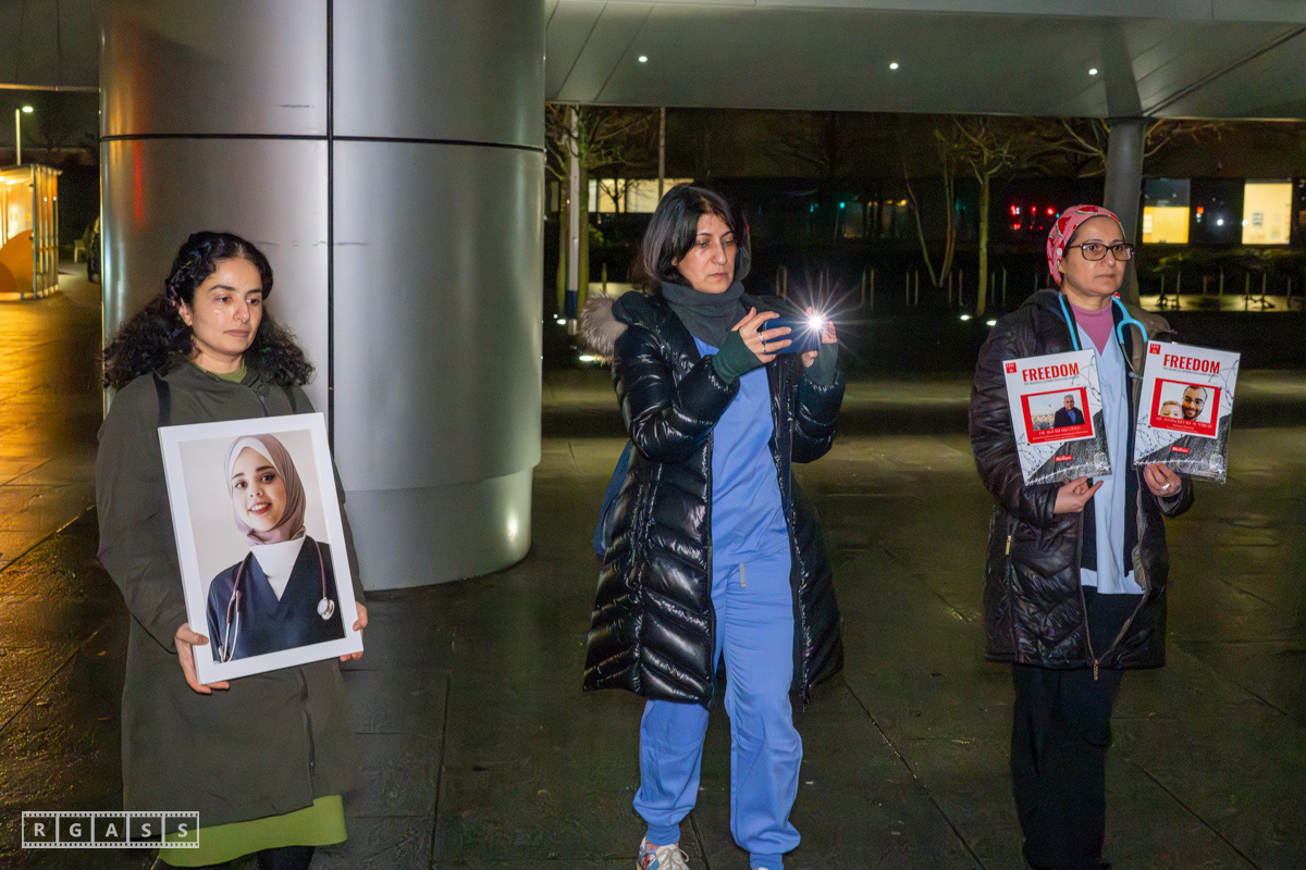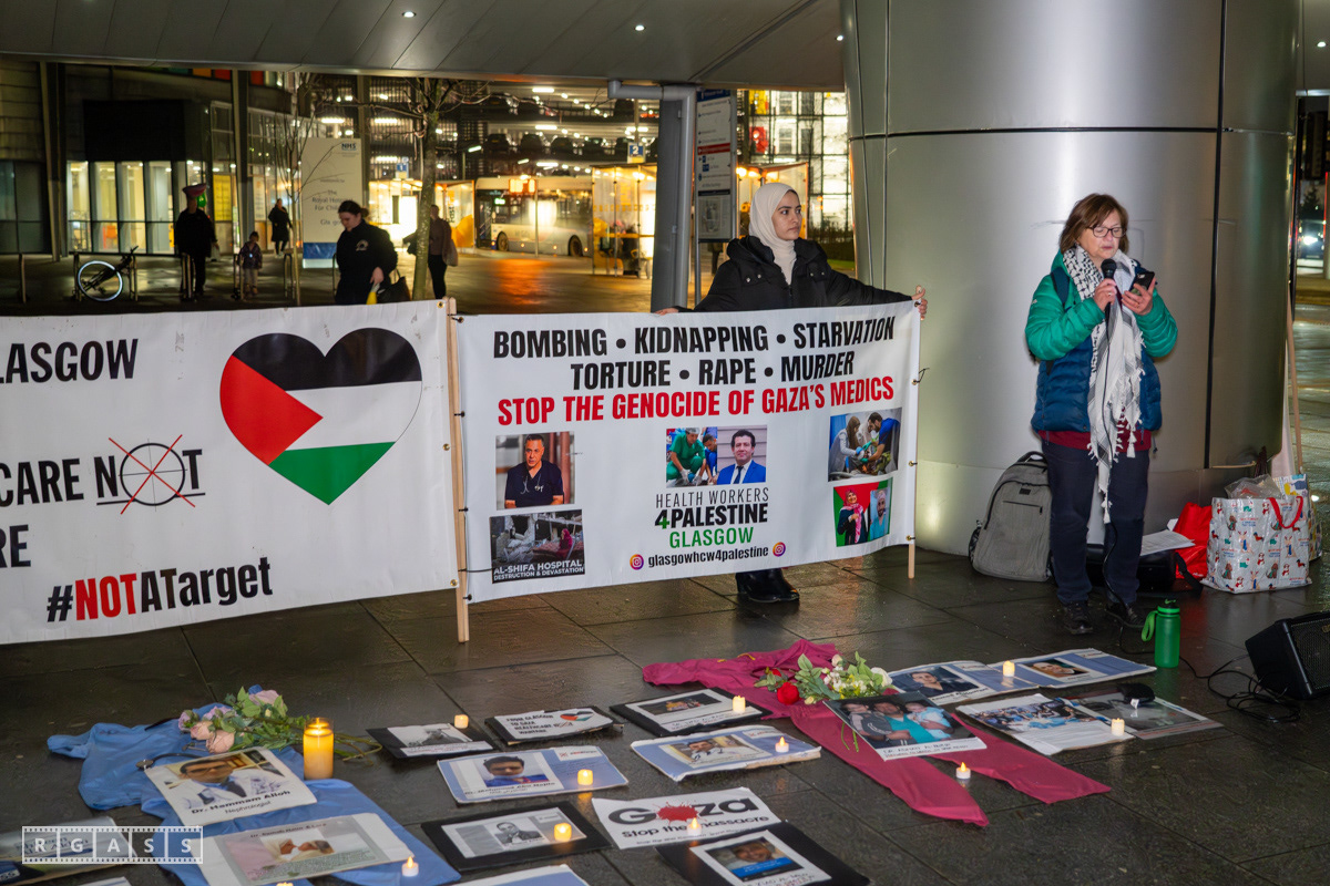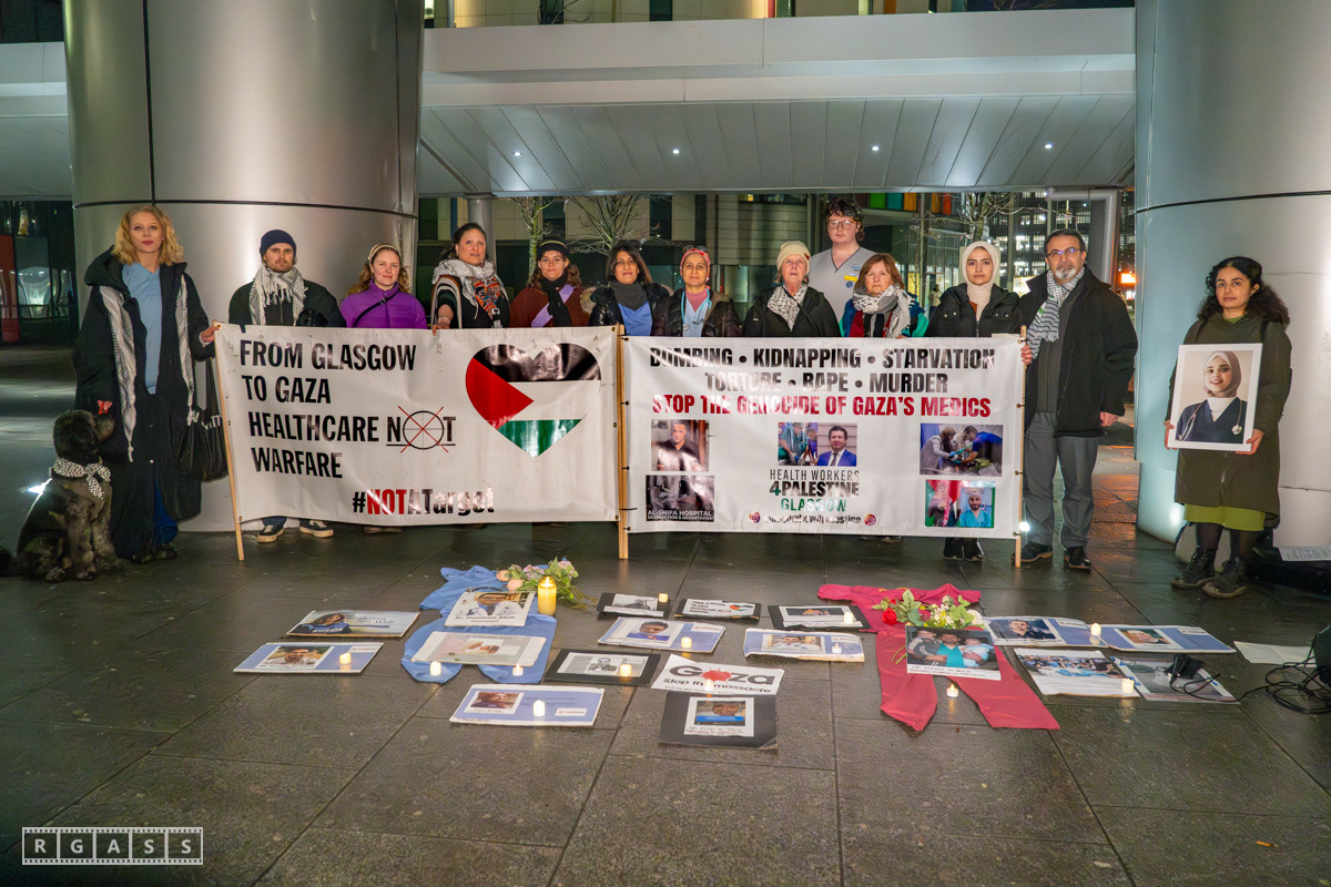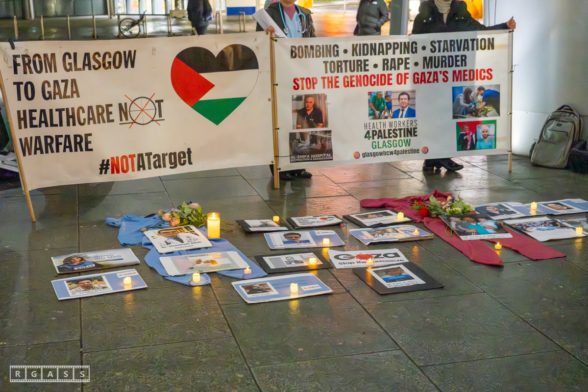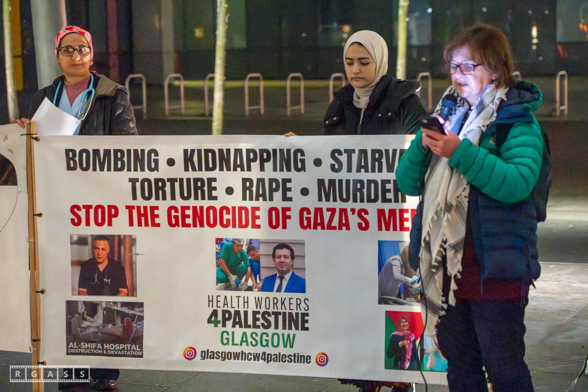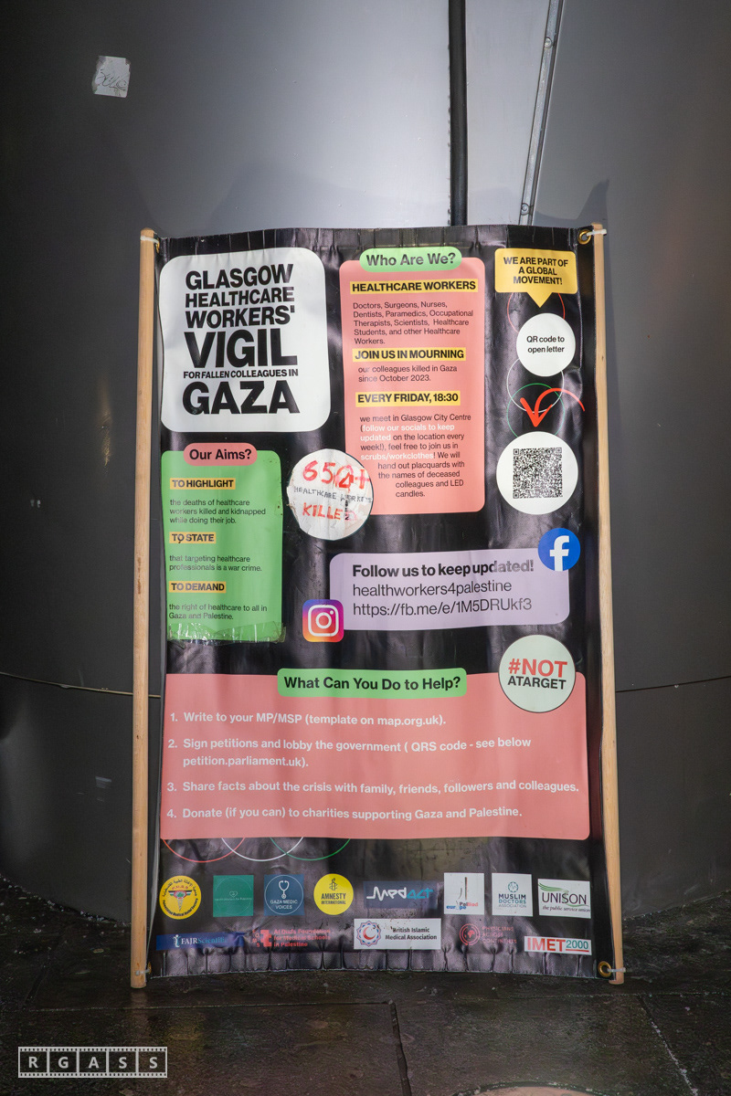 Glasgow, UK. 31 January 2025. Health Workers 4 Palestine vigil outside the main entrance to the Queen Elizabeth Hospital.