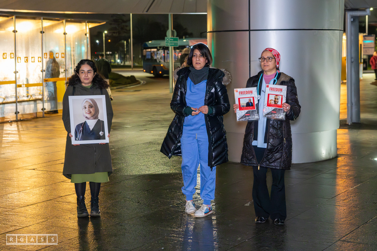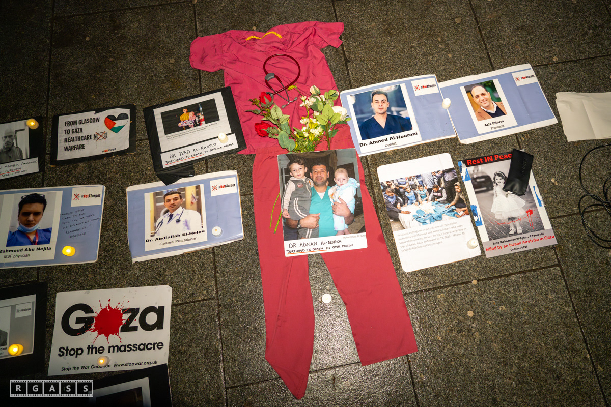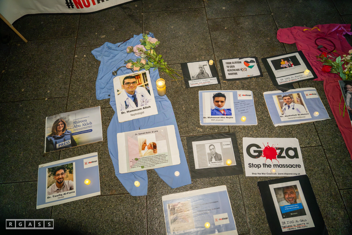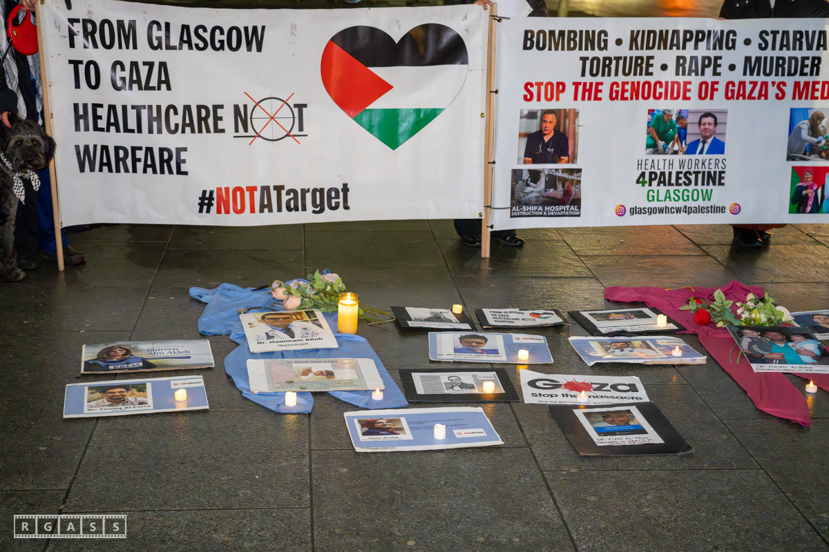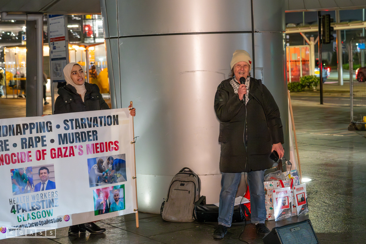 Glasgow, UK. 31 January 2025. Health Workers 4 Palestine vigil outside the main entrance to the Queen Elizabeth Hospital.