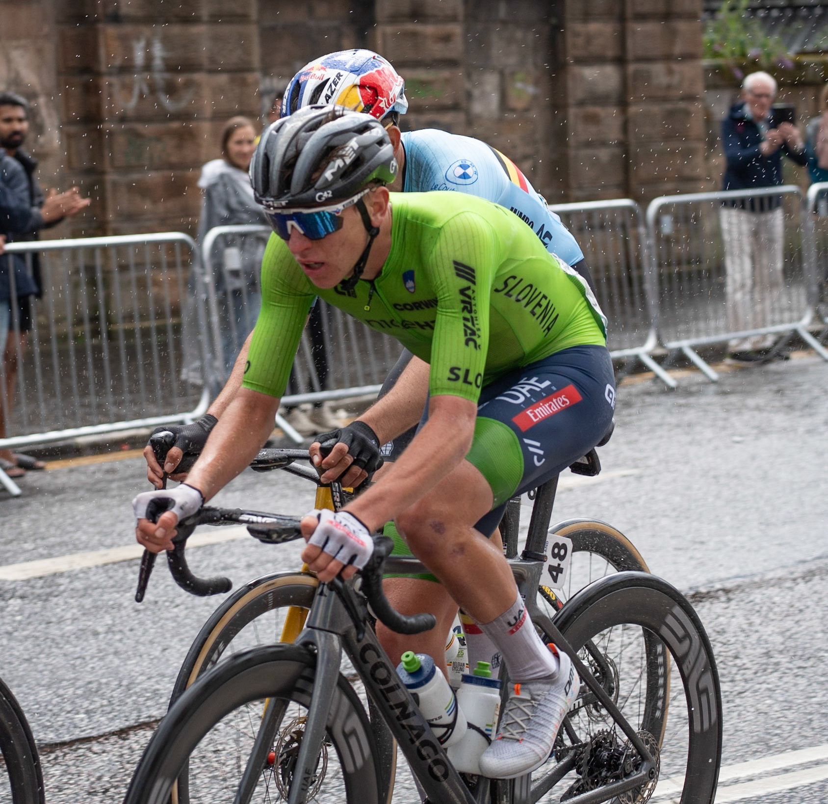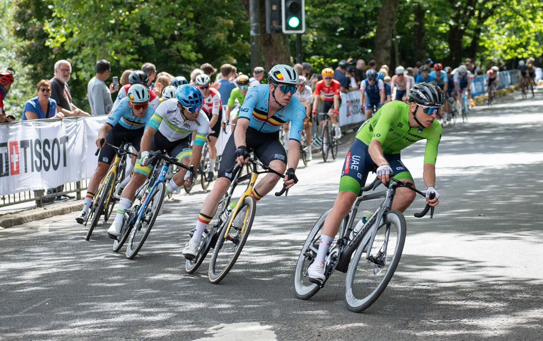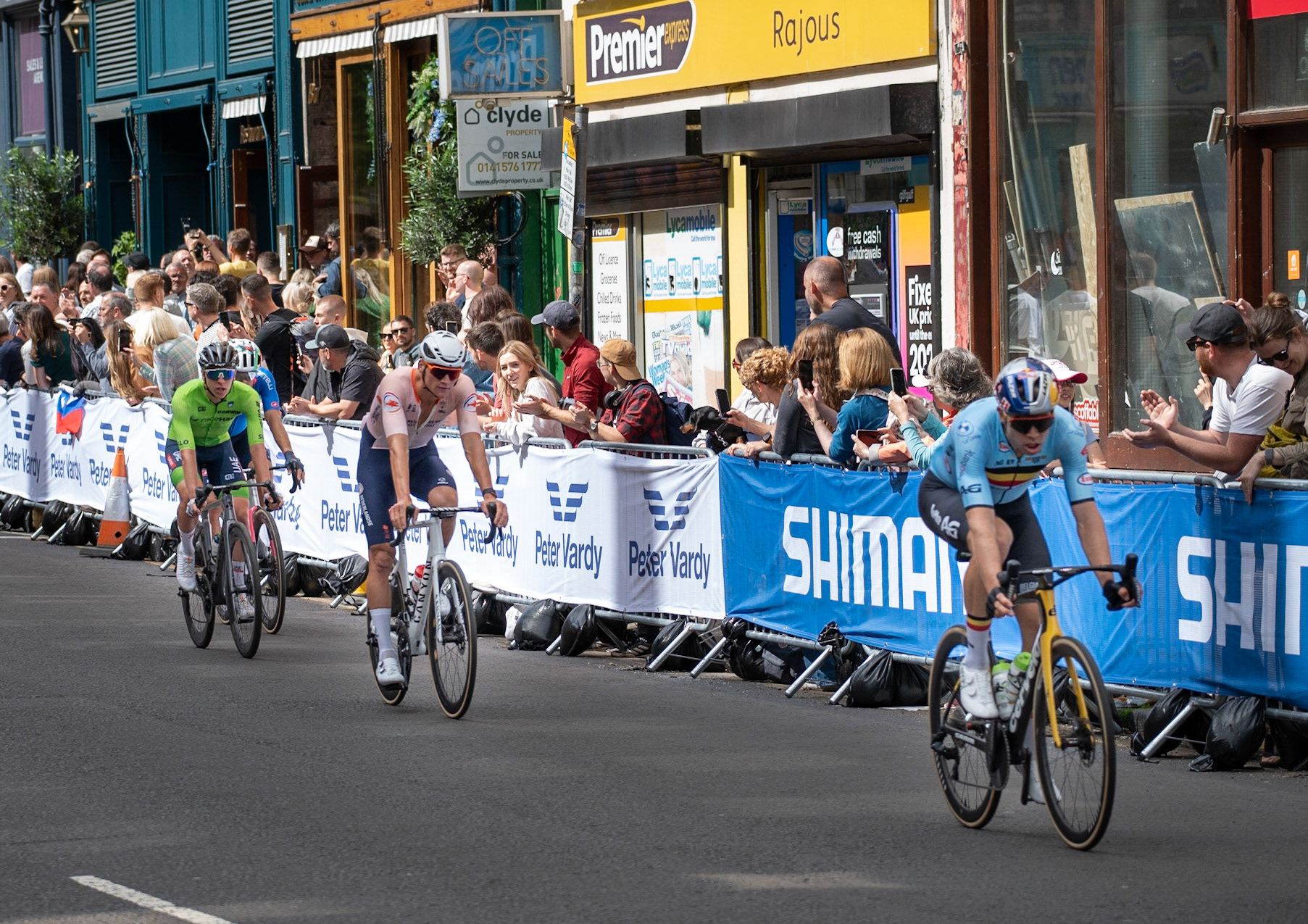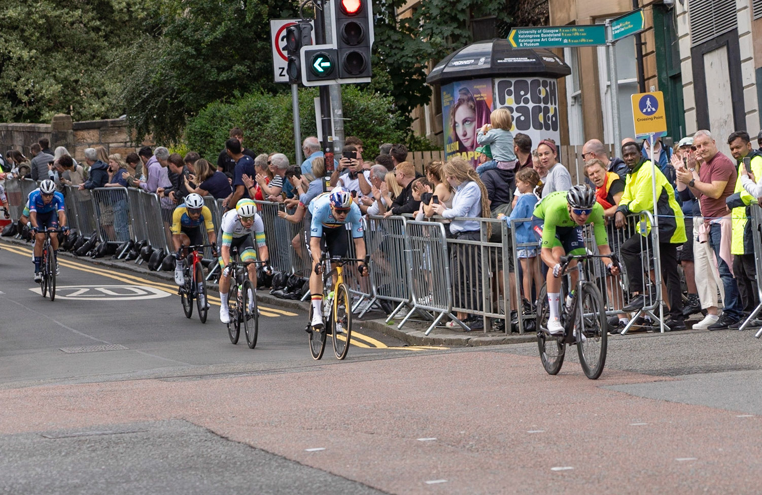 Glasgow, Scotland, UK. 6th August 2023. UCI World Championships – Mathieu van der Poel wins the Men’s Elite Road Race Road Race from Edinburgh to Glasgow ending with 10 laps of the city centre circuit. Credit R.Gass/Alamy Live News