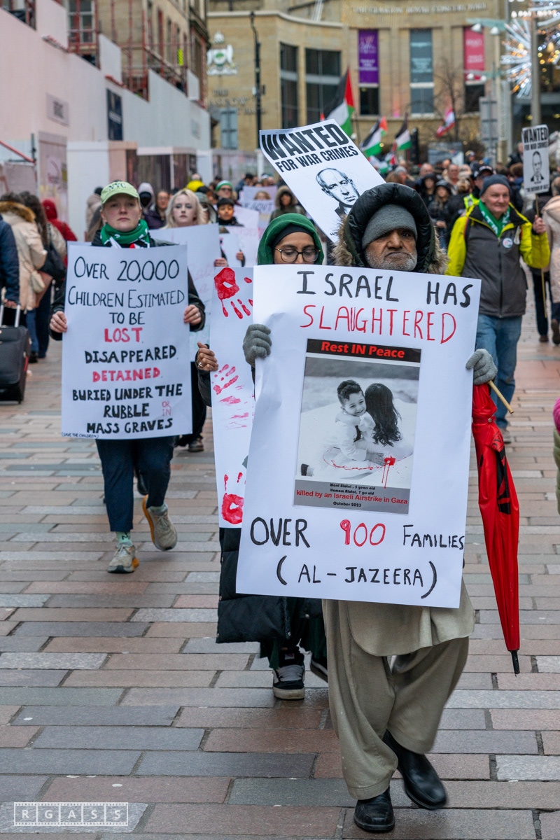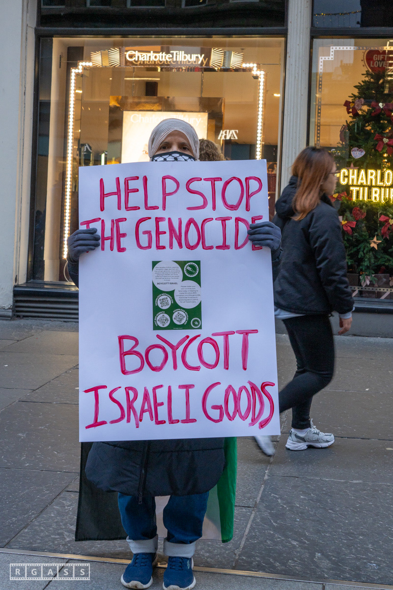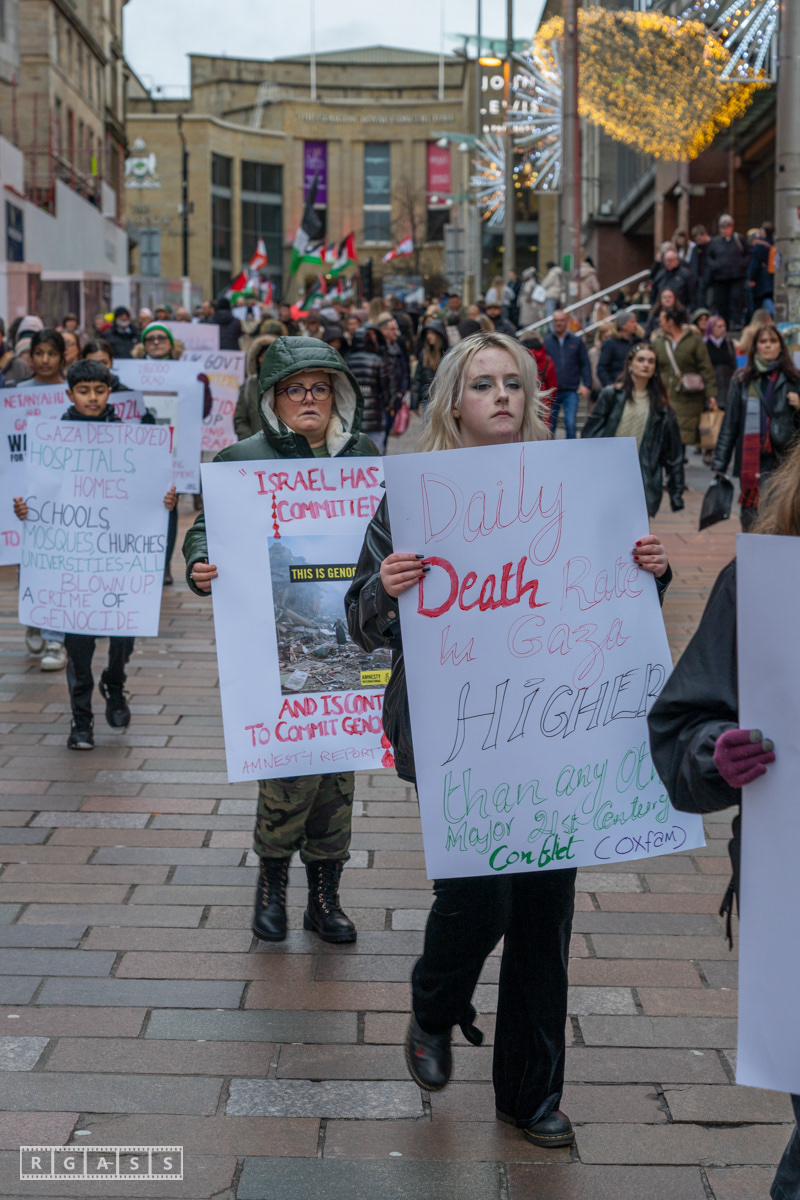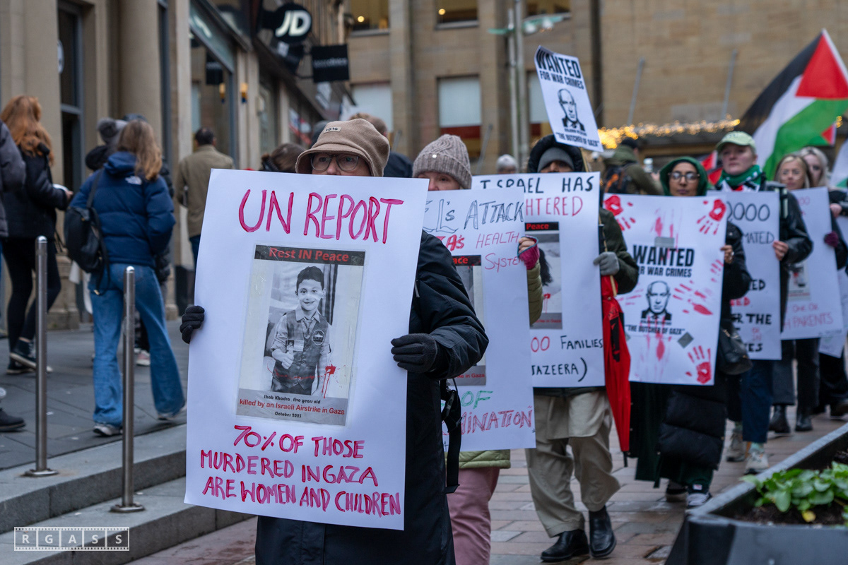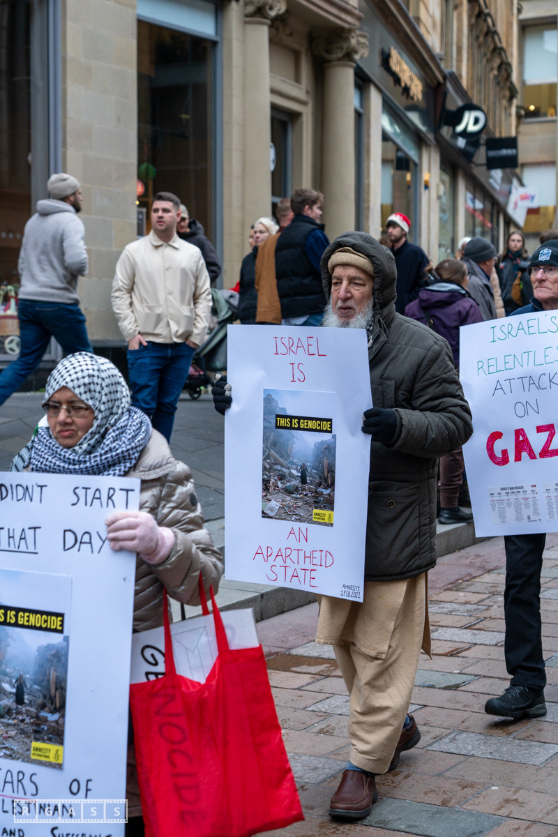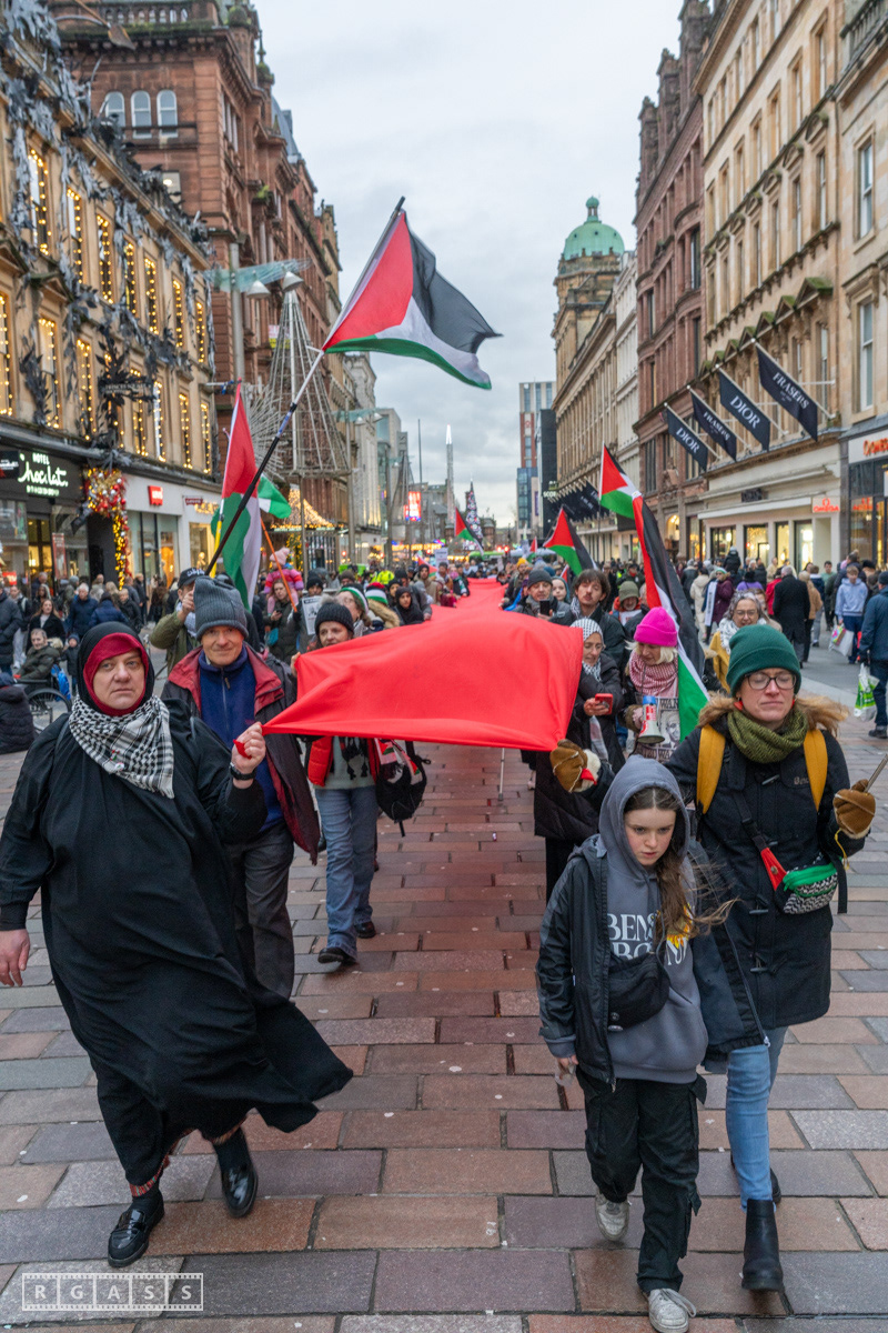 7th December 2024. Glasgow. Pro Palestine protesters after their rally at the Buchanan Steps march along Buchanan Street with a variety of descriptive placards.