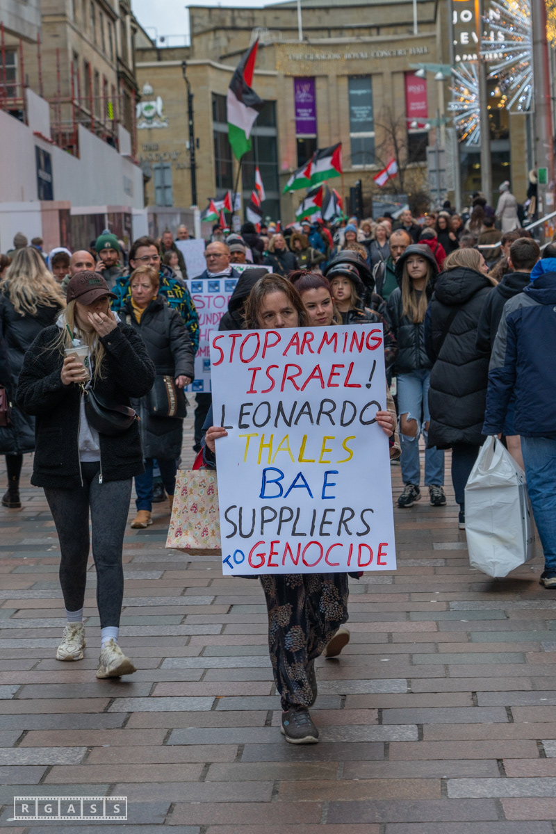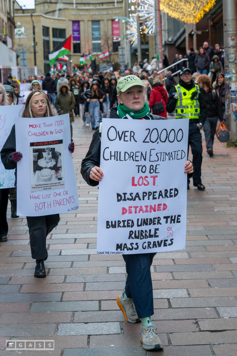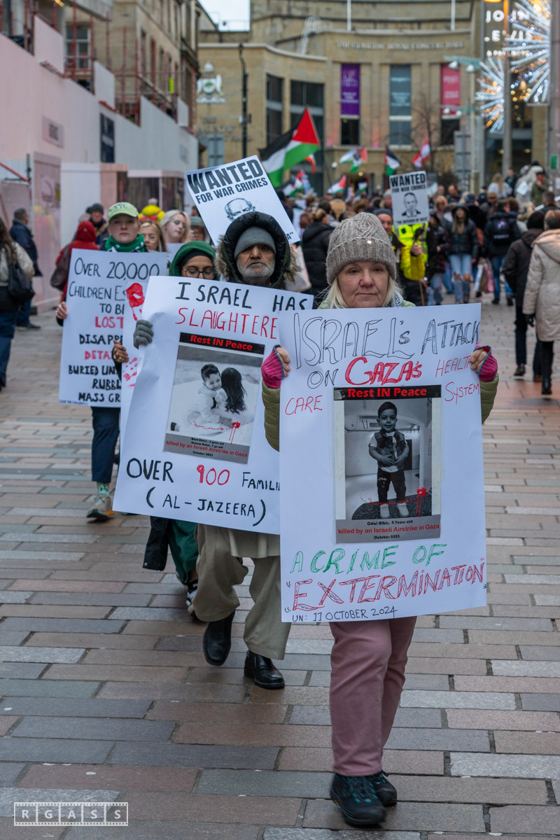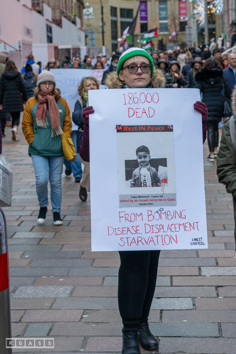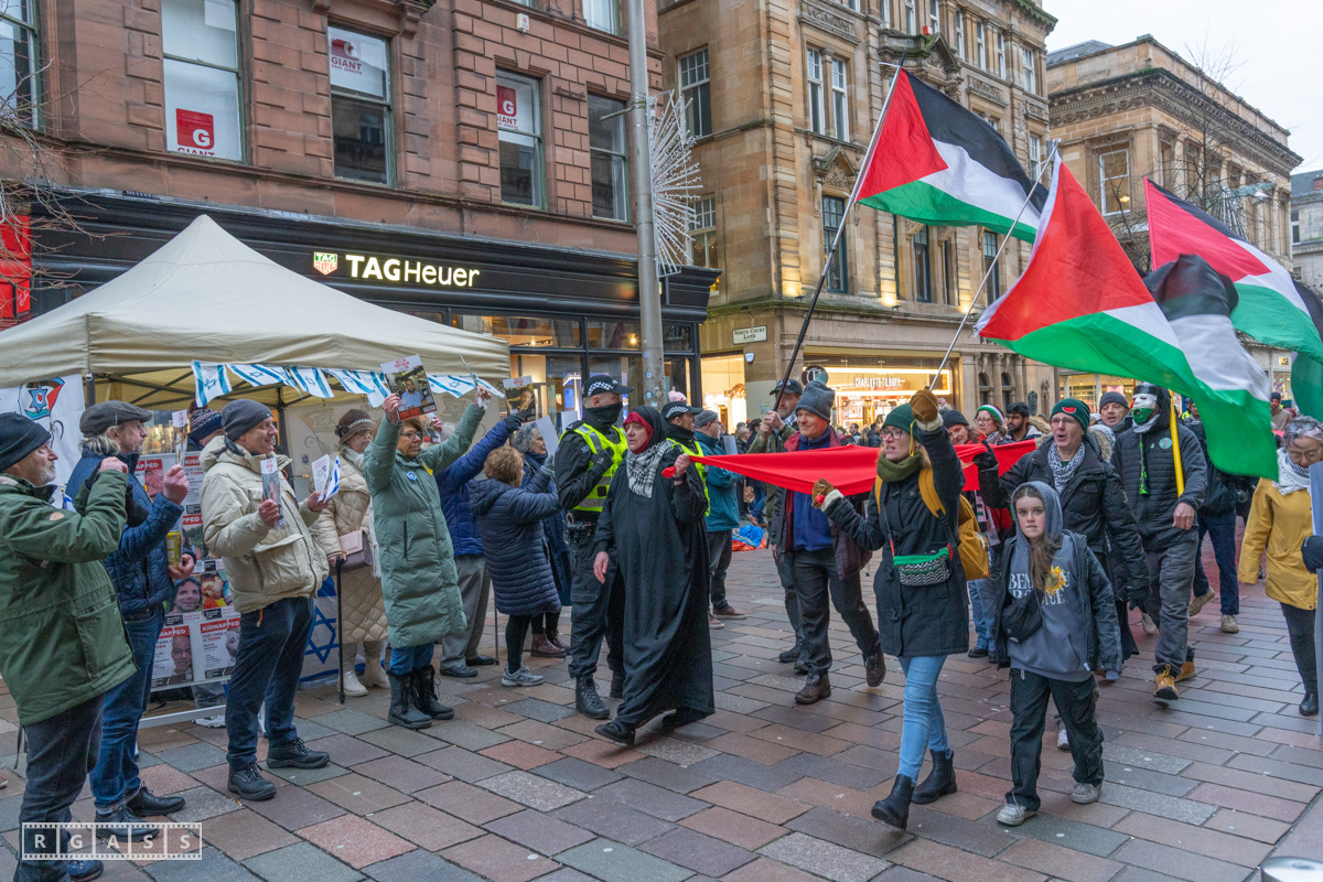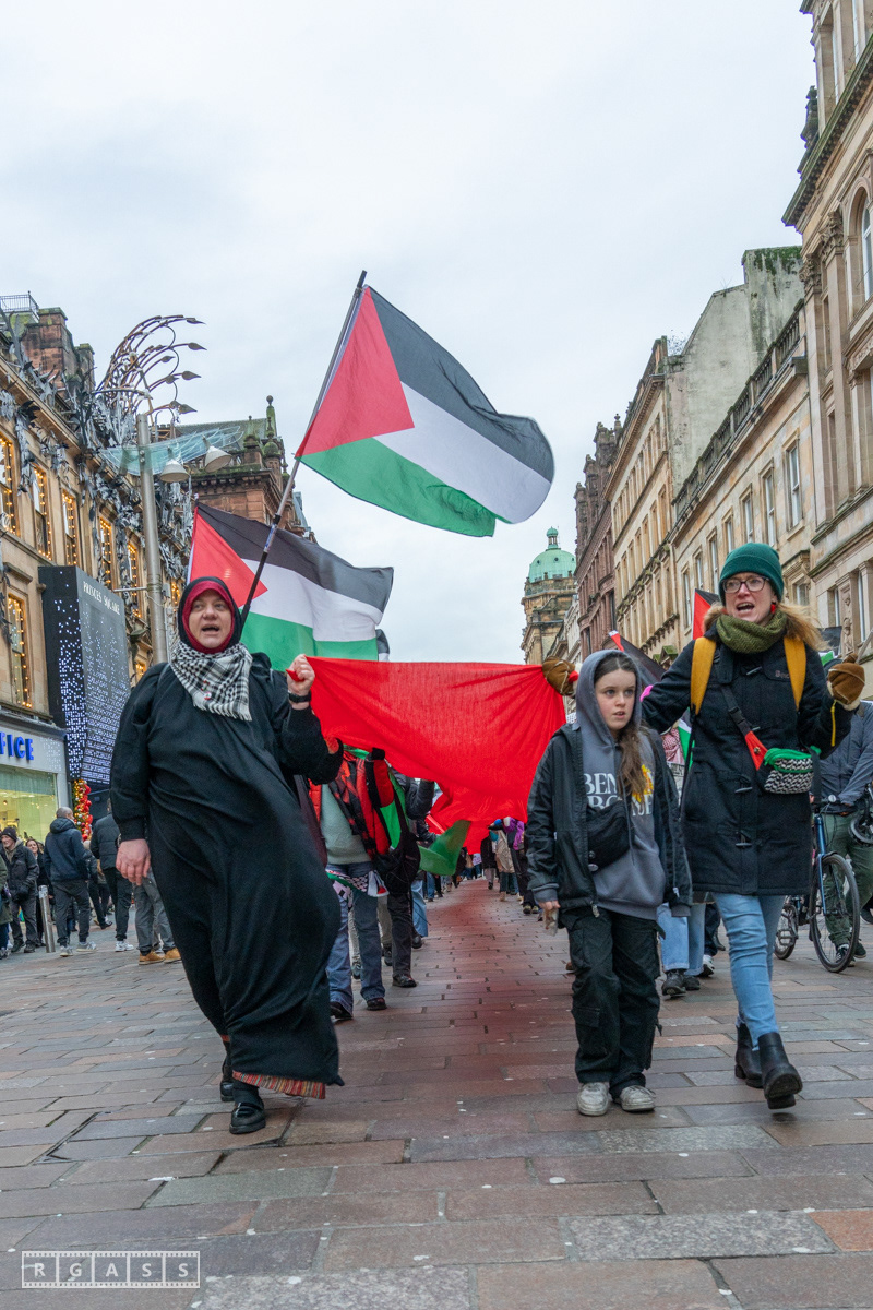 7th December 2024. Glasgow. Pro Palestine protesters after their rally at the Buchanan Steps march along Buchanan Street with a variety of descriptive placards.