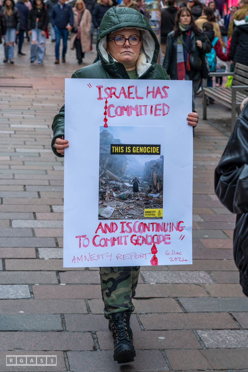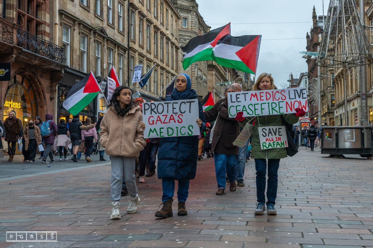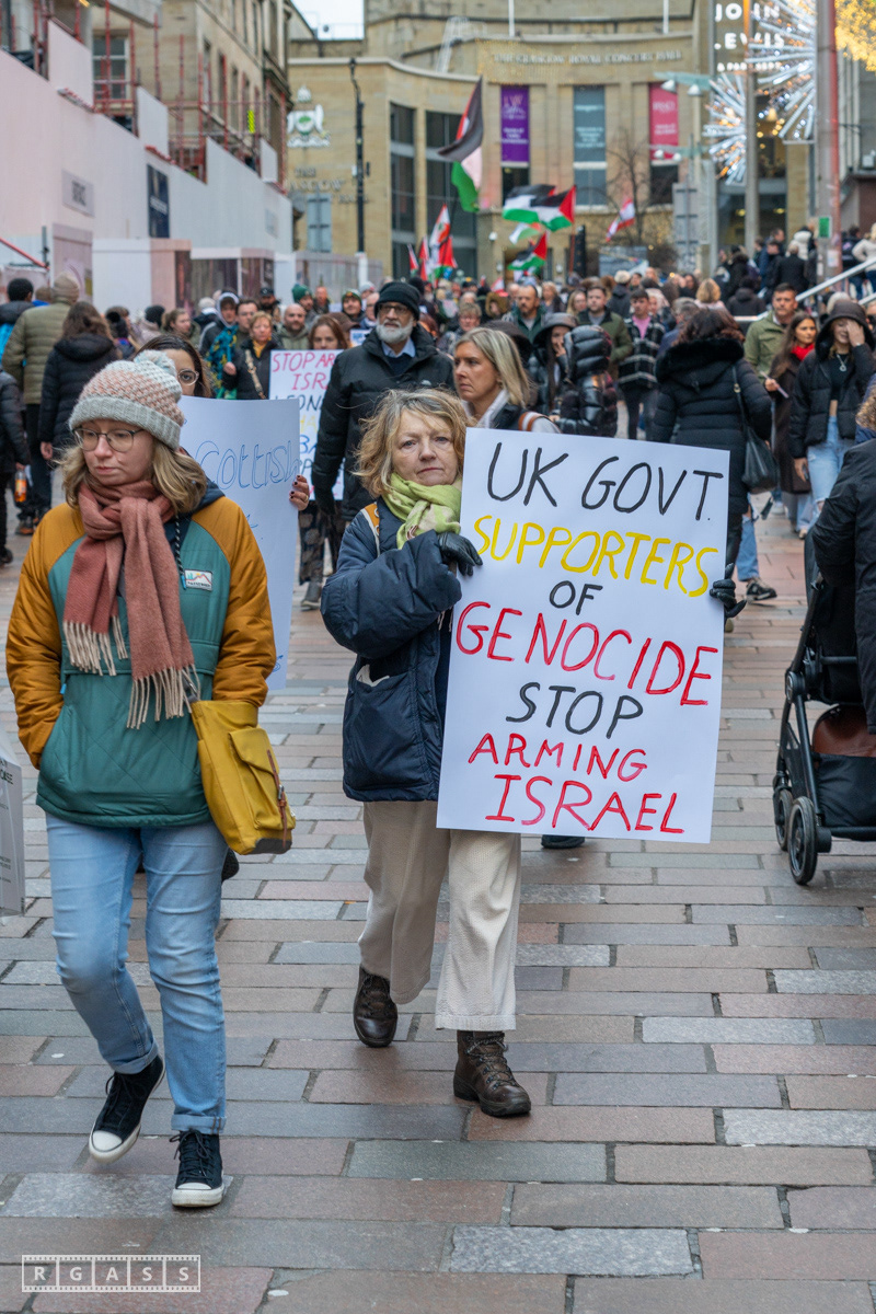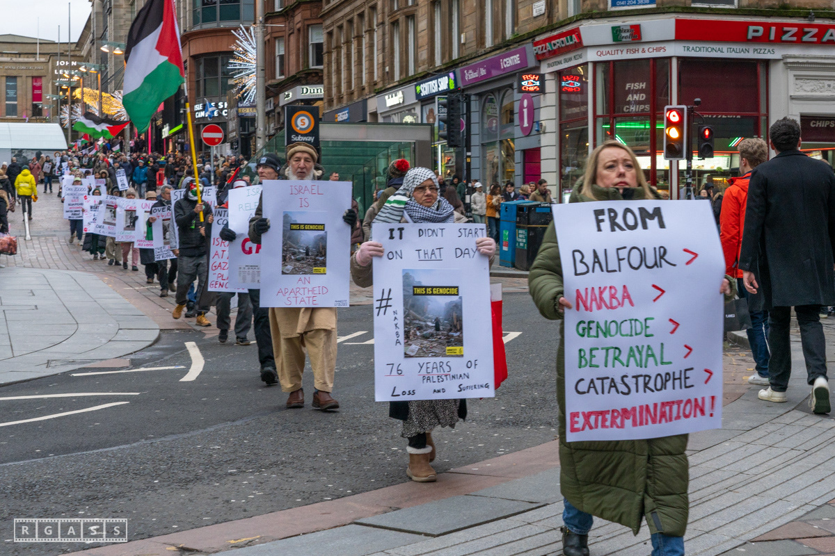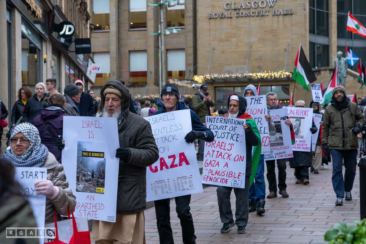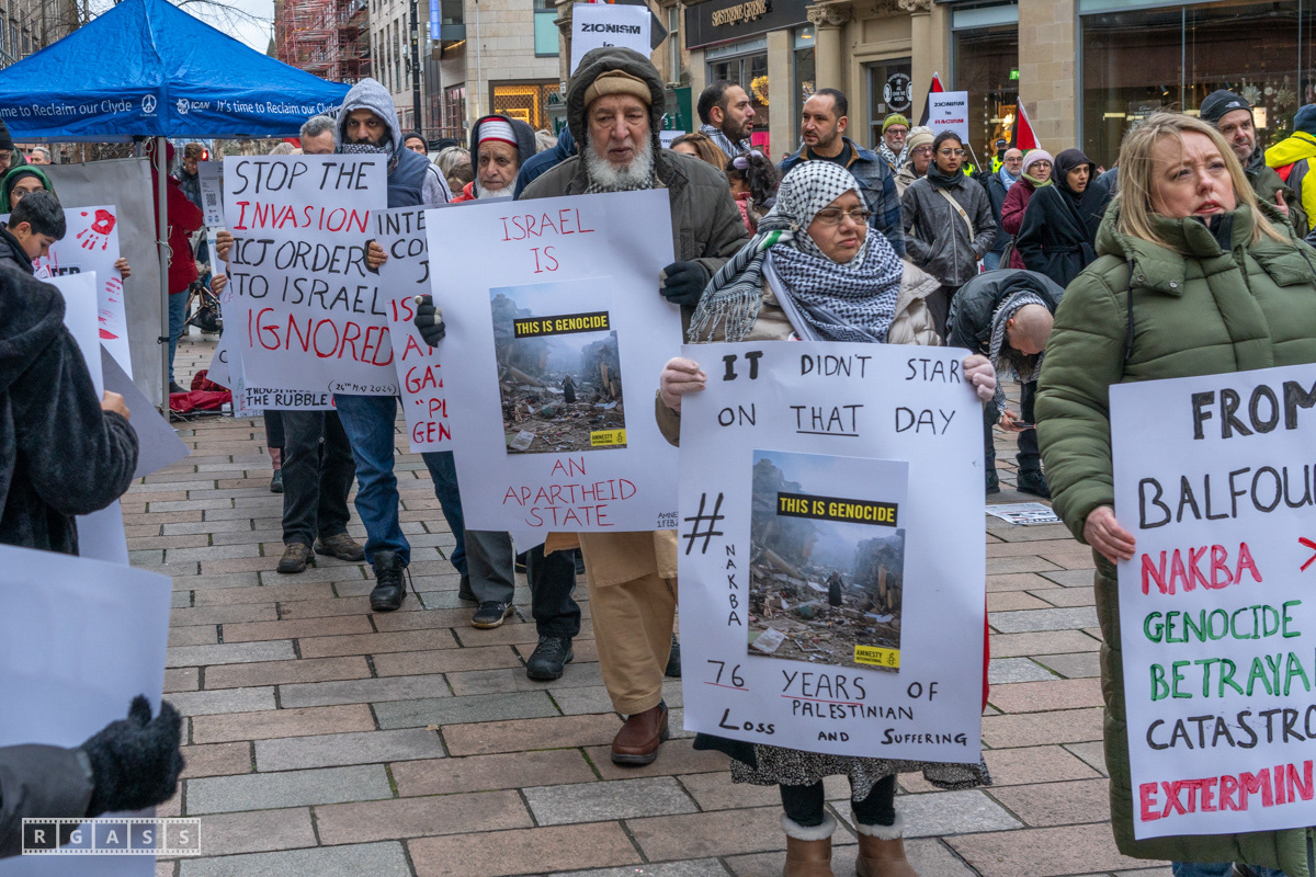 7th December 2024. Glasgow. Pro Palestine protesters after their rally at the Buchanan Steps march along Buchanan Street with a variety of descriptive placards.