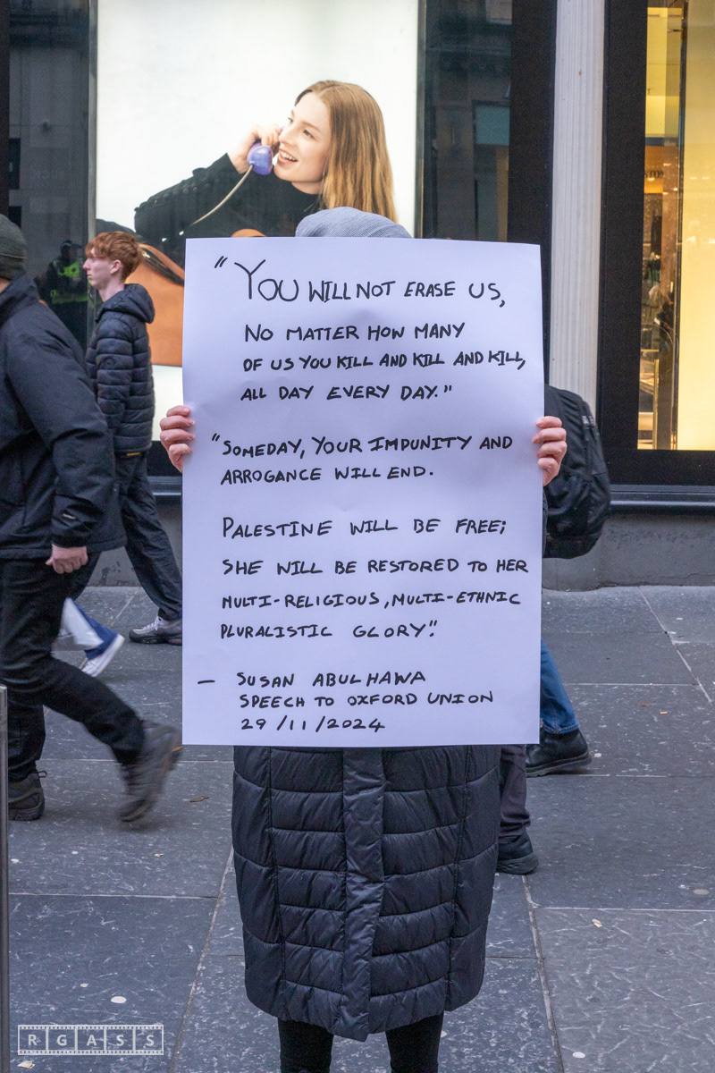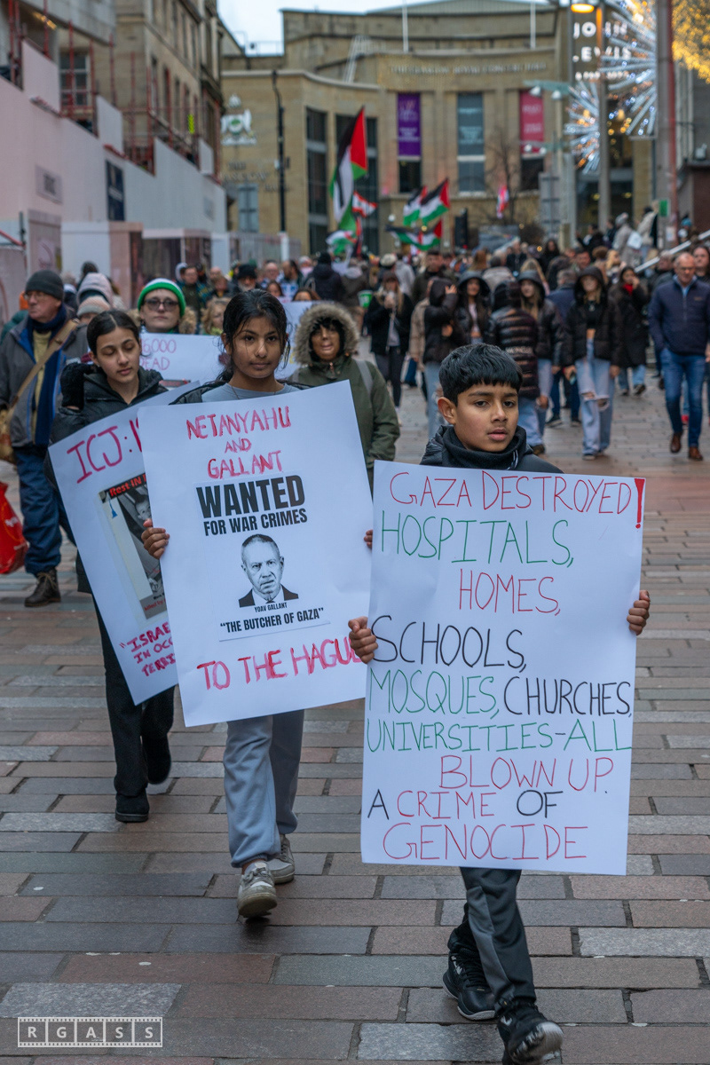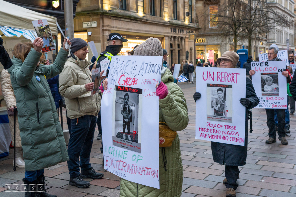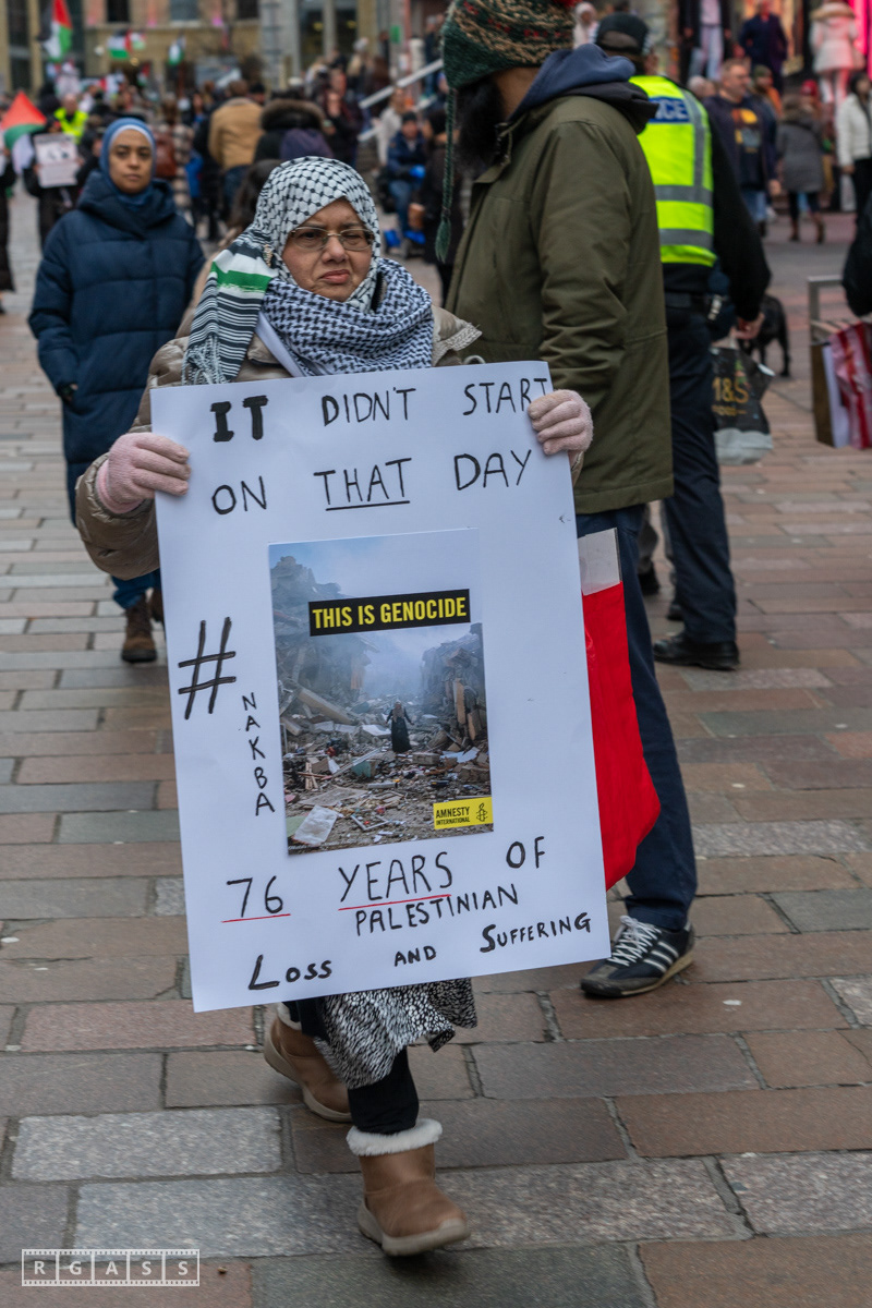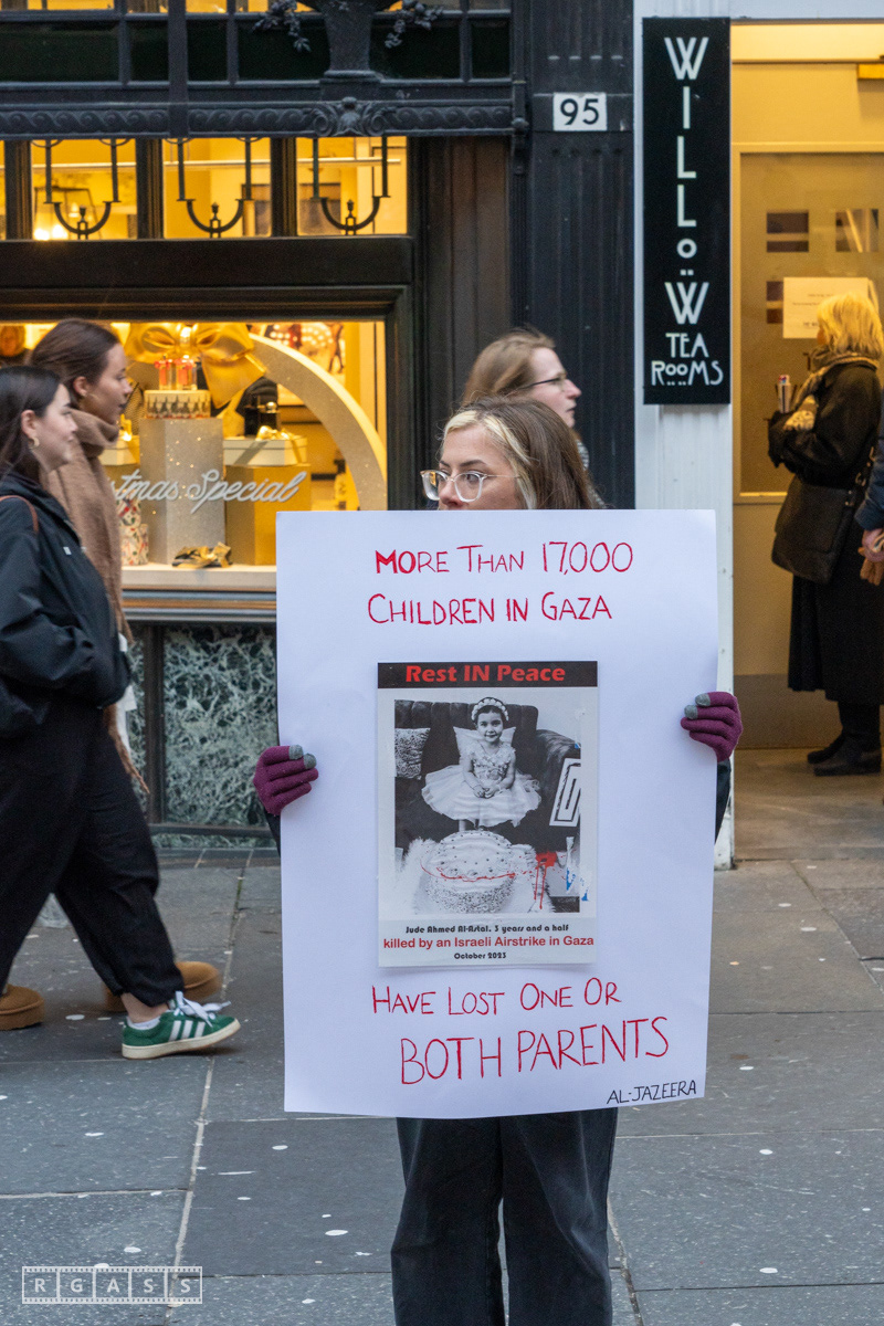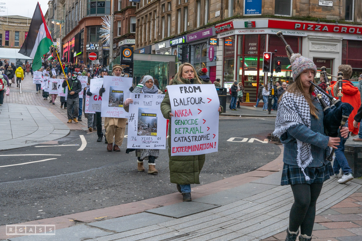 7th December 2024. Glasgow. Pro Palestine protesters after their rally at the Buchanan Steps march along Buchanan Street with a variety of descriptive placards.