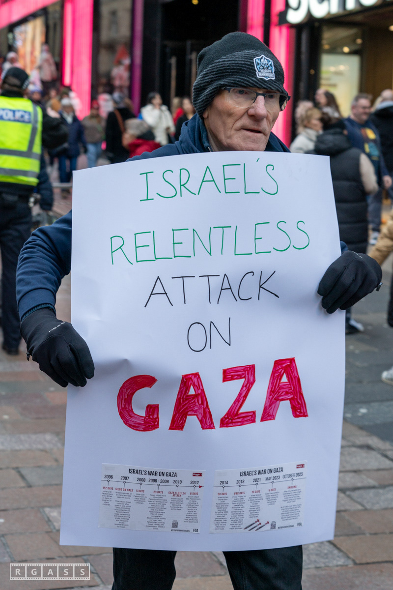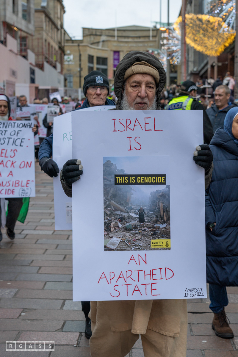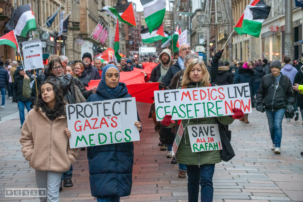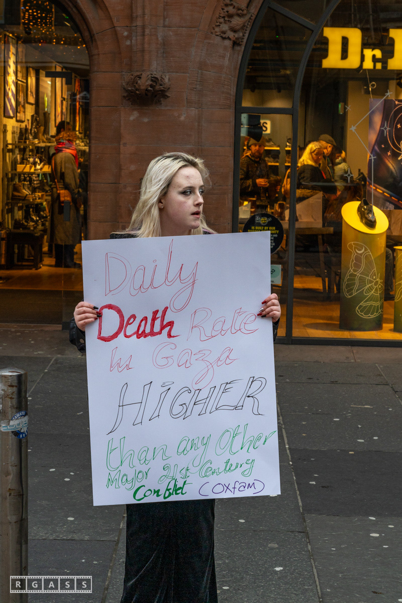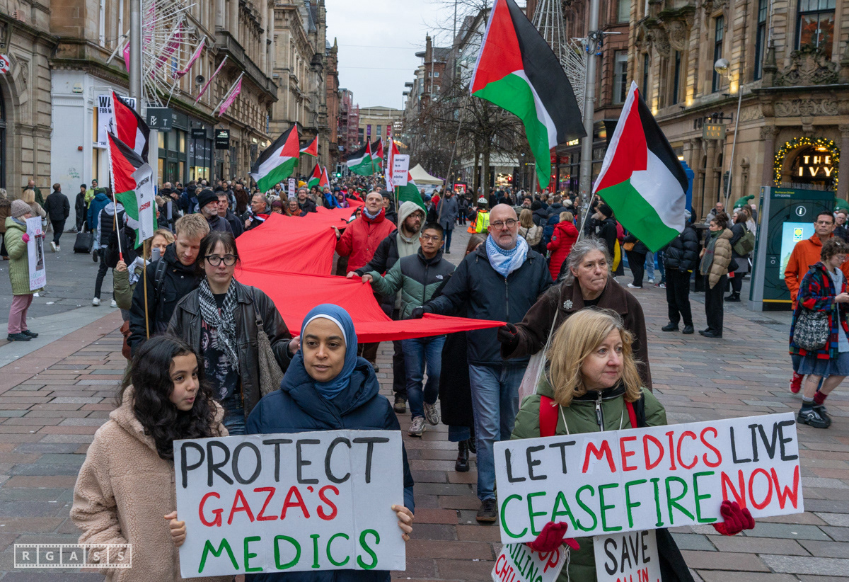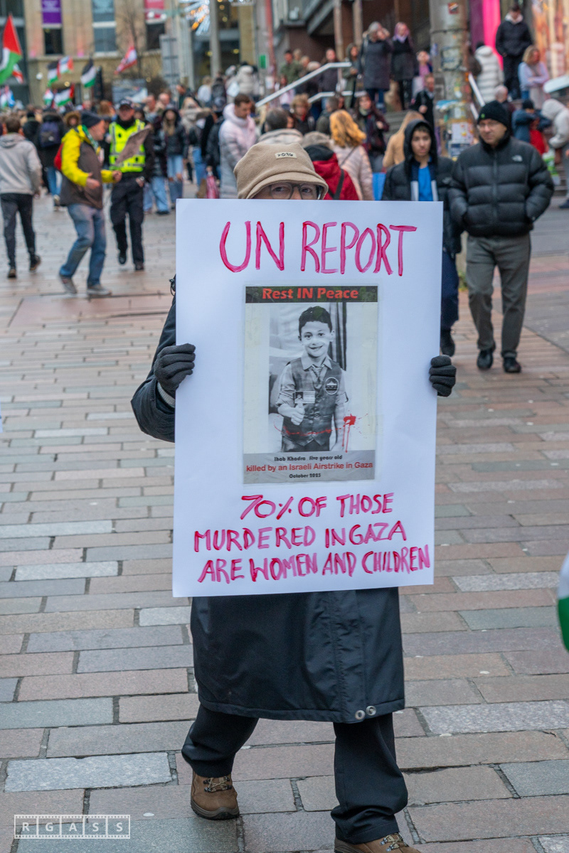 7th December 2024. Glasgow. Pro Palestine protesters after their rally at the Buchanan Steps march along Buchanan Street with a variety of descriptive placards.