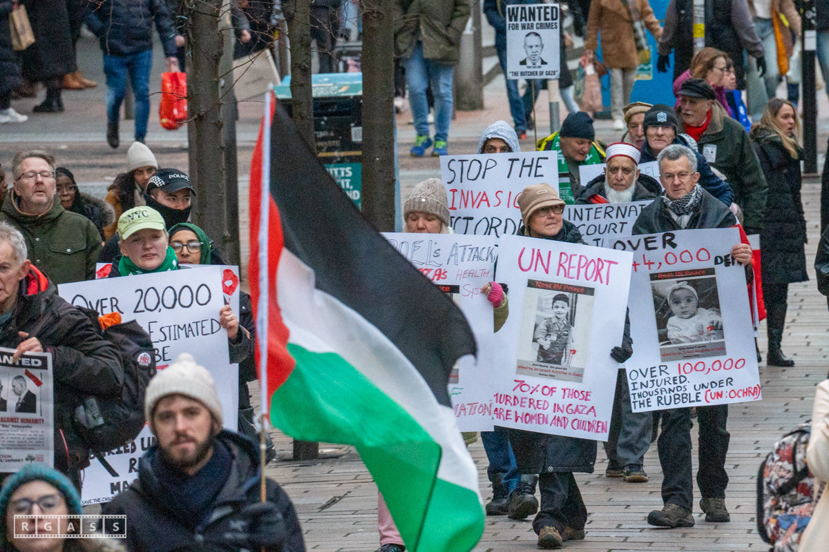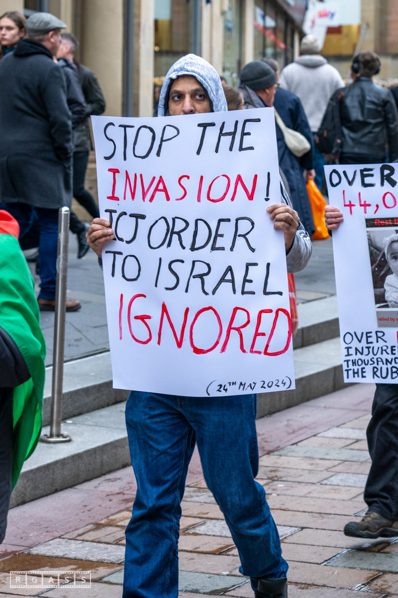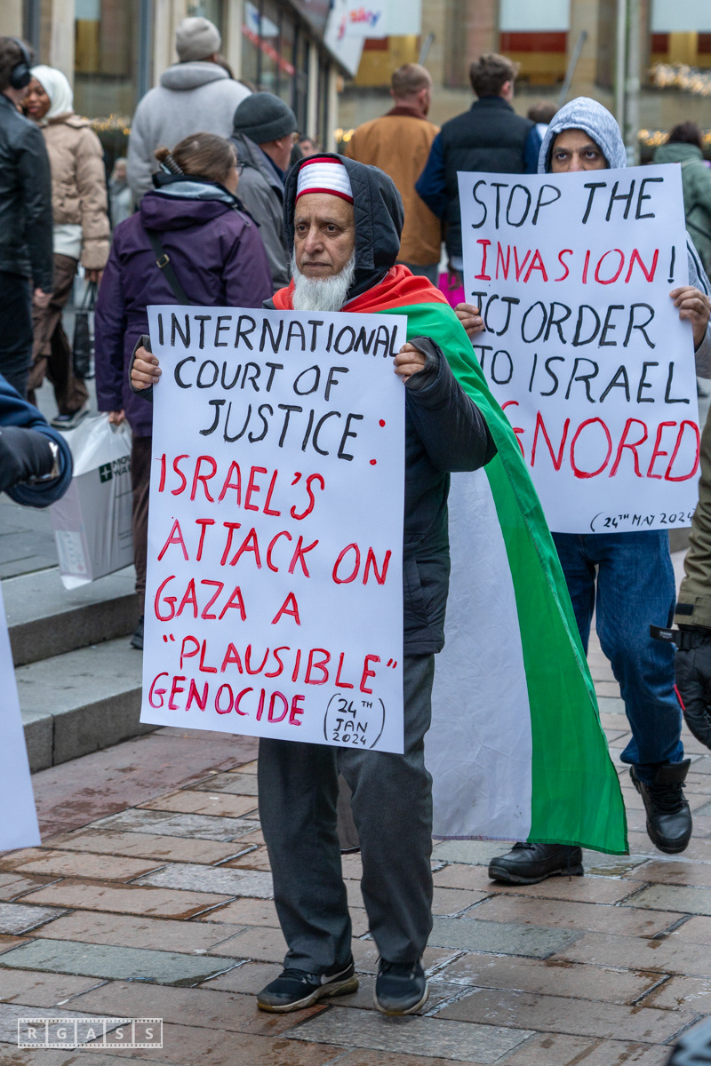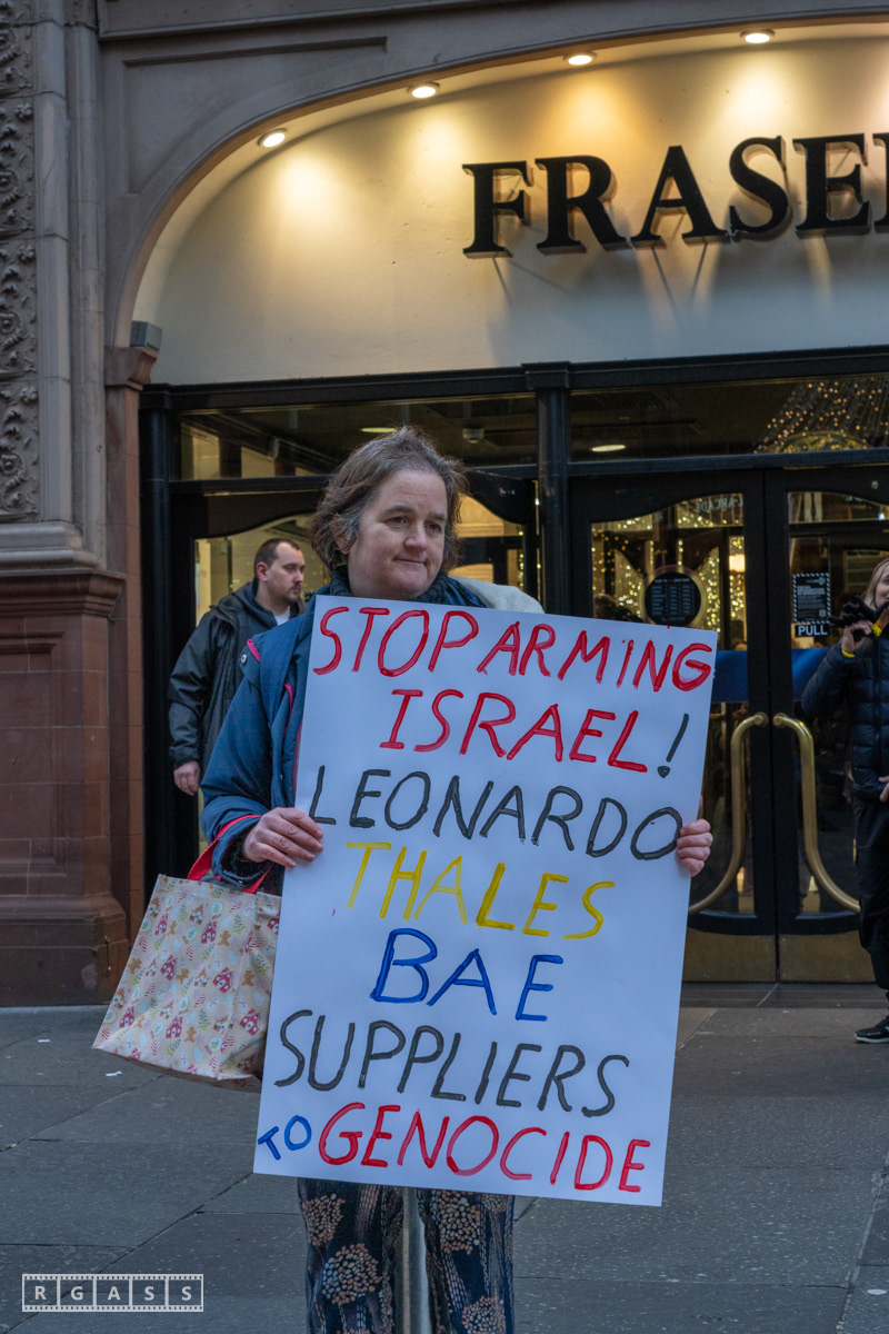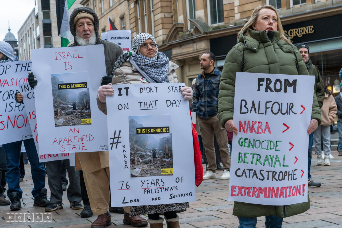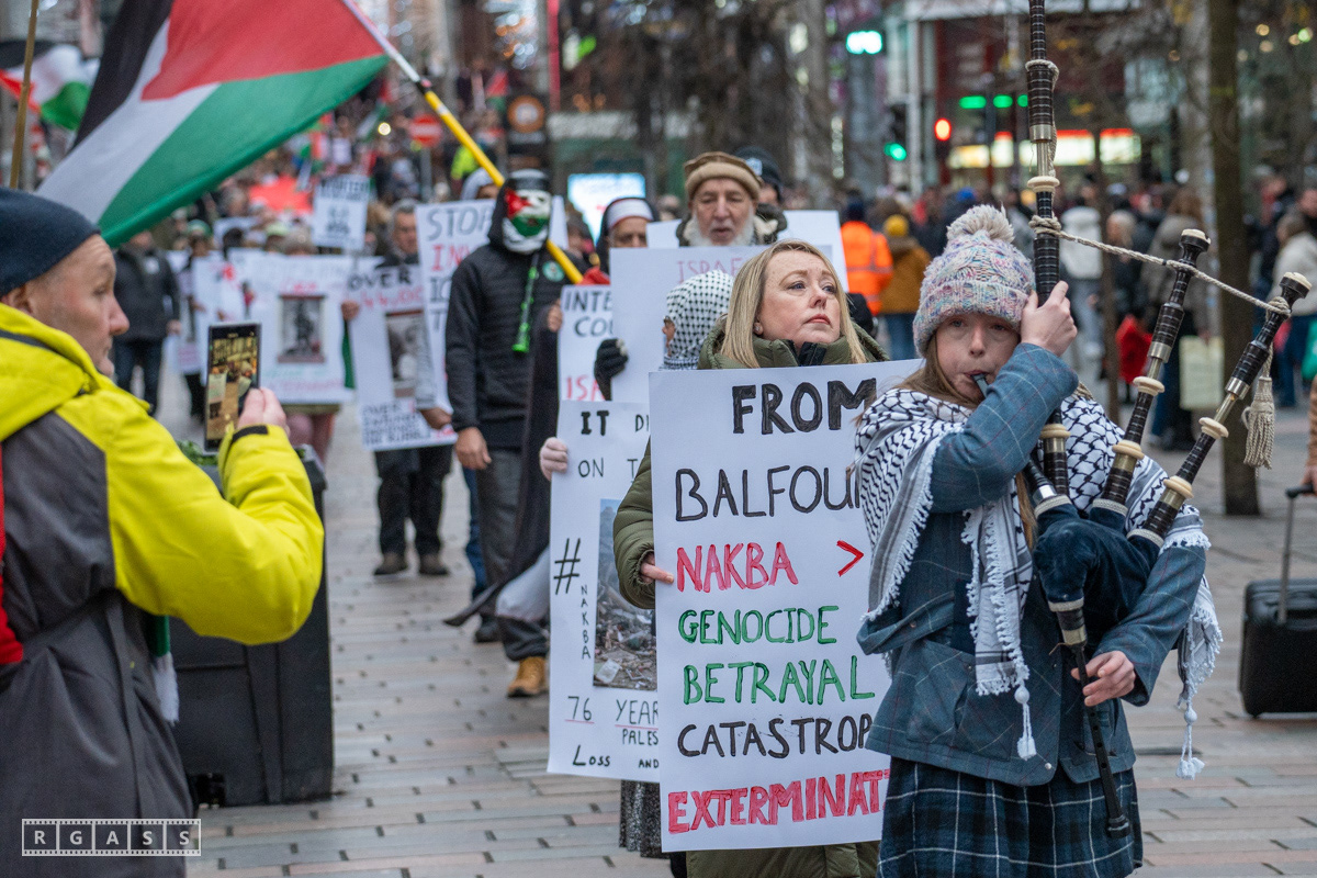 7th December 2024. Glasgow. Pro Palestine protesters after their rally at the Buchanan Steps march along Buchanan Street with a variety of descriptive placards.