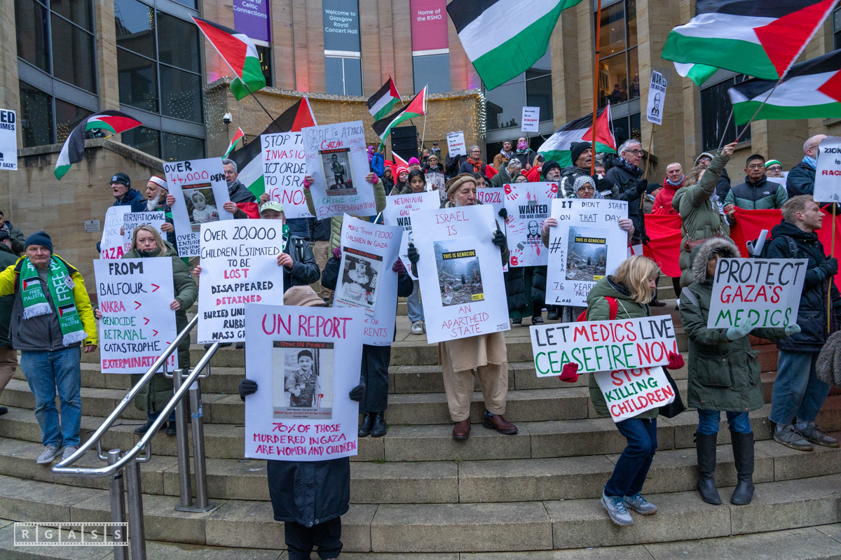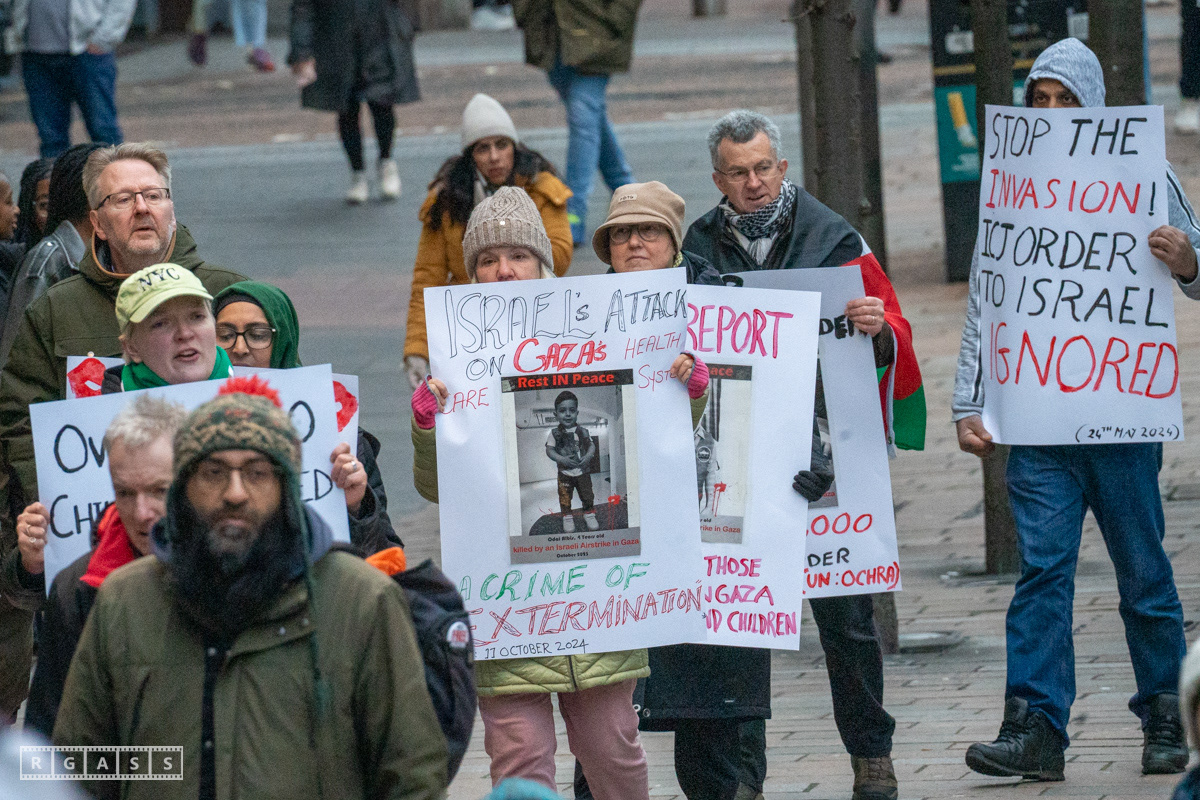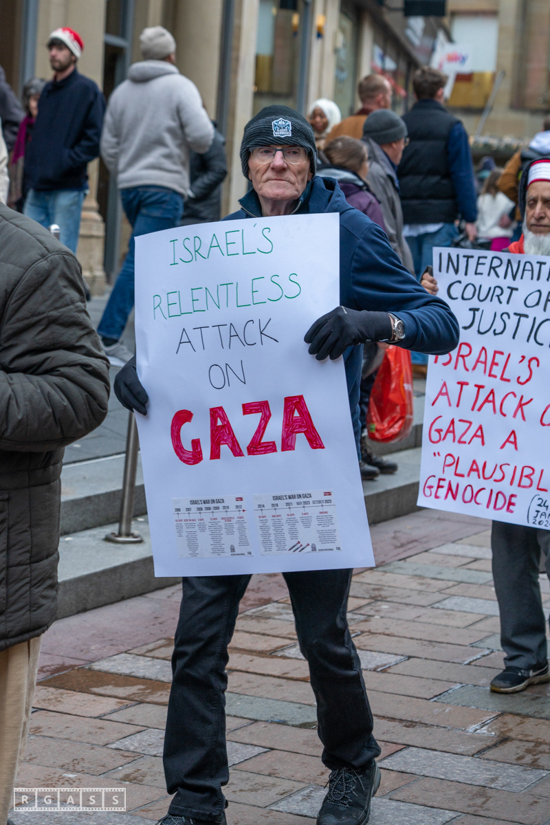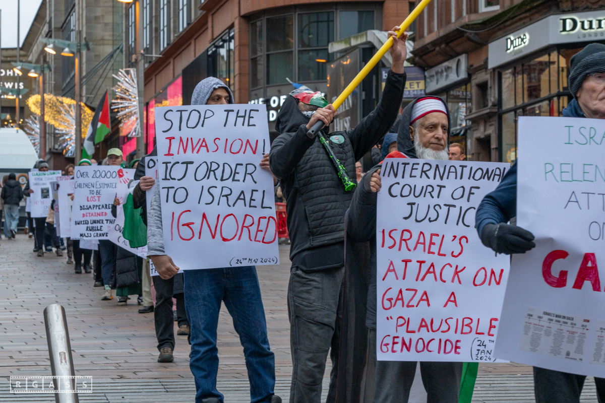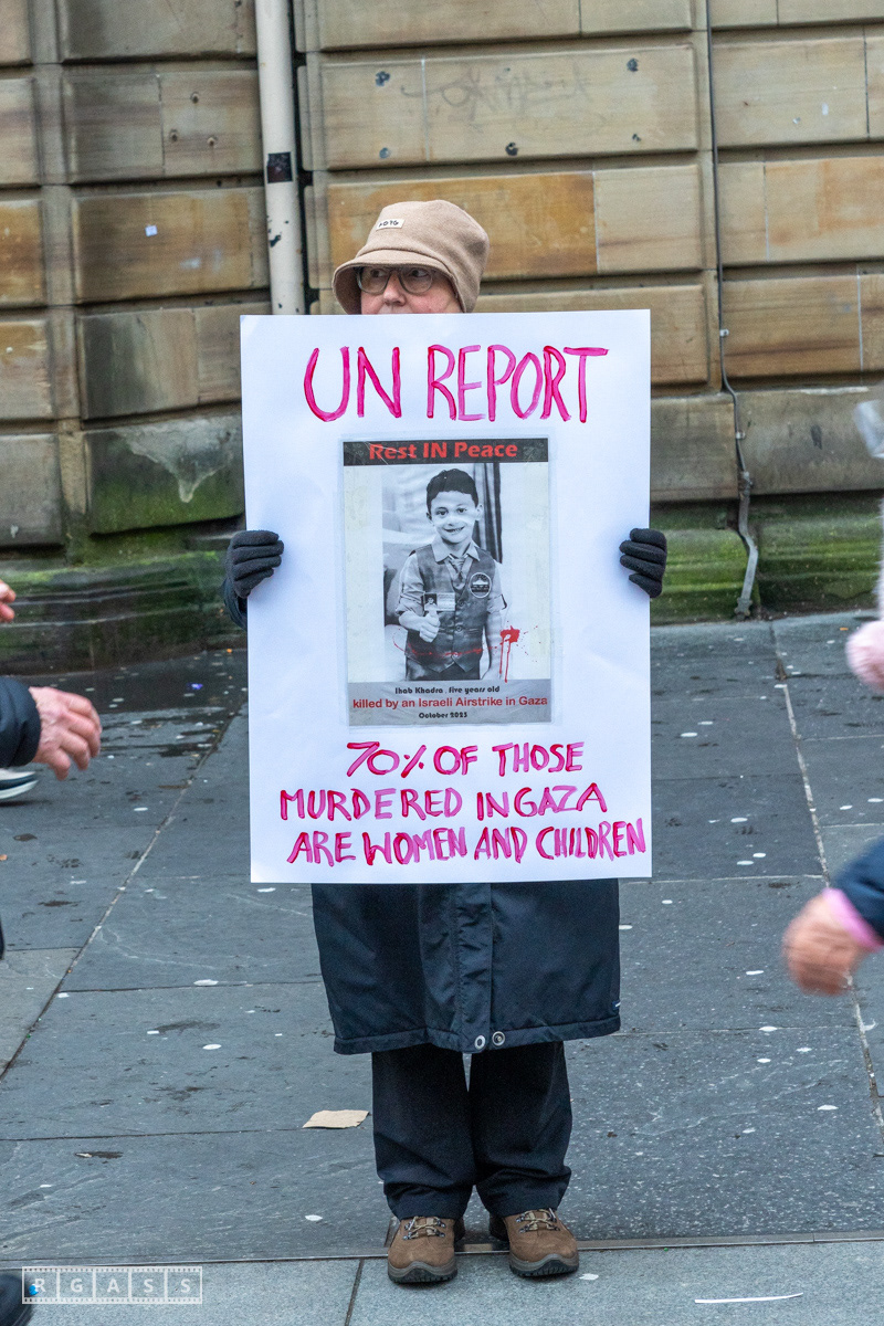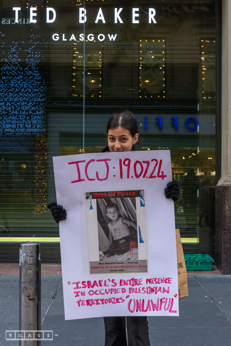 7th December 2024. Glasgow. Pro Palestine protesters after their rally at the Buchanan Steps march along Buchanan Street with a variety of descriptive placards.