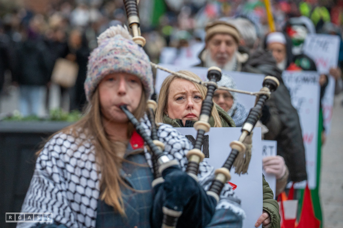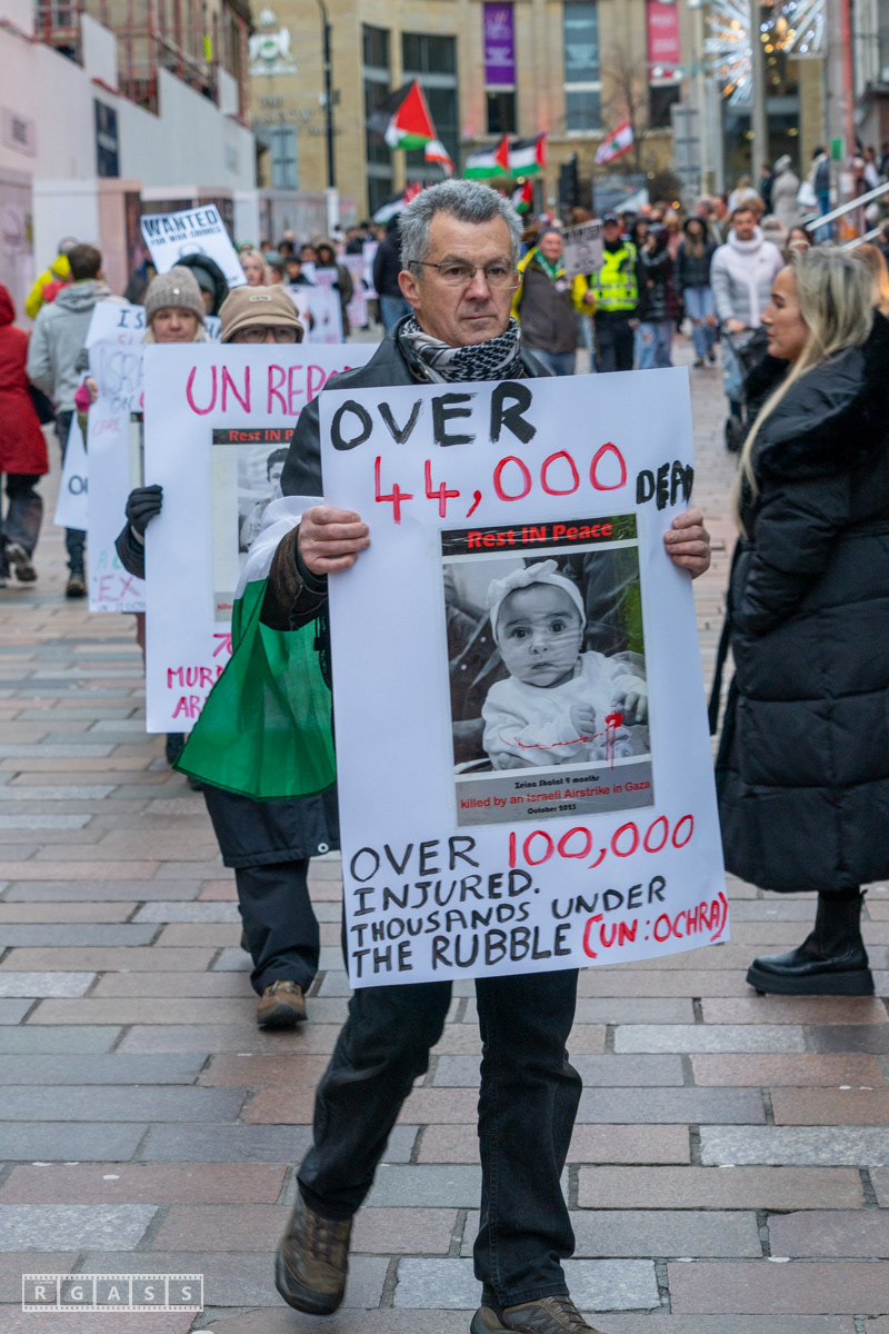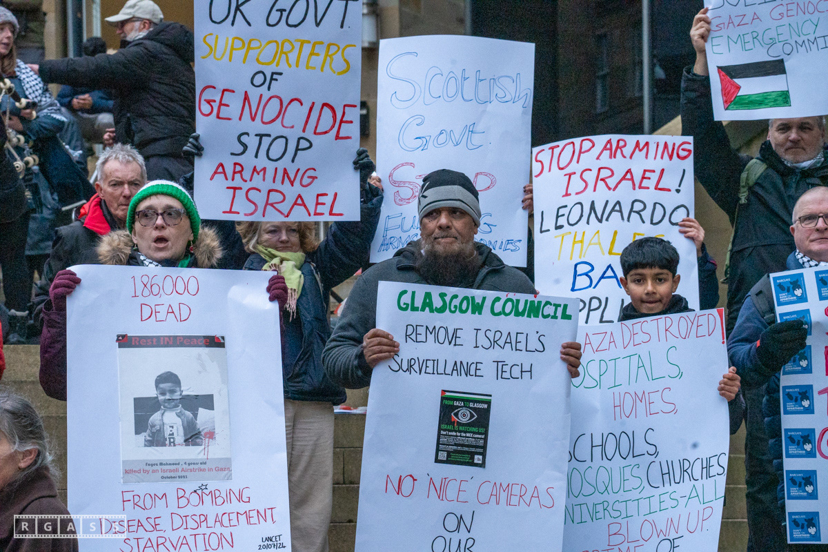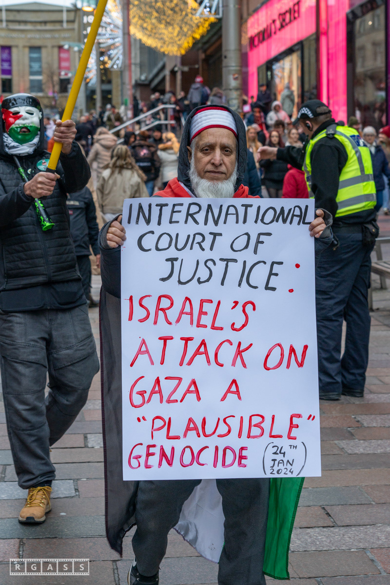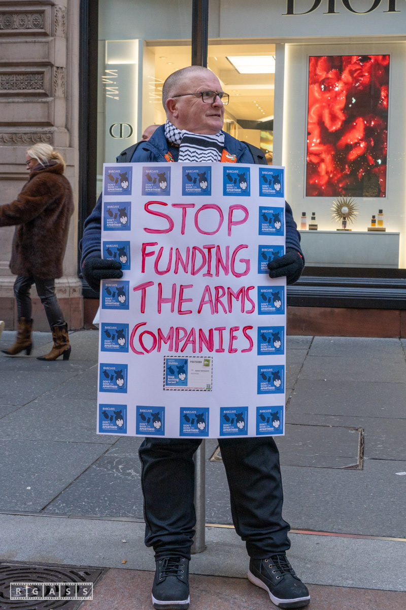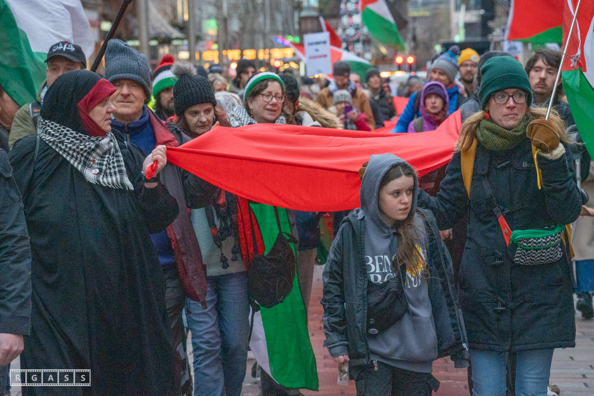7th December 2024. Glasgow. Pro Palestine protesters after their rally at the Buchanan Steps march along Buchanan Street with a variety of descriptive placards.