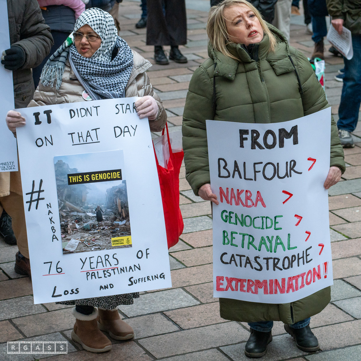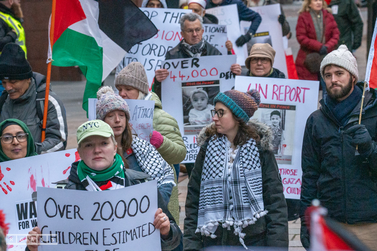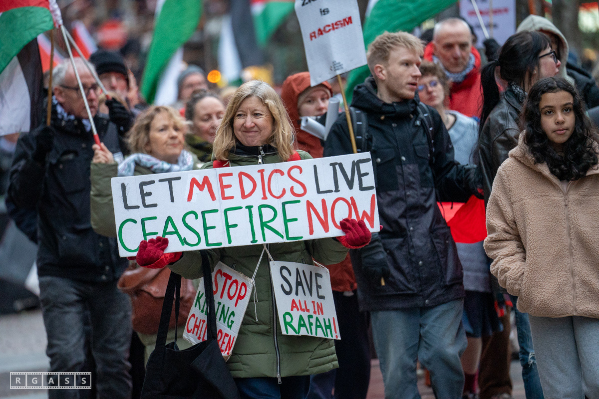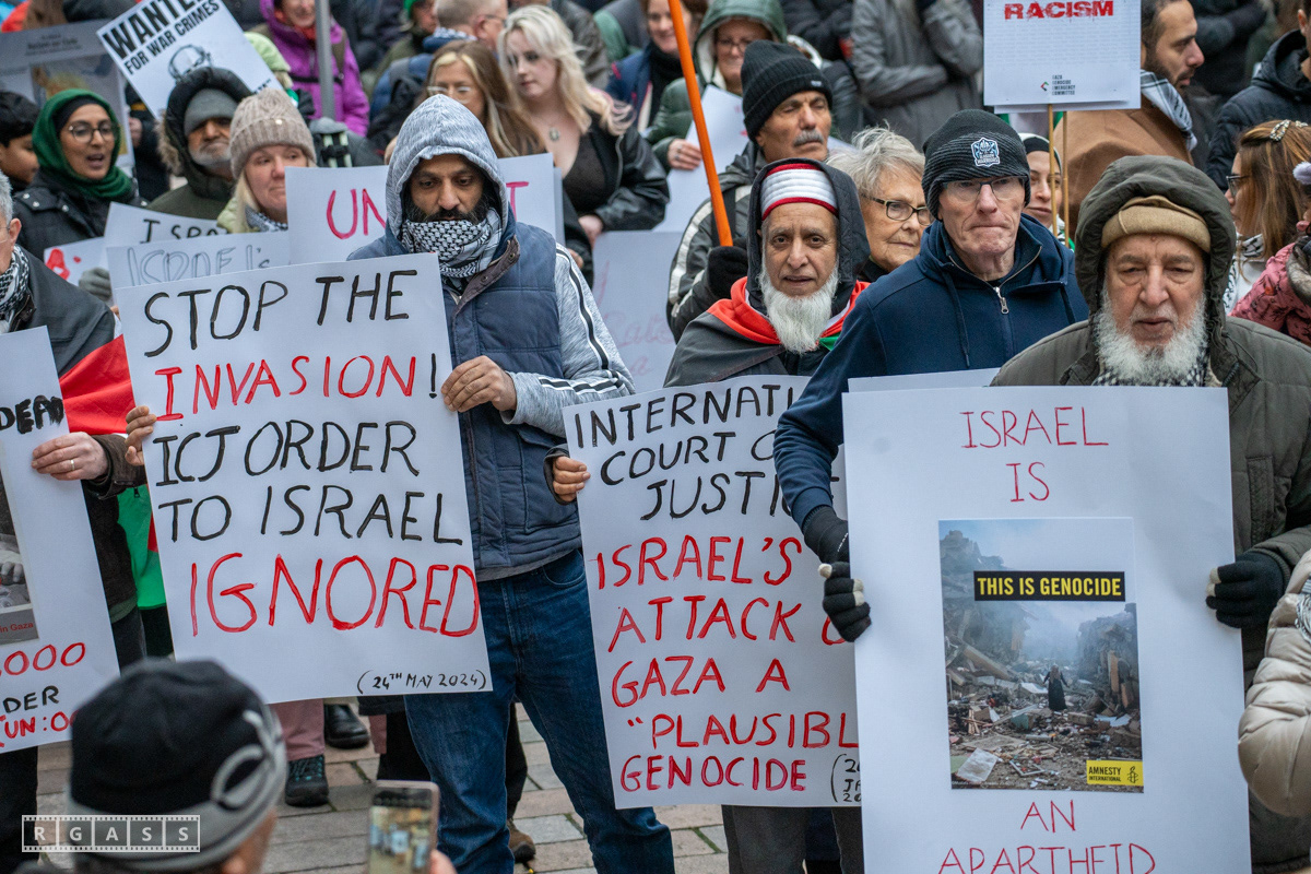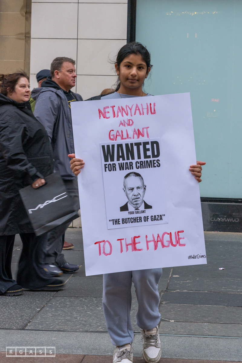 7th December 2024. Glasgow. Pro Palestine protesters after their rally at the Buchanan Steps march along Buchanan Street with a variety of descriptive placards.
