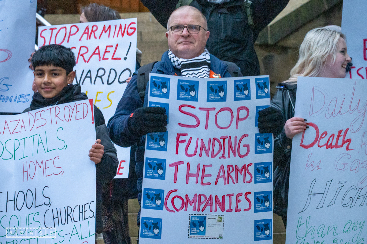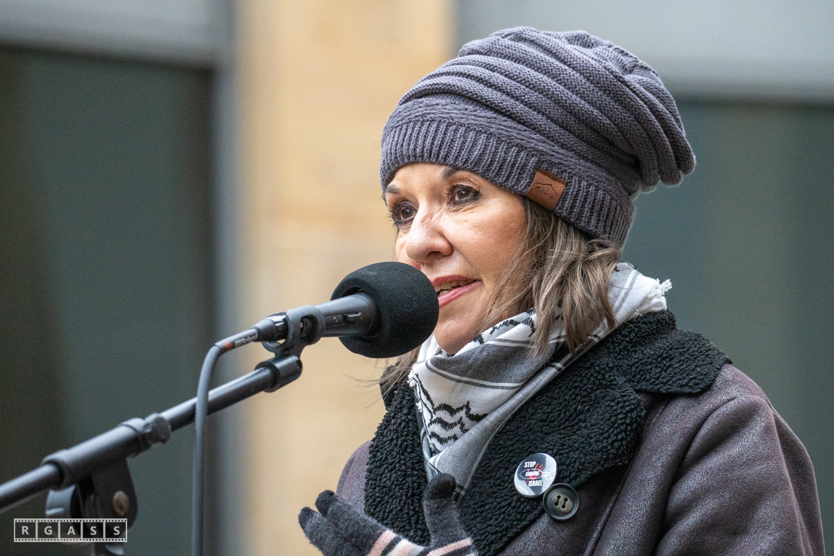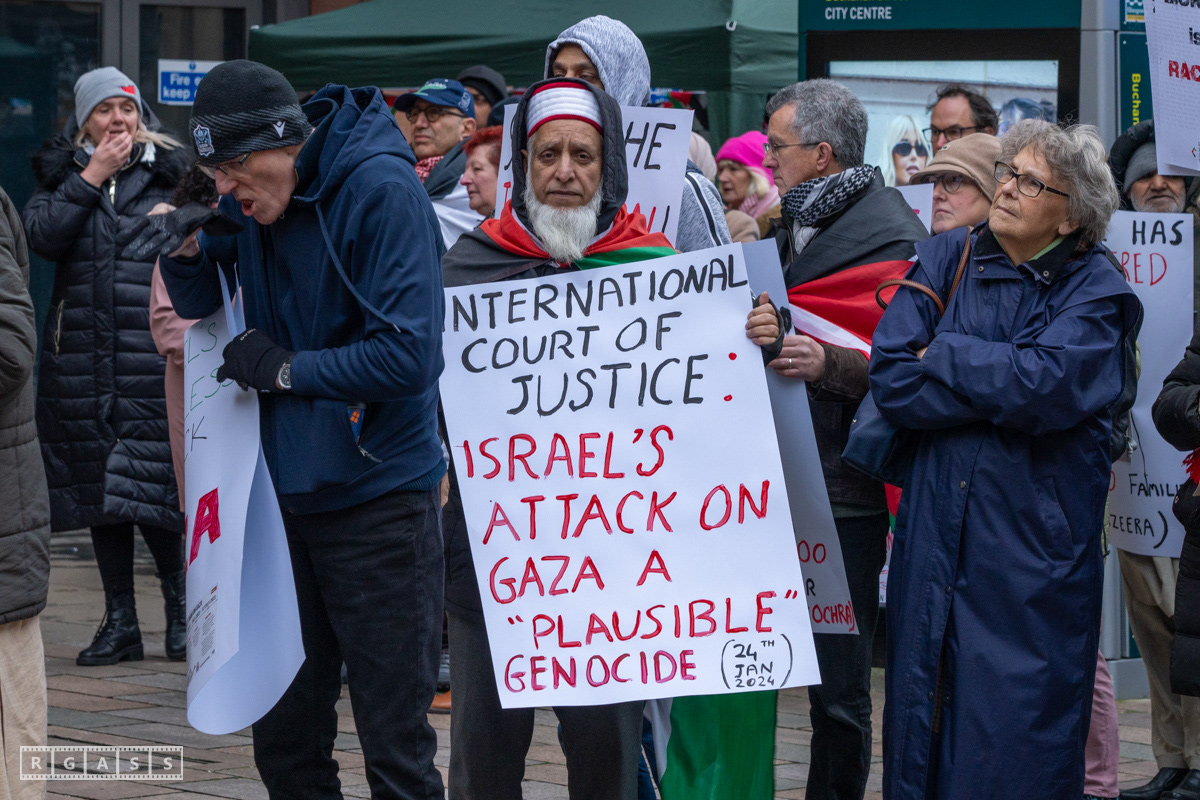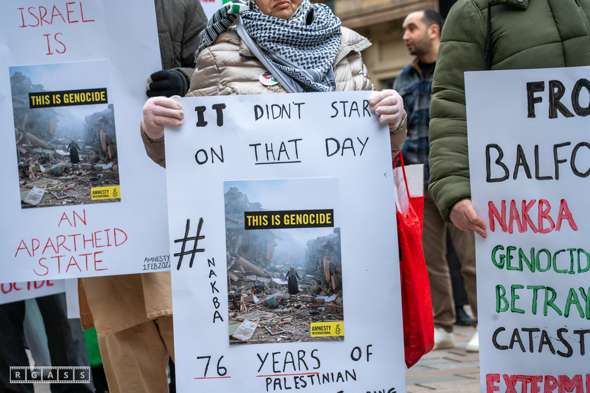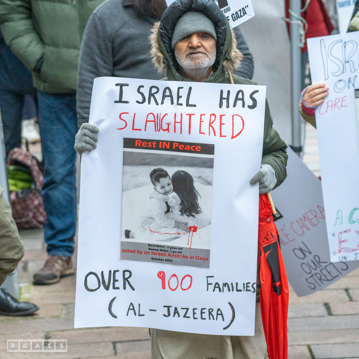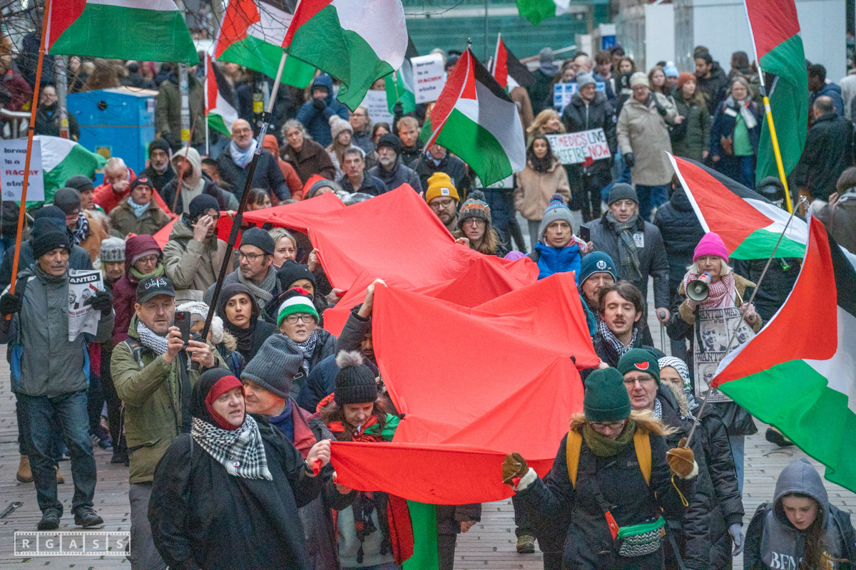 7th December 2024. Glasgow. Pro Palestine protesters after their rally at the Buchanan Steps march along Buchanan Street with a variety of descriptive placards.