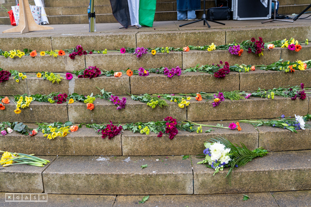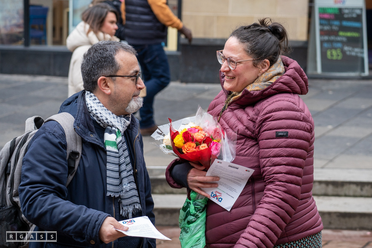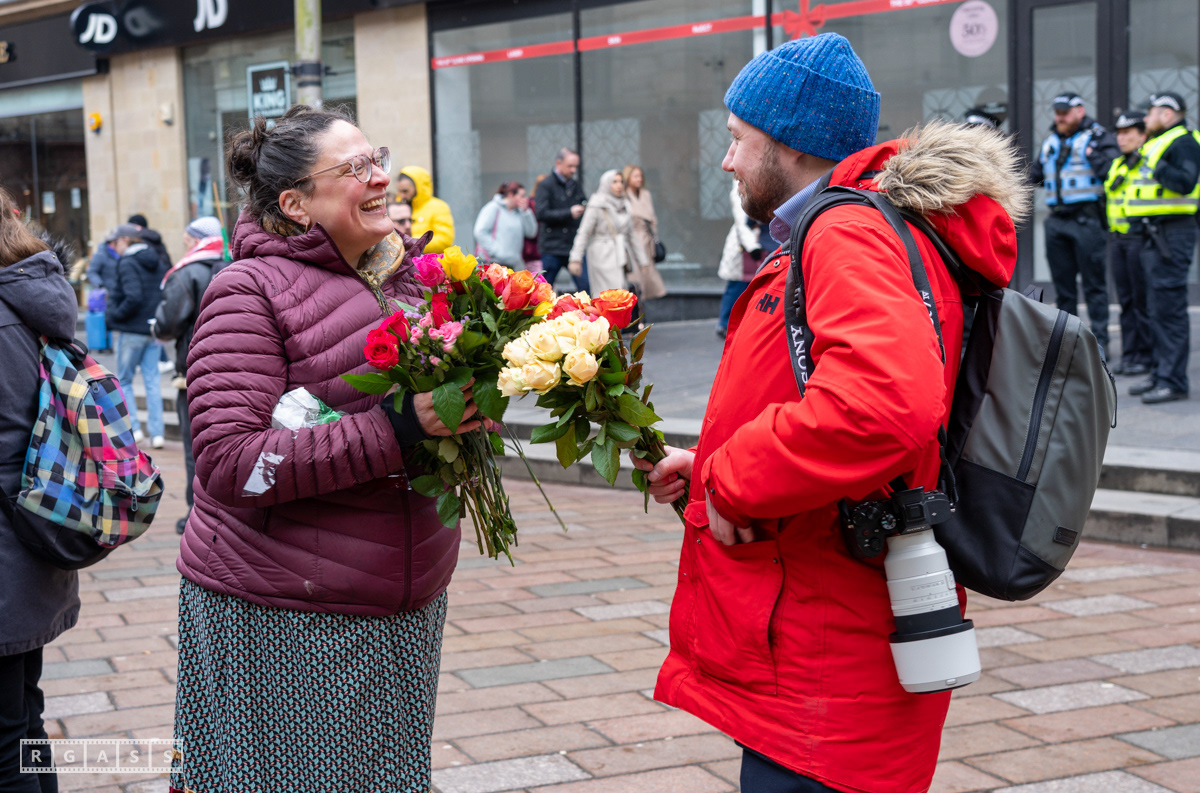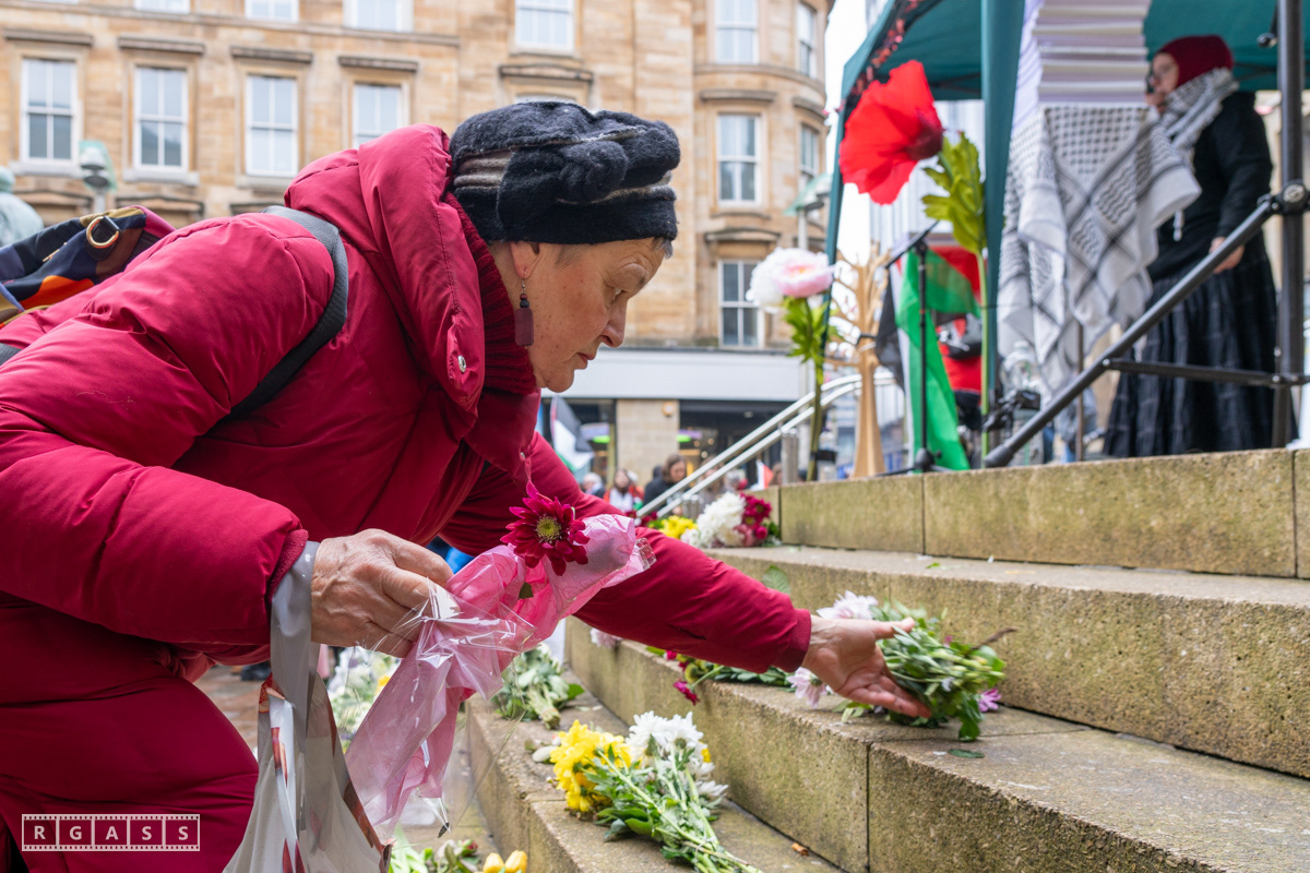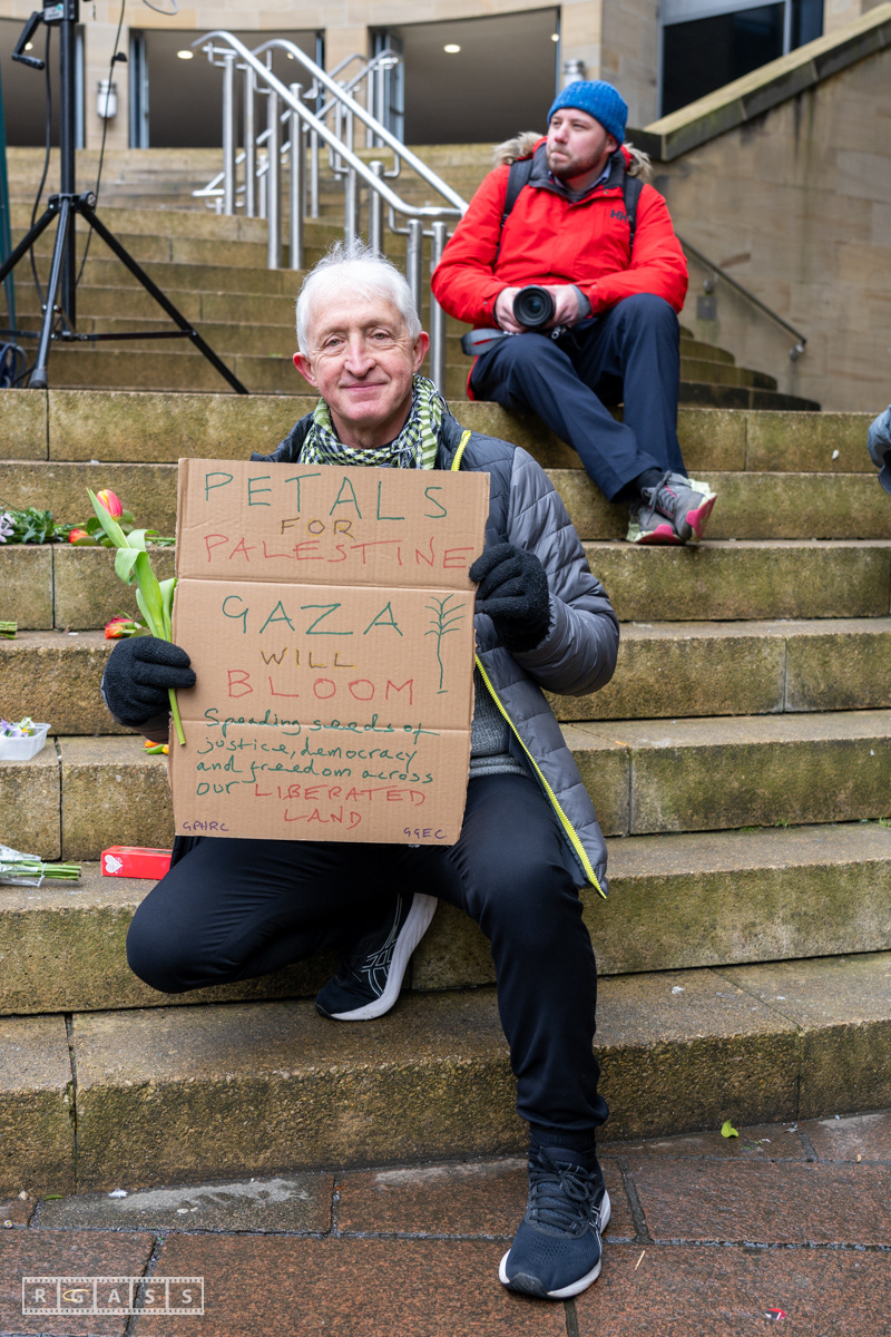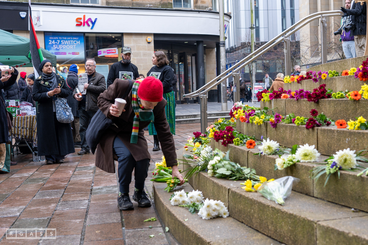 Glasgow. 15th February 2025. 'Petals For Palestine' ' at the steps of the Buchanan Galleries.