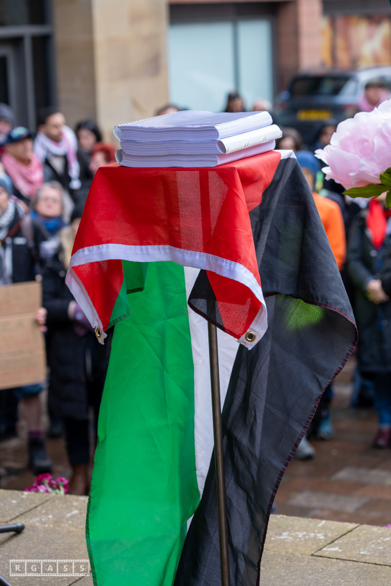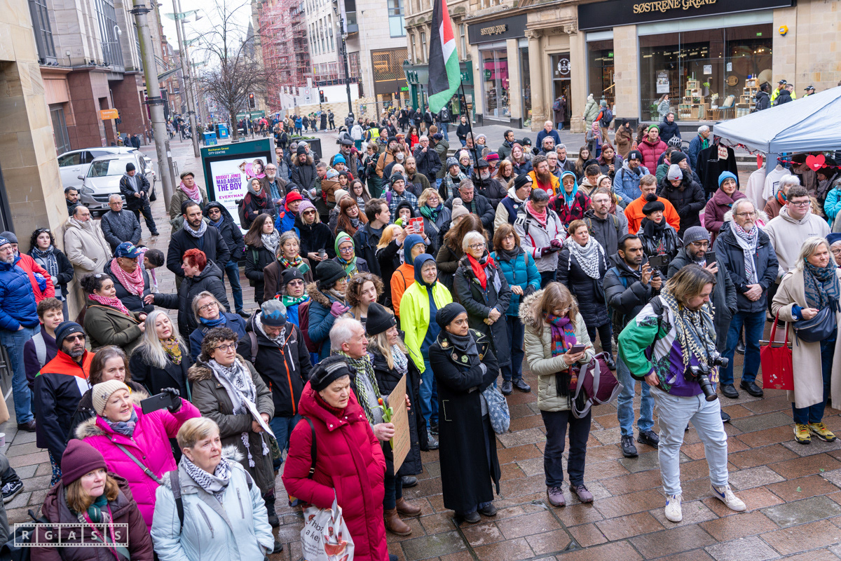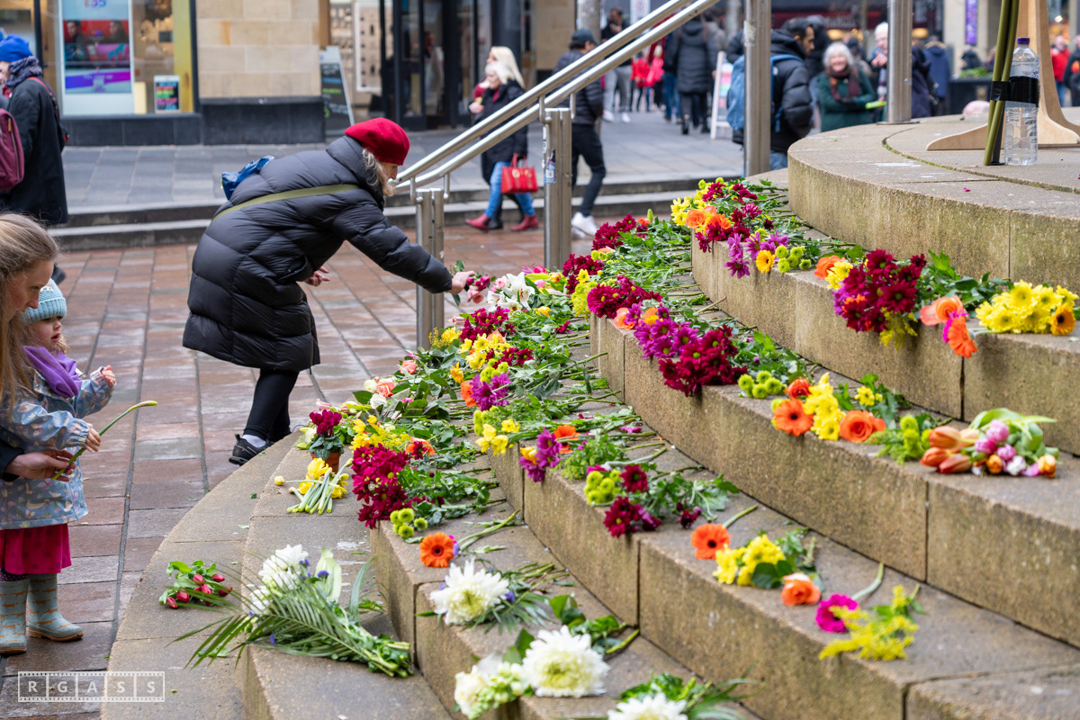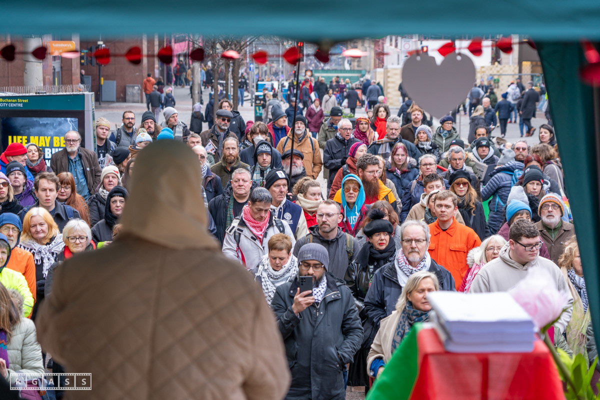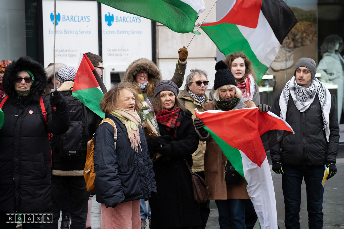 Glasgow. 15th February 2025. 'Petals For Palestine' ' at the steps of the Buchanan Galleries.