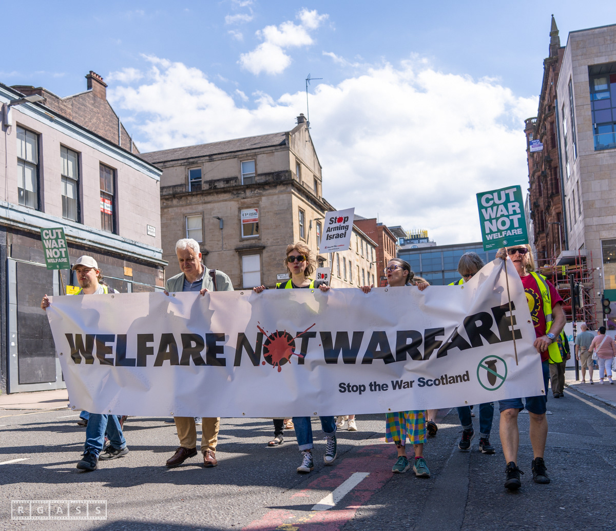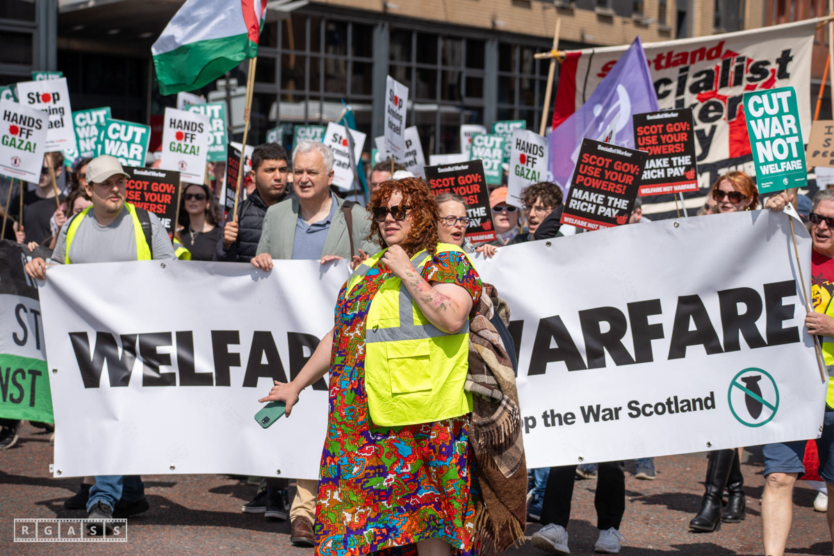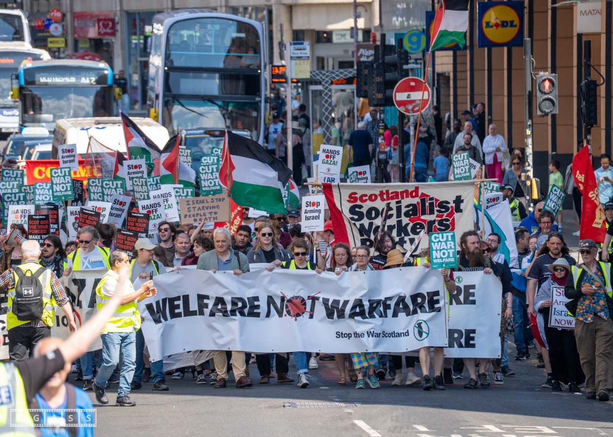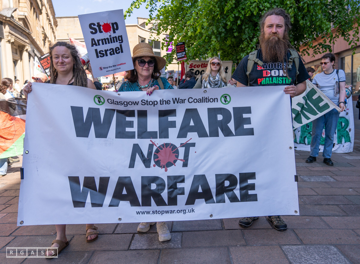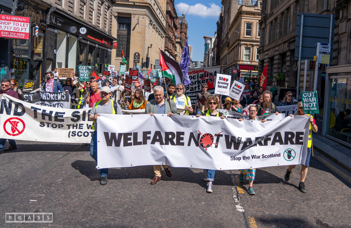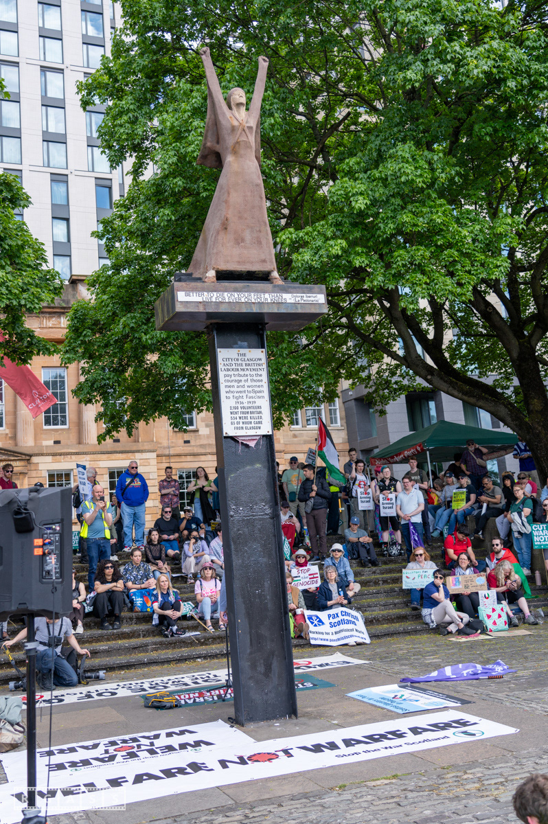 Glasgow, UK. 10 May 2025. Scottish CND and Glasgow Stop the War Coalition’s “Welfare Not Warfare” march and demonstration from the Buchannan Steps to La Pasionaria the Spanish civil war memorial.