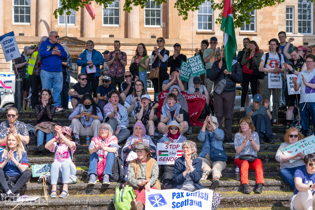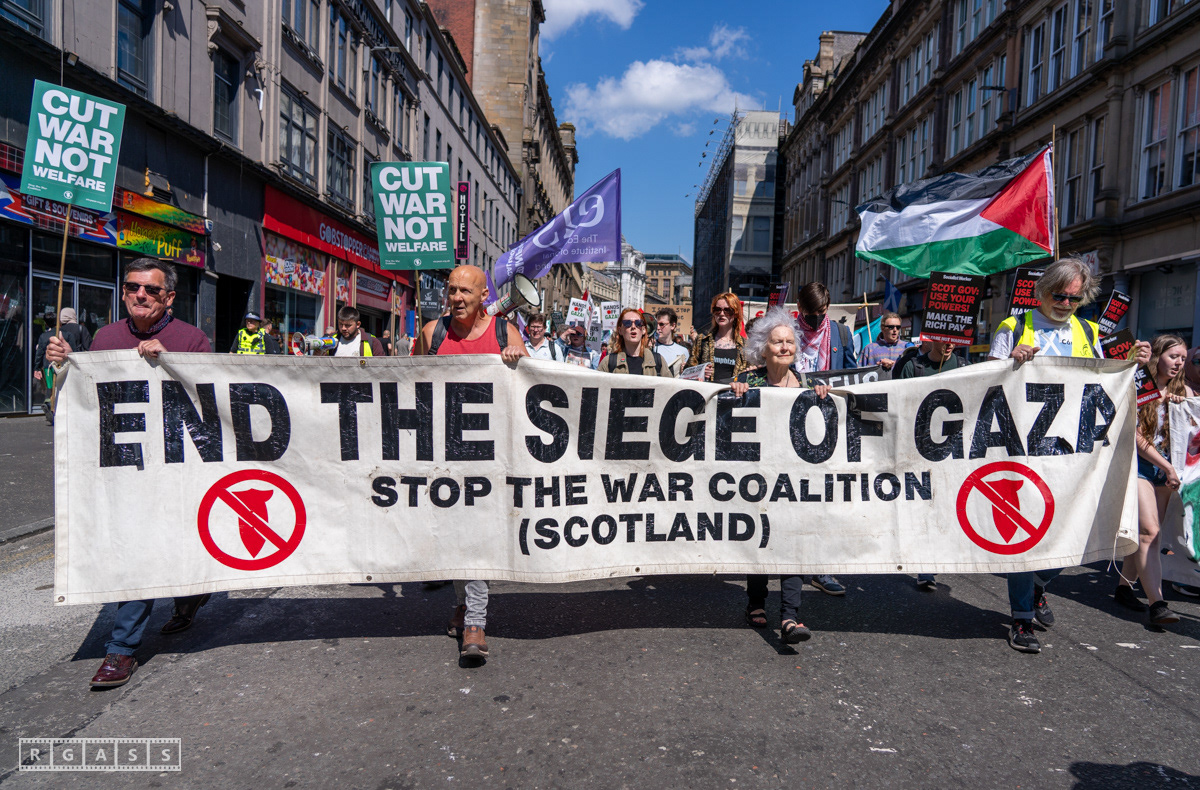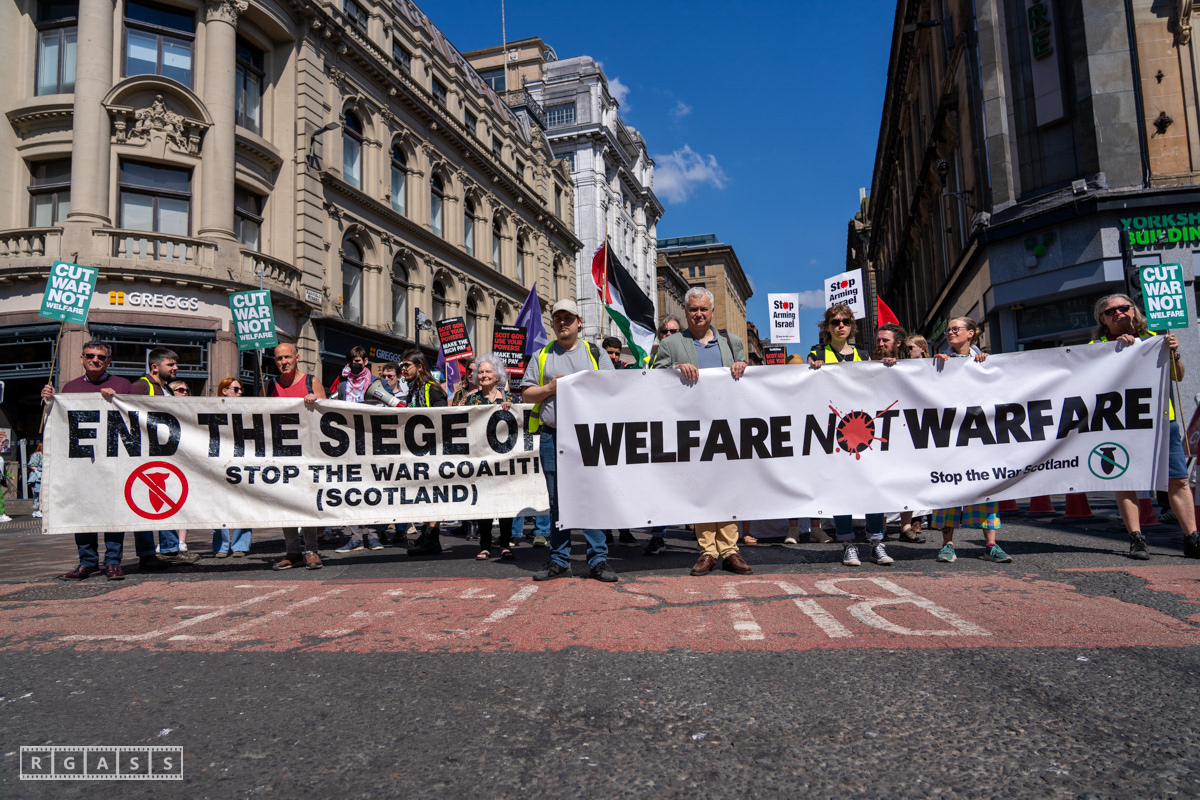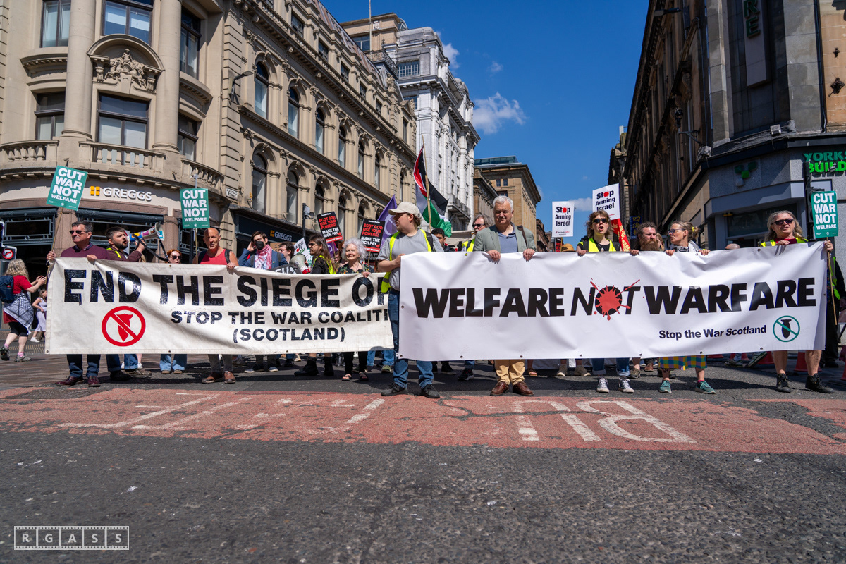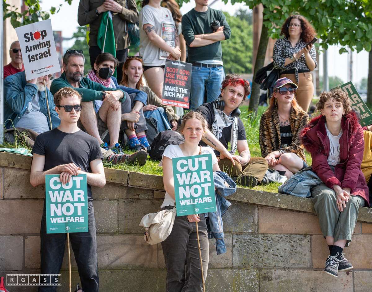 Glasgow, UK. 10 May 2025. Scottish CND and Glasgow Stop the War Coalition’s “Welfare Not Warfare” march and demonstration from the Buchannan Steps to La Pasionaria the Spanish civil war memorial.