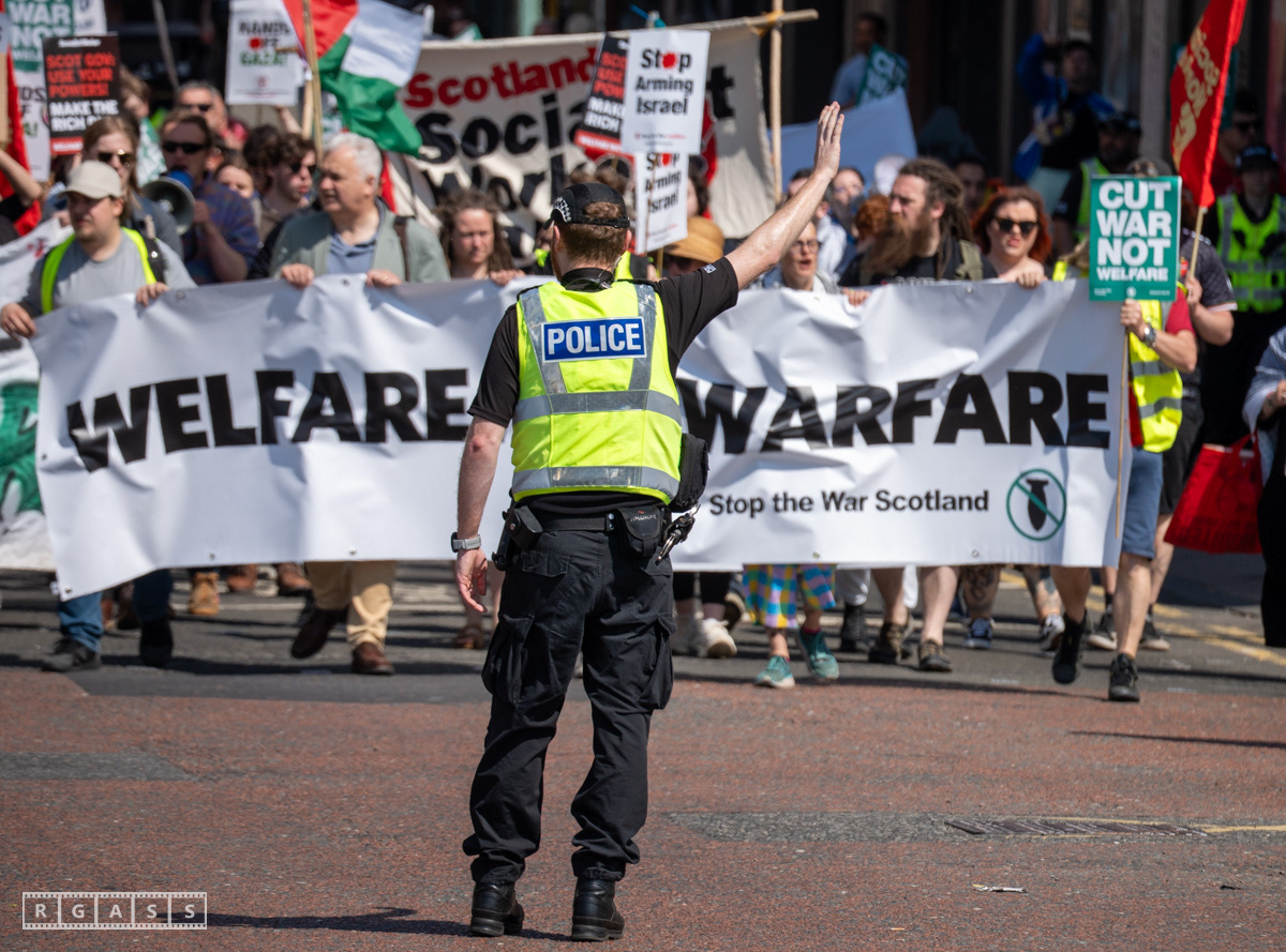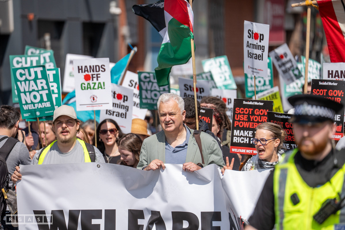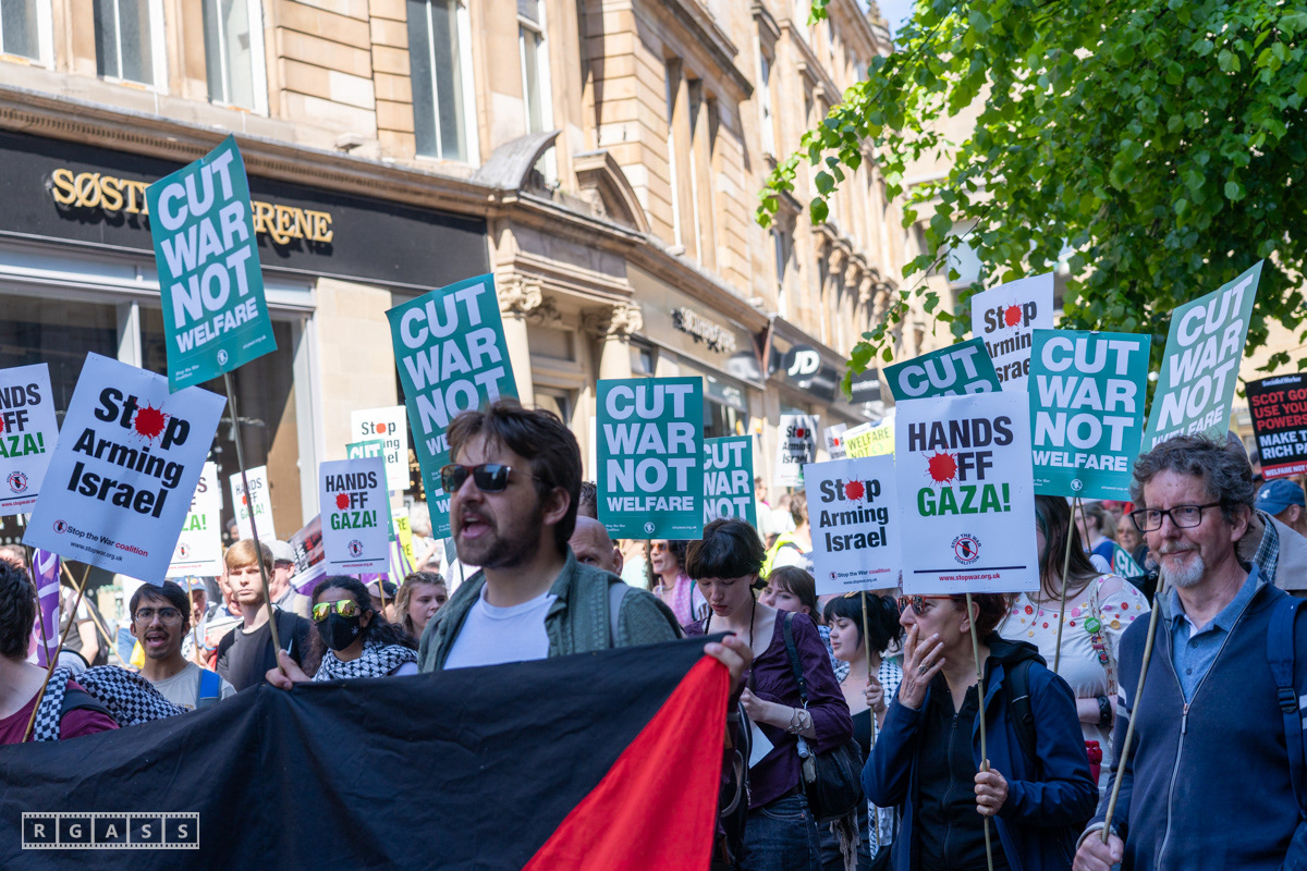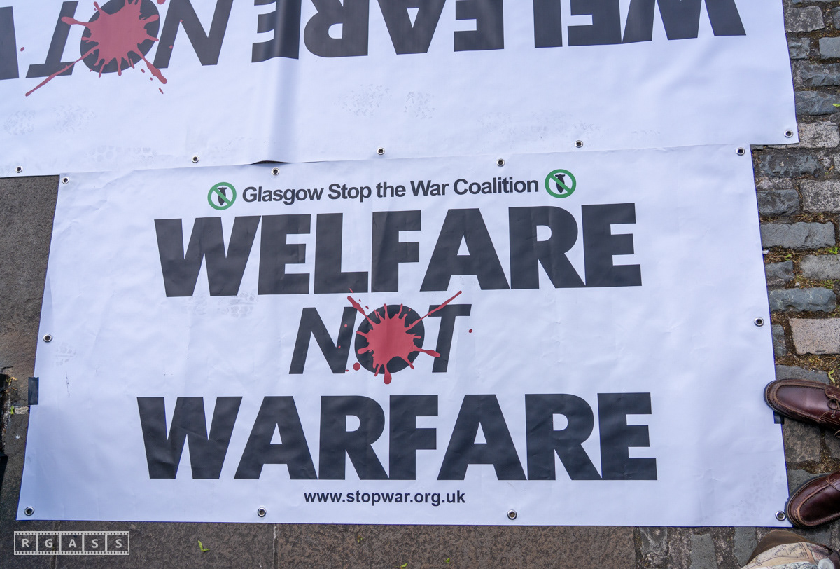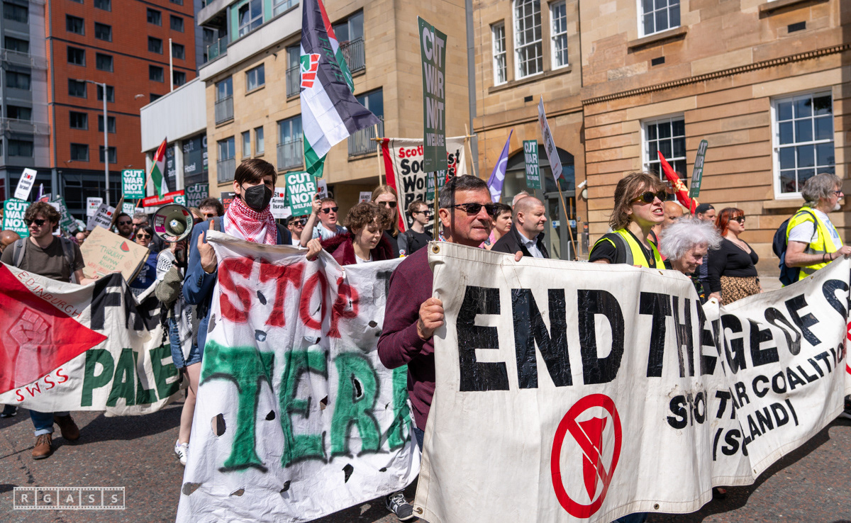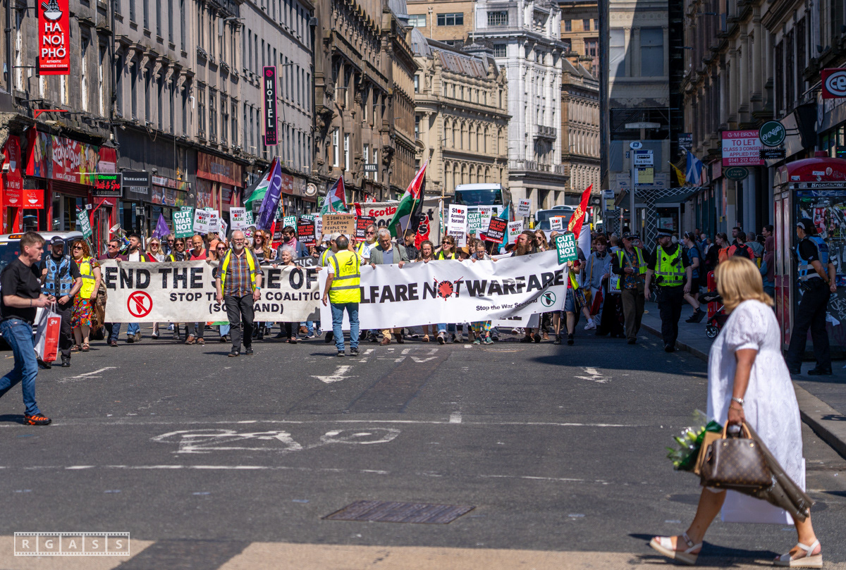 Glasgow, UK. 10 May 2025. Scottish CND and Glasgow Stop the War Coalition’s “Welfare Not Warfare” march and demonstration from the Buchannan Steps to La Pasionaria the Spanish civil war memorial.