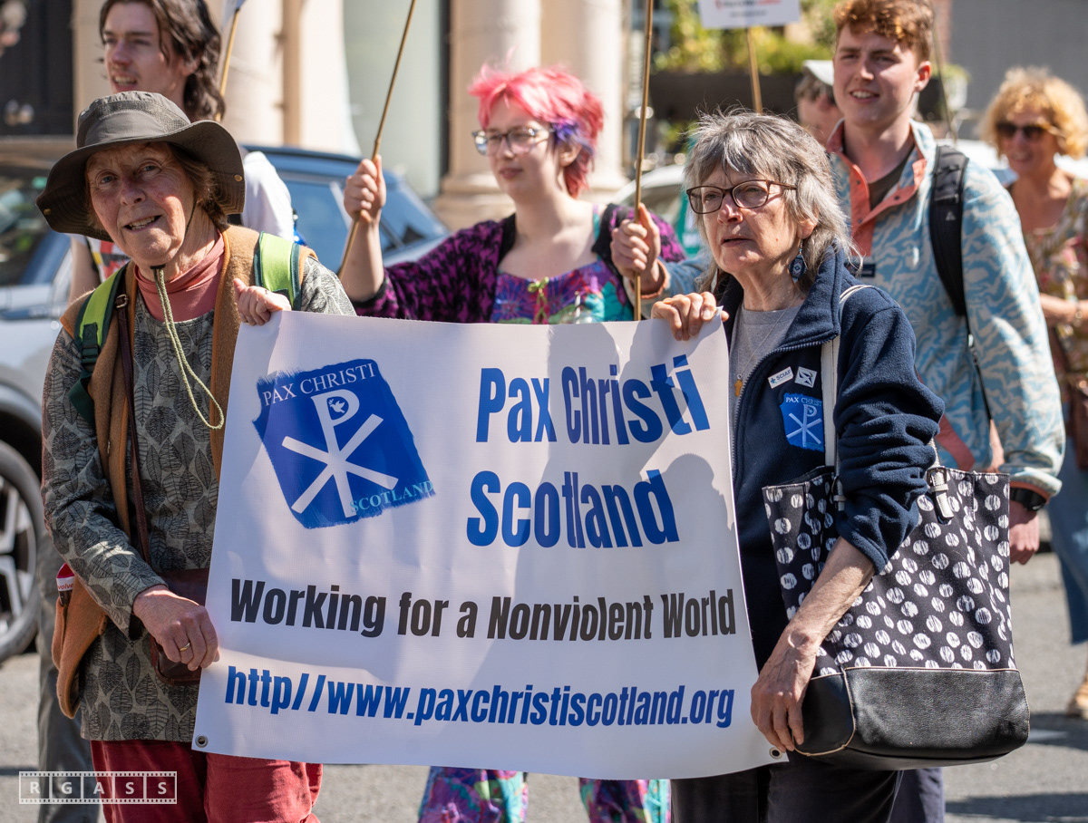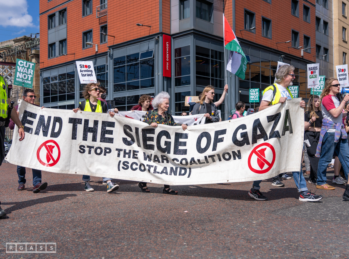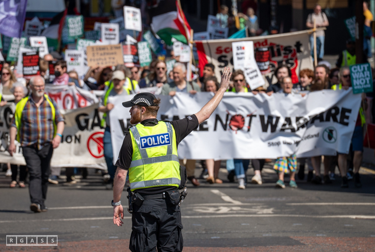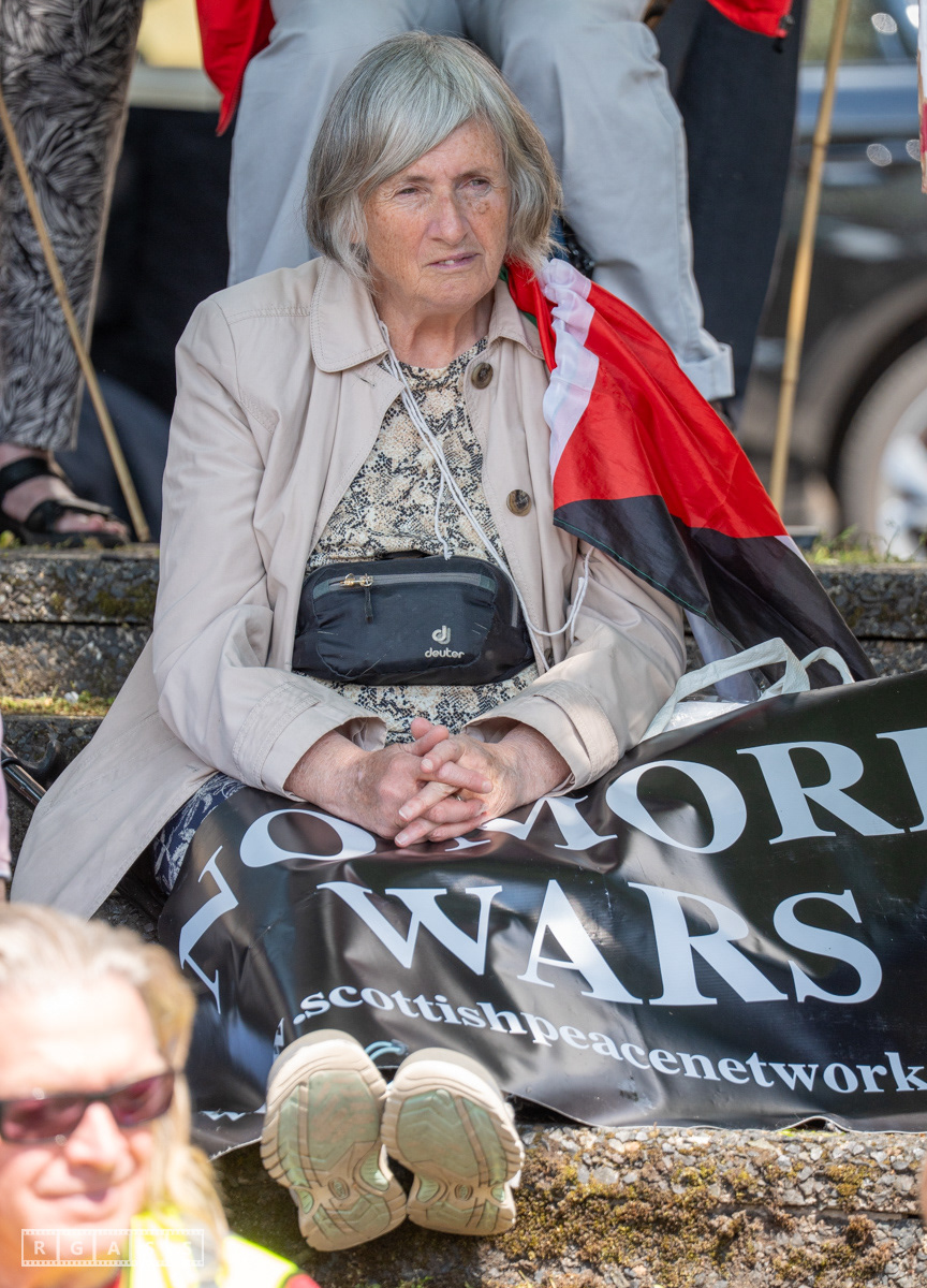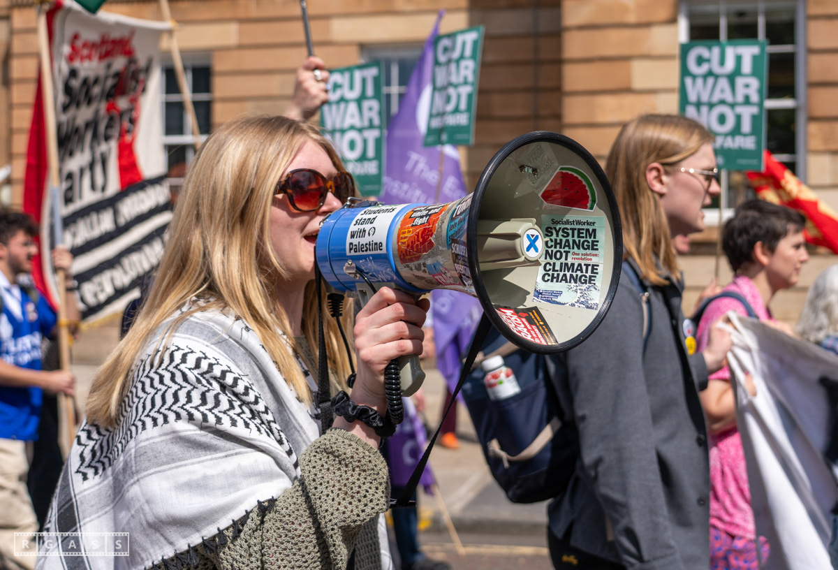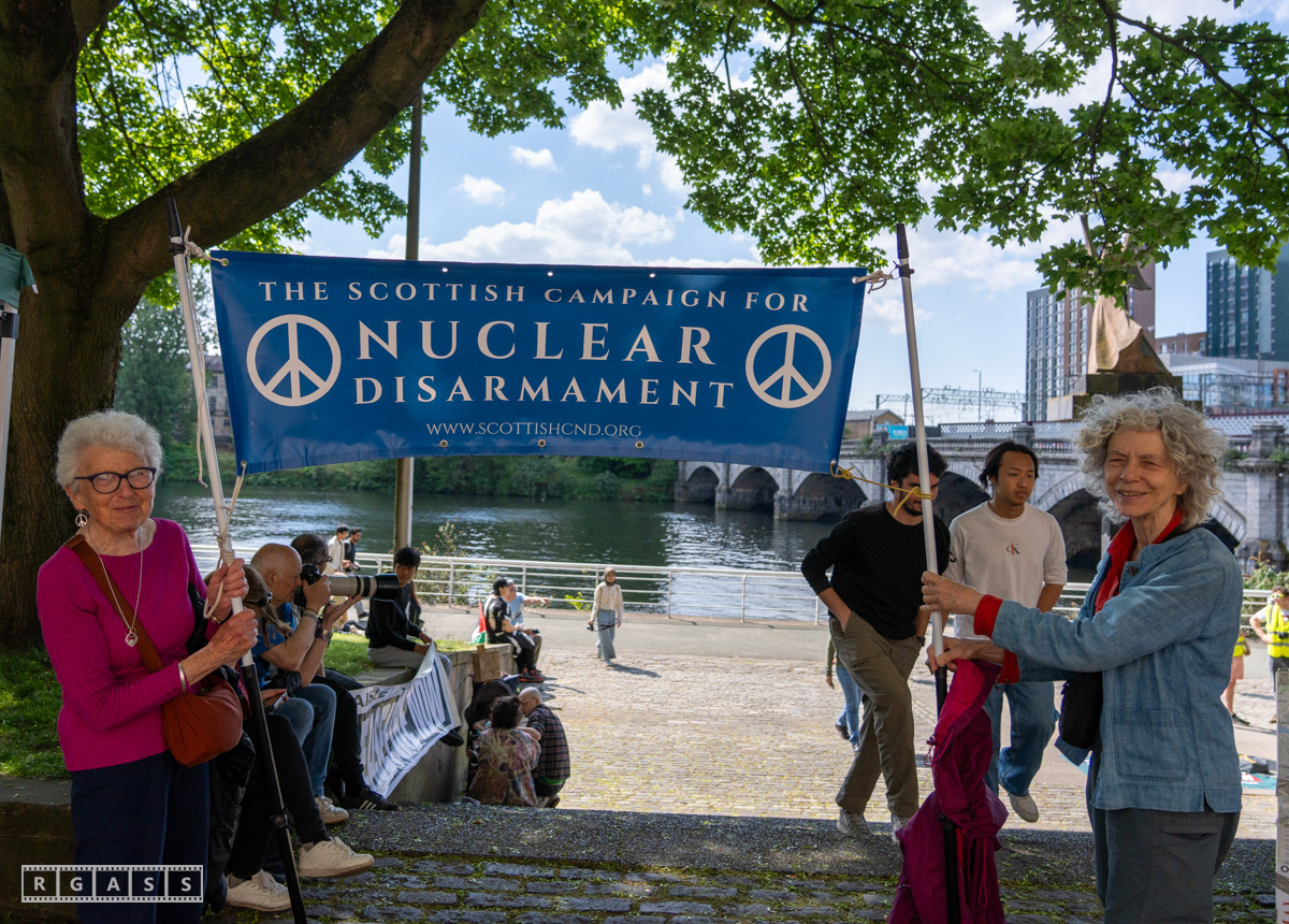 Glasgow, UK. 10 May 2025. Scottish CND and Glasgow Stop the War Coalition’s “Welfare Not Warfare” march and demonstration from the Buchannan Steps to La Pasionaria the Spanish civil war memorial.