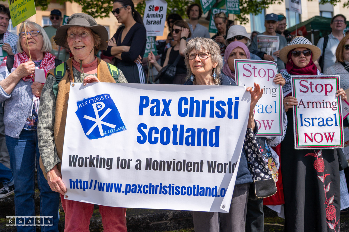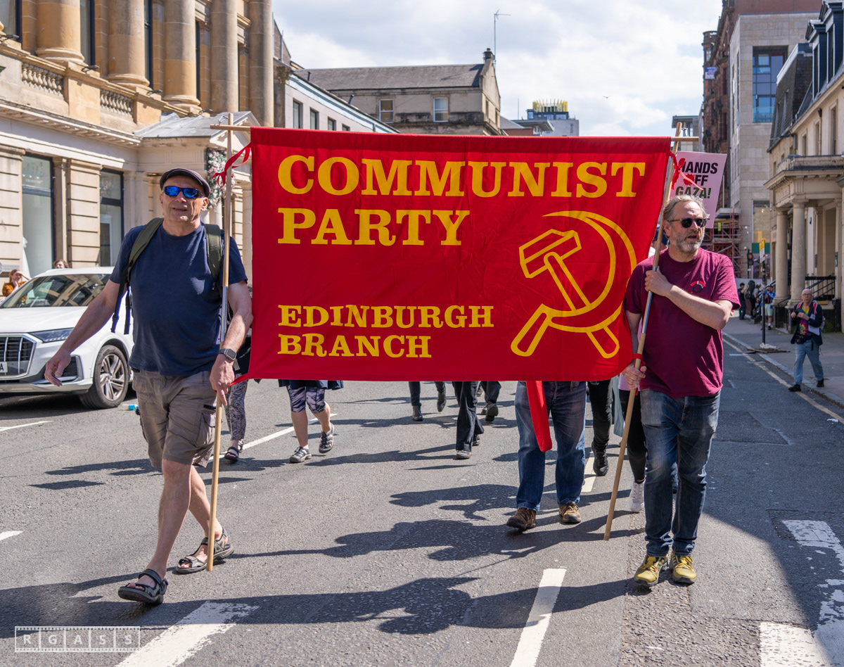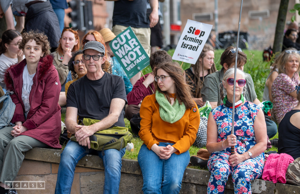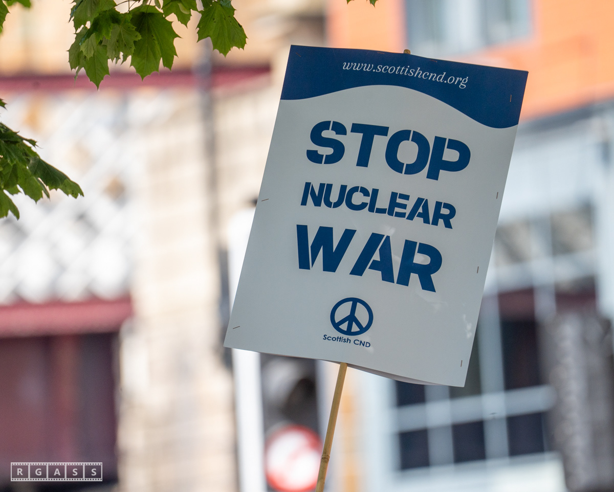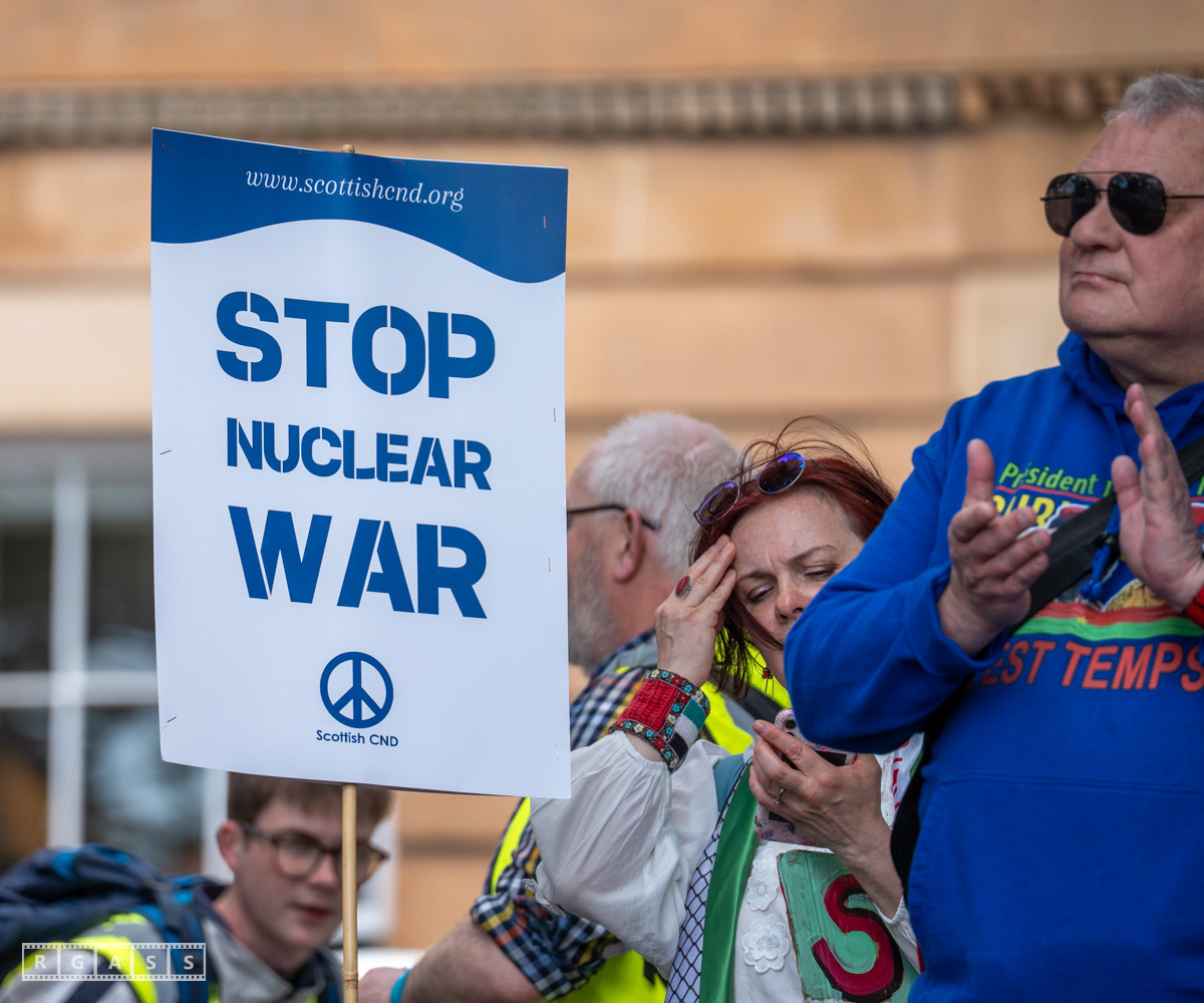 Glasgow, UK. 10 May 2025. Scottish CND and Glasgow Stop the War Coalition’s “Welfare Not Warfare” march and demonstration from the Buchannan Steps to La Pasionaria the Spanish civil war memorial.