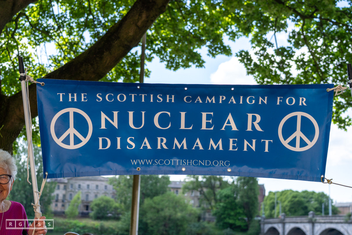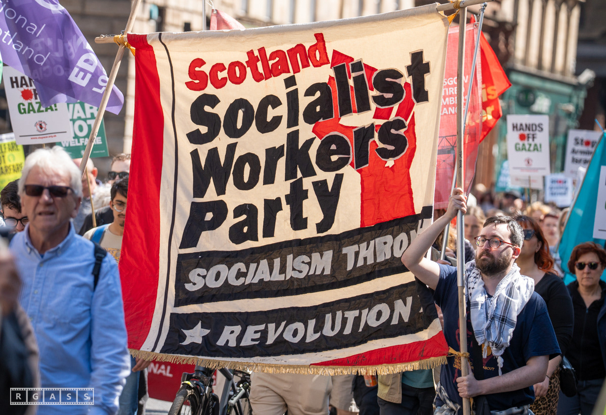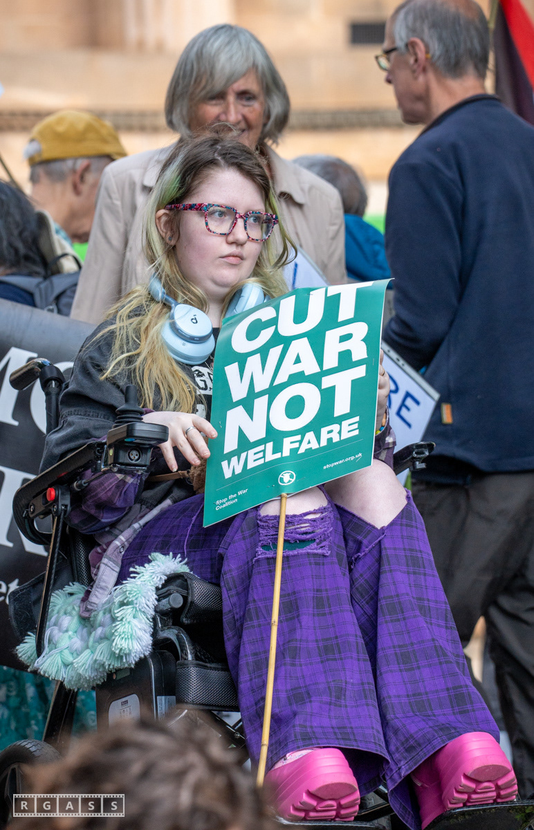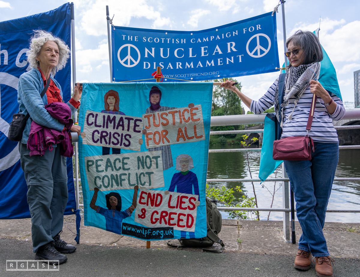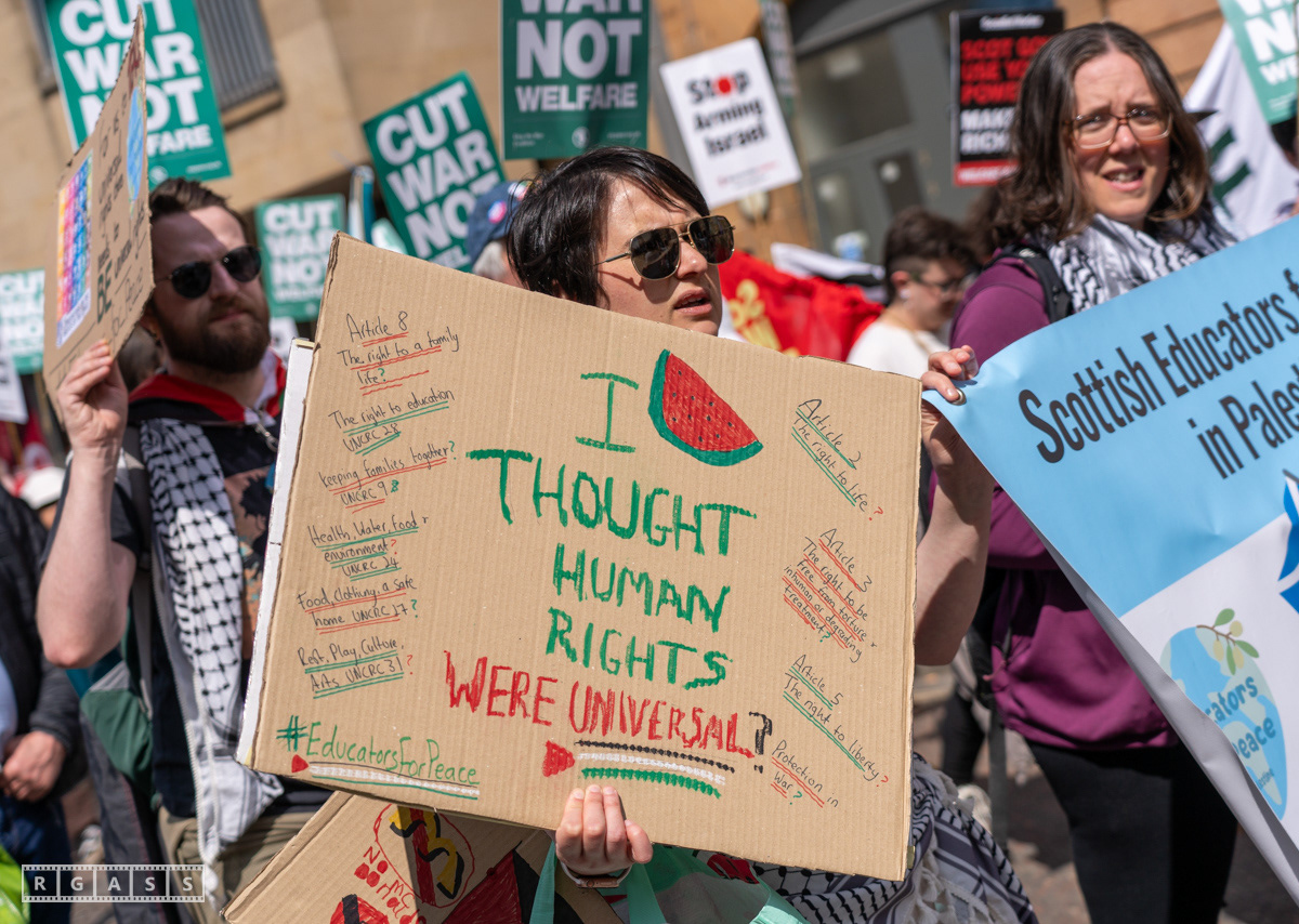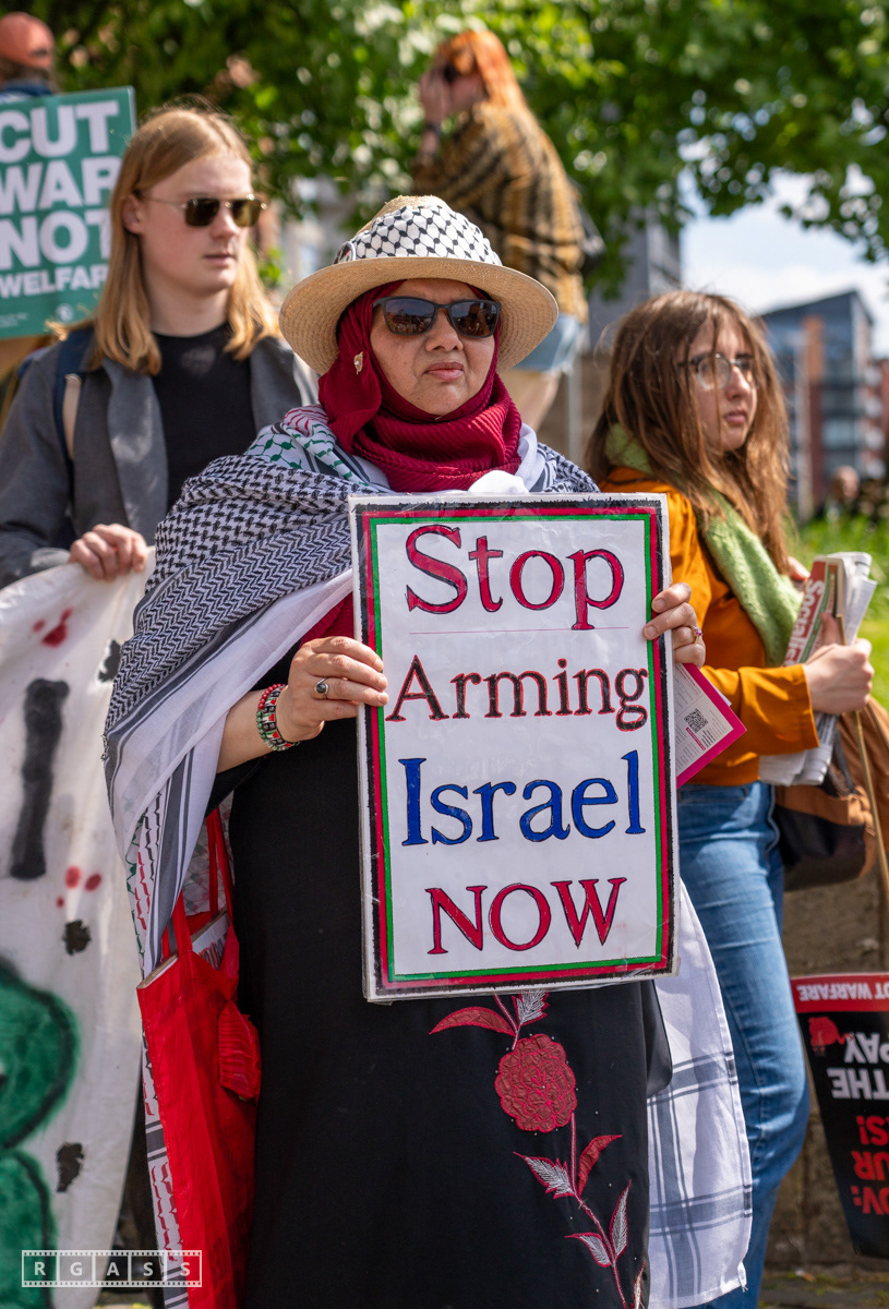 Glasgow, UK. 10 May 2025. Scottish CND and Glasgow Stop the War Coalition’s “Welfare Not Warfare” march and demonstration from the Buchannan Steps to La Pasionaria the Spanish civil war memorial.