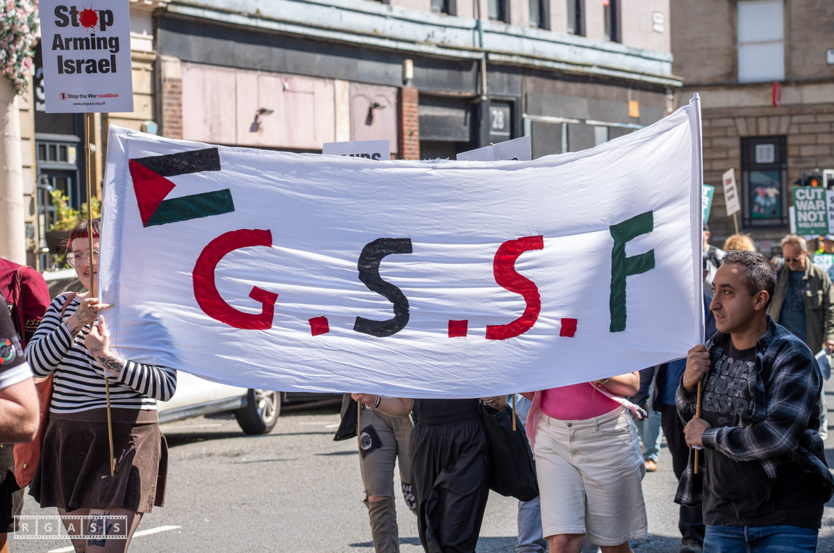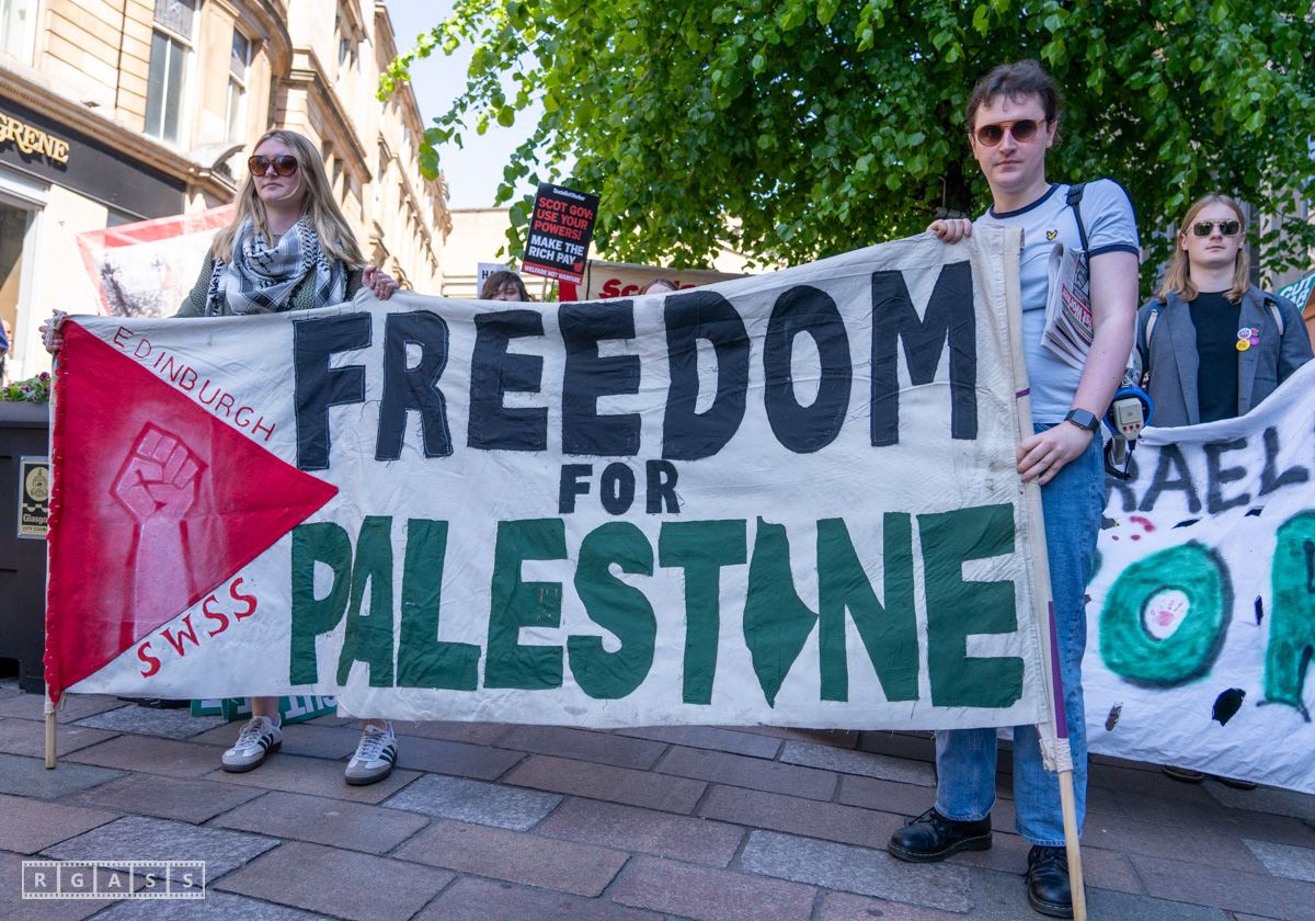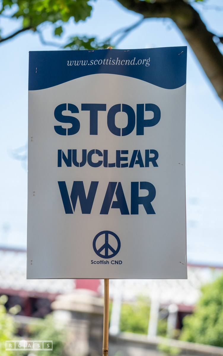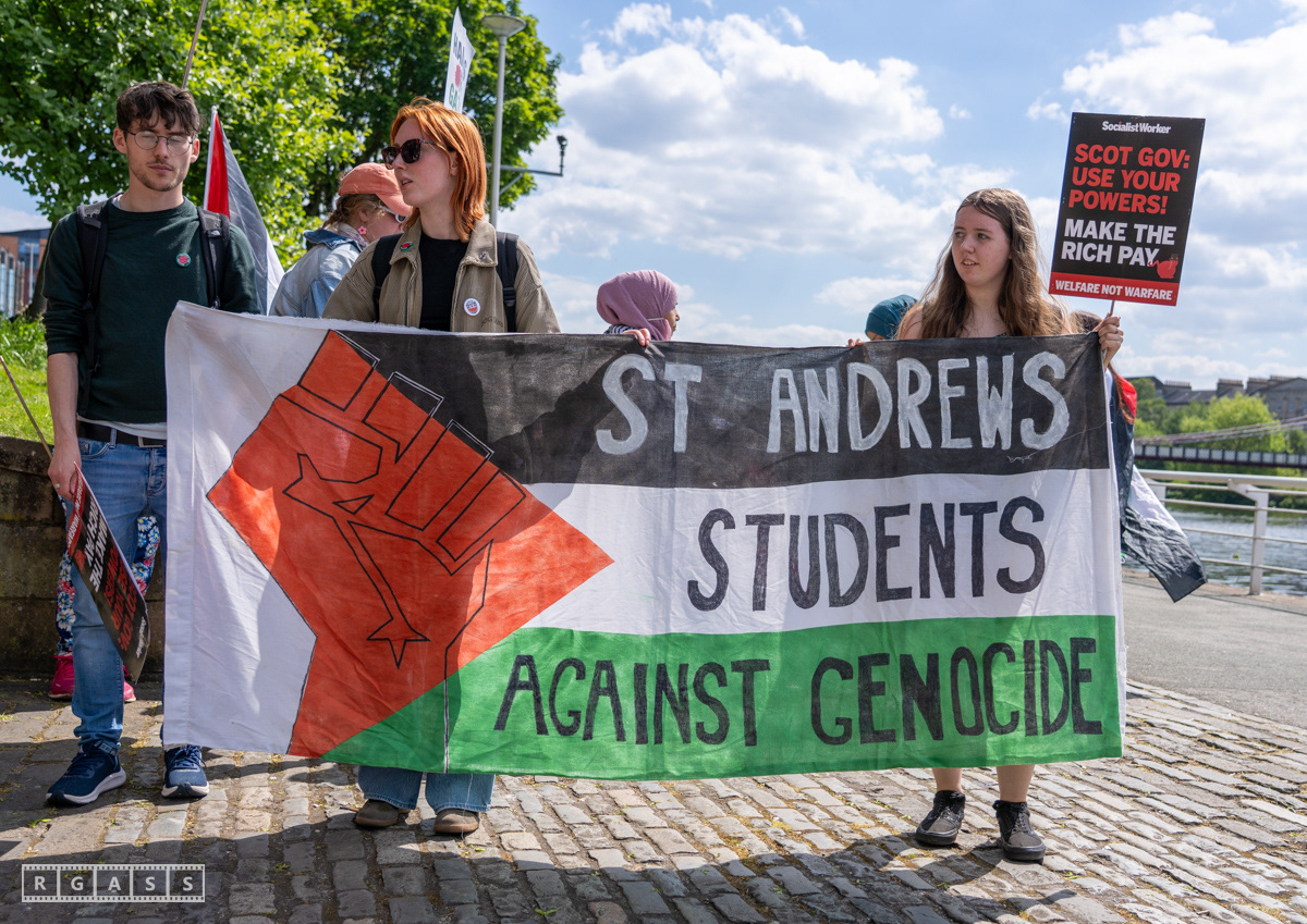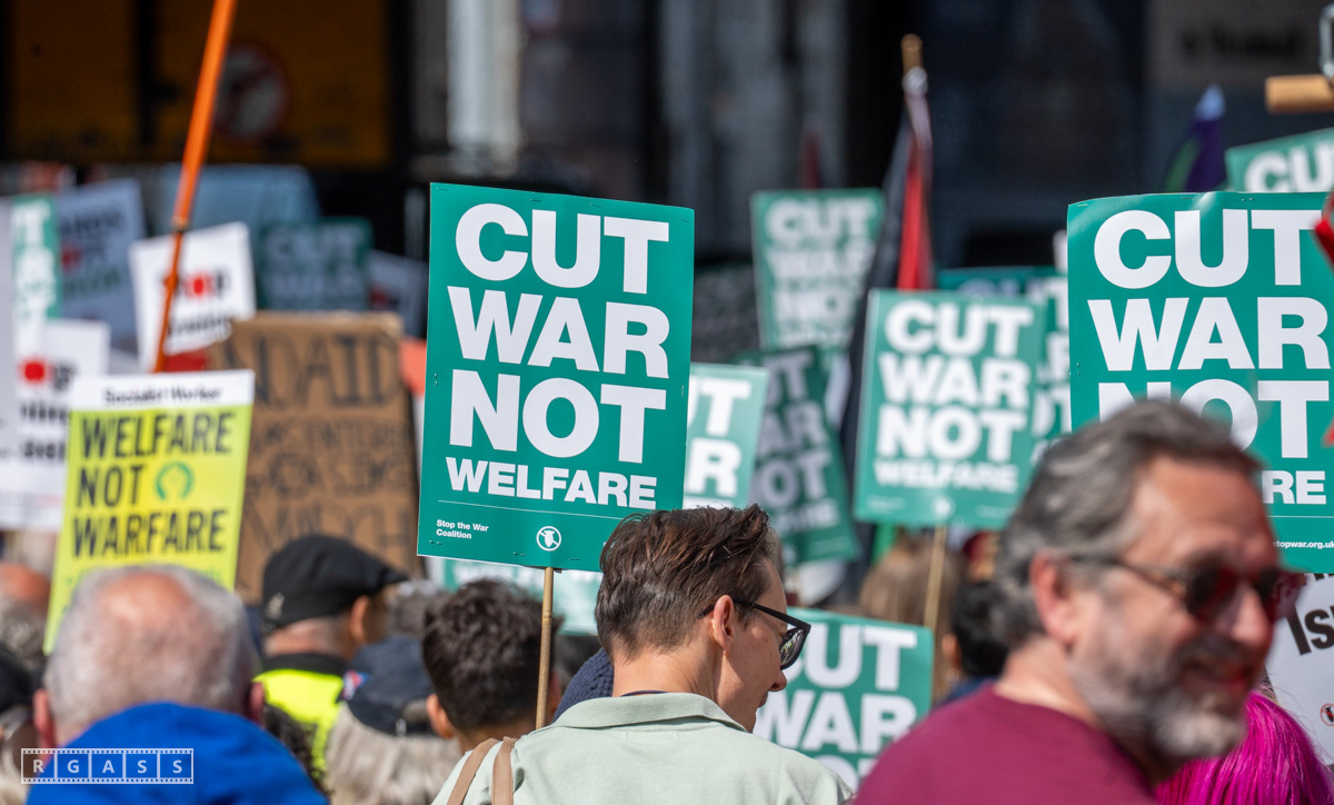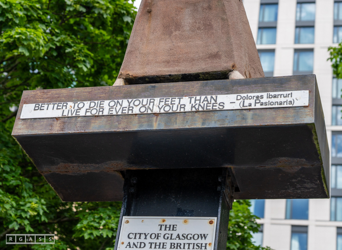 Glasgow, UK. 10 May 2025. Scottish CND and Glasgow Stop the War Coalition’s “Welfare Not Warfare” march and demonstration from the Buchannan Steps to La Pasionaria the Spanish civil war memorial.