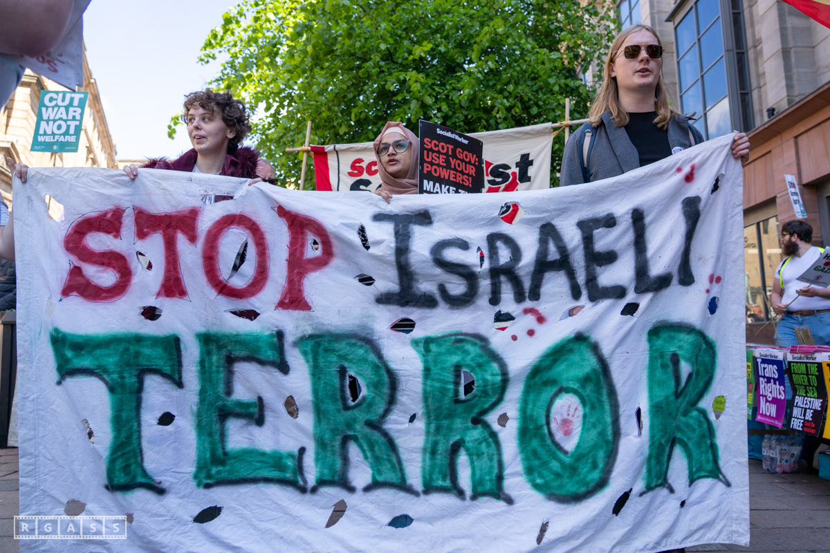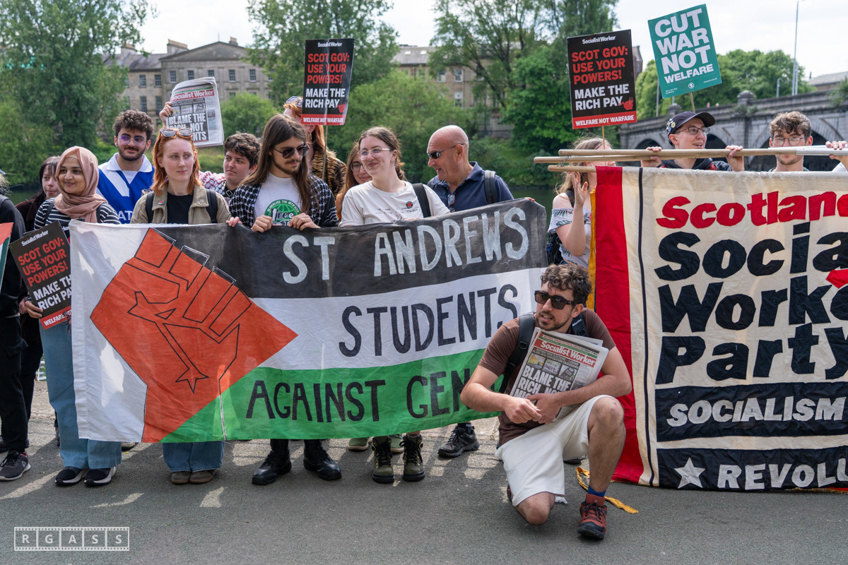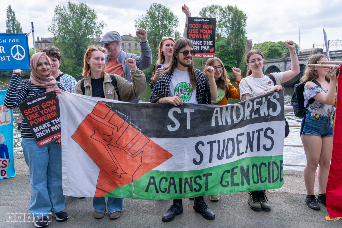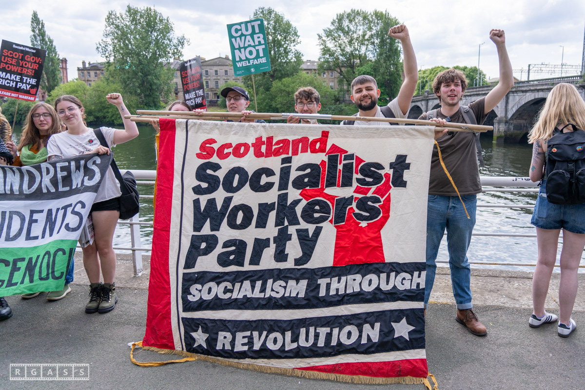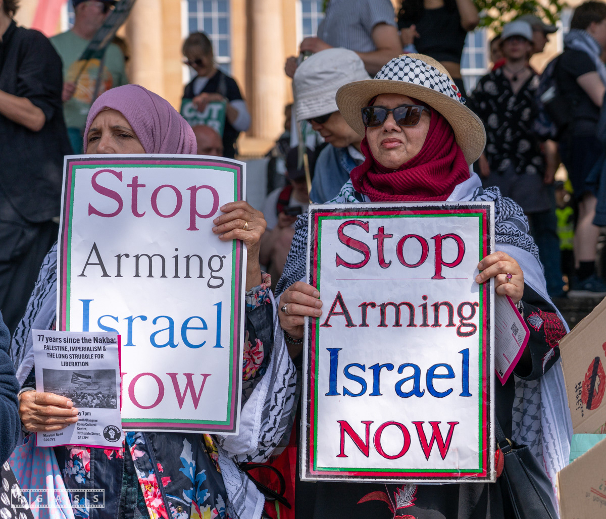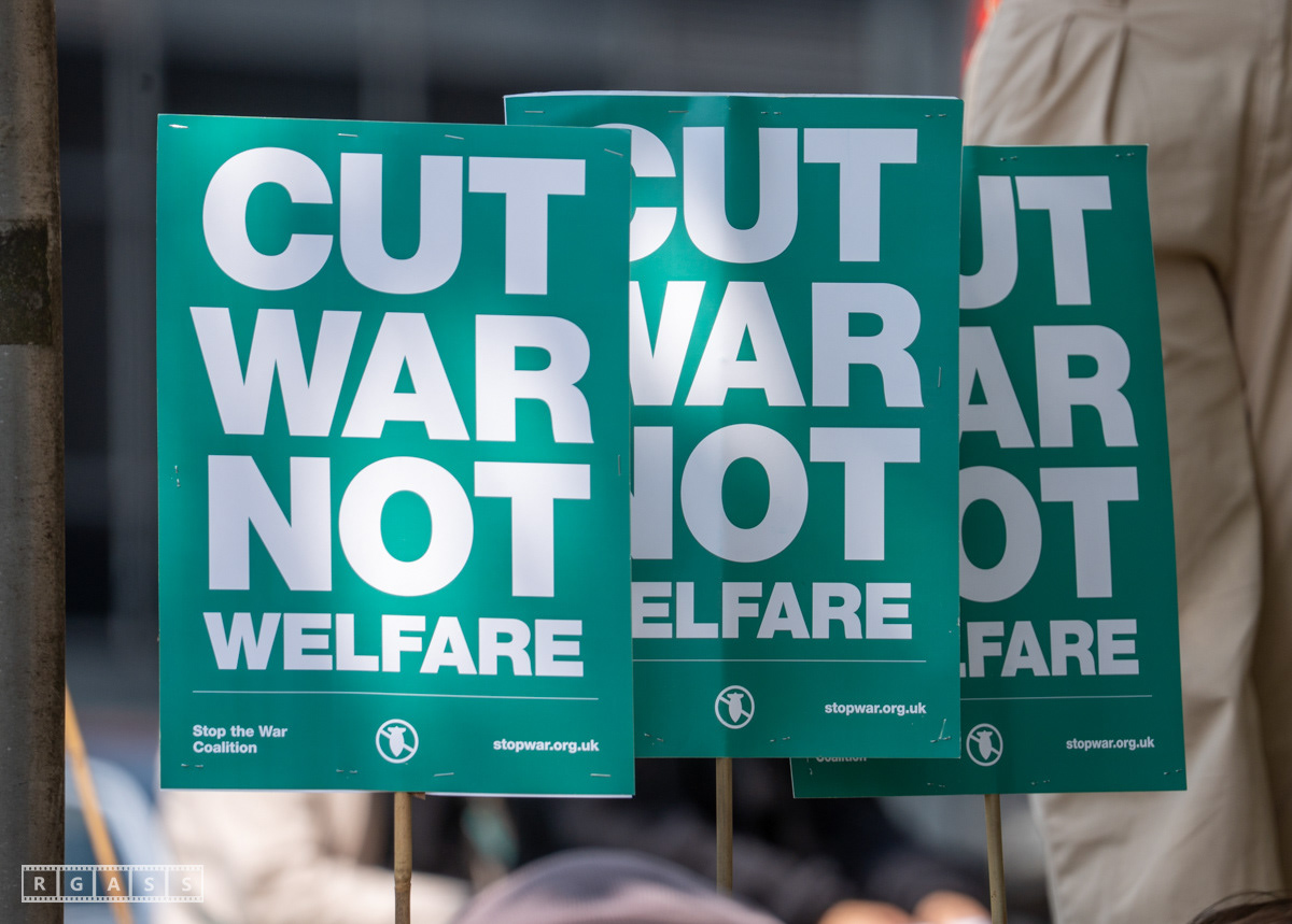 Glasgow, UK. 10 May 2025. Scottish CND and Glasgow Stop the War Coalition’s “Welfare Not Warfare” march and demonstration from the Buchannan Steps to La Pasionaria the Spanish civil war memorial.